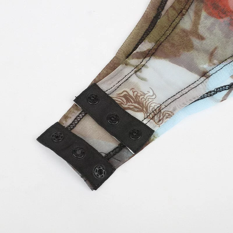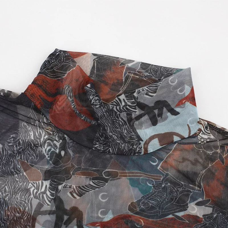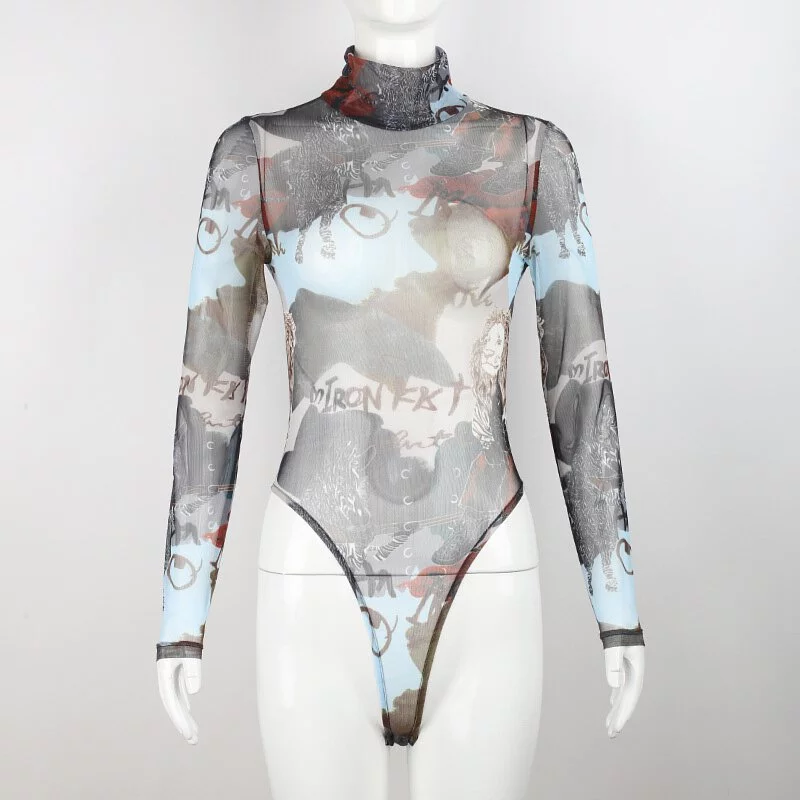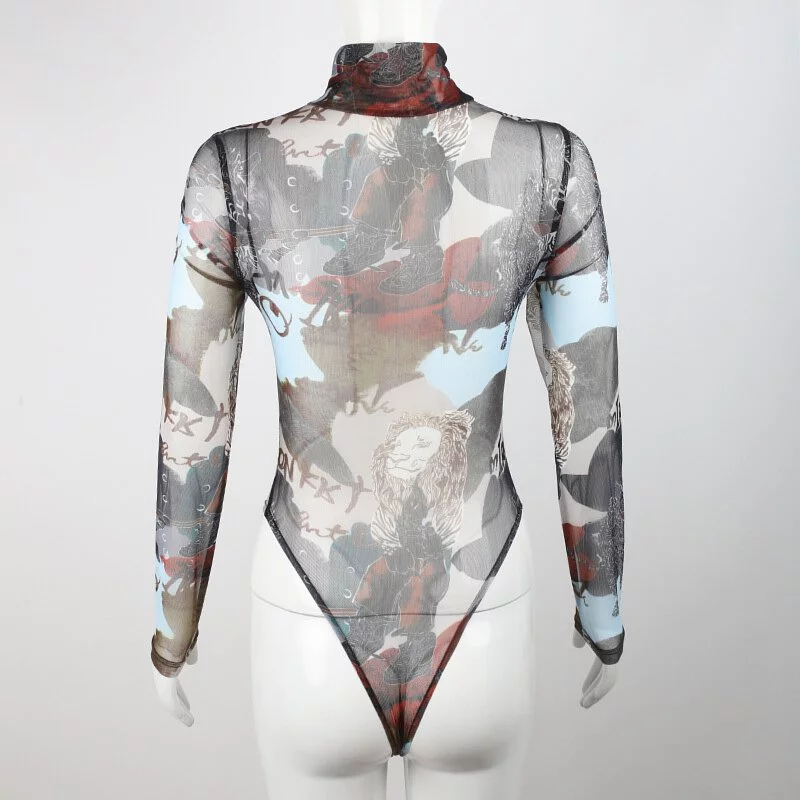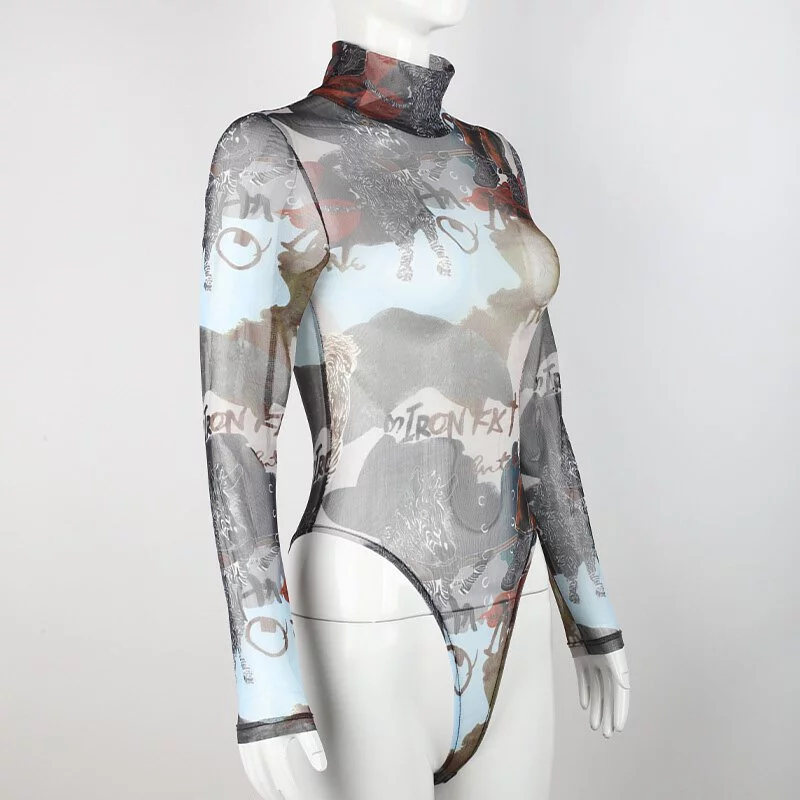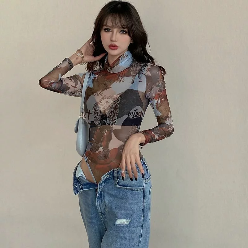 Áo Bodysuit lưới dài tay cổ lọ họa tiết nâu