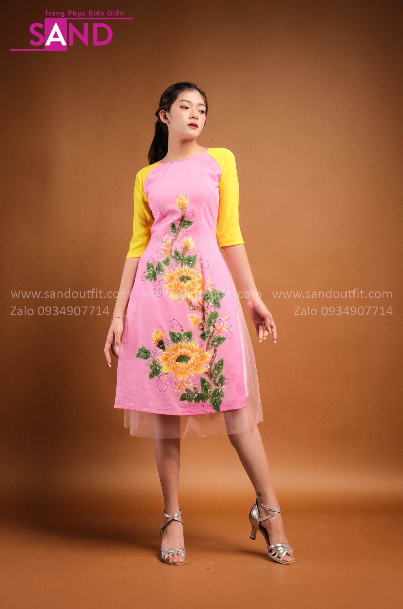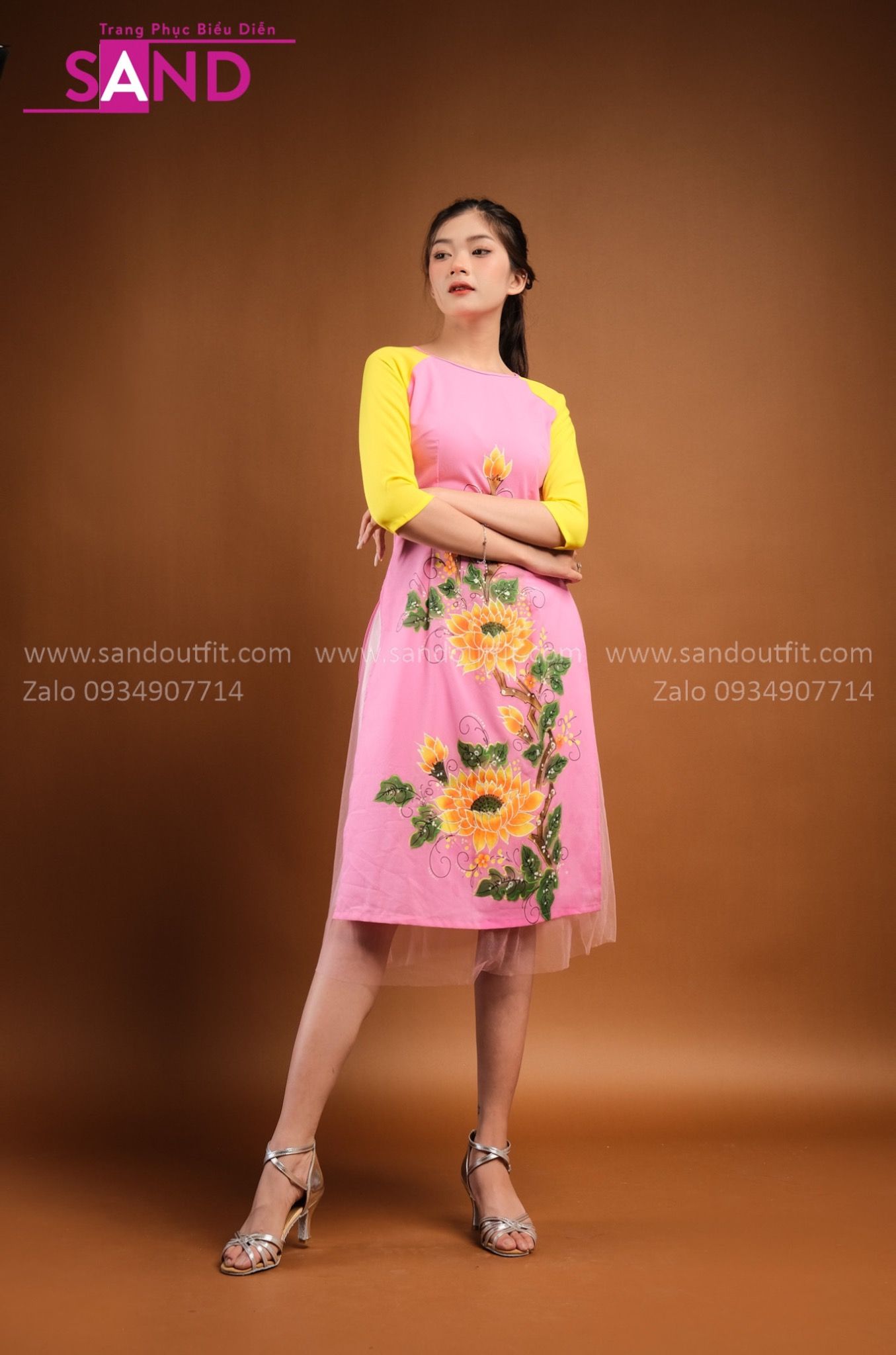 TAC0507 Áo Dài Cách Tân Họa Họa Tiết Hồng Vàng
