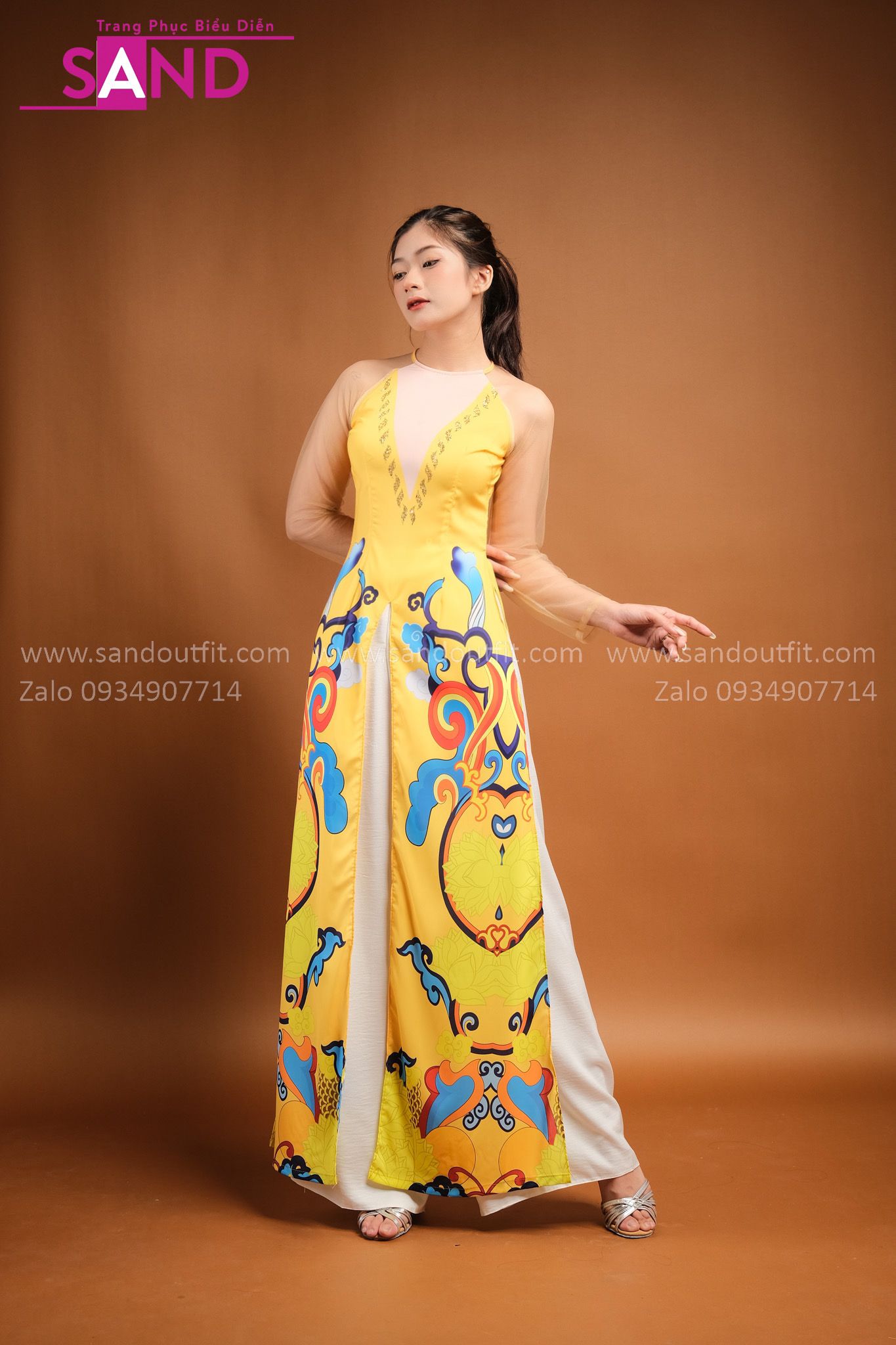 TAC0308 Áo Dài Cách Tân Họa Tiết Hoa Văn Vàng