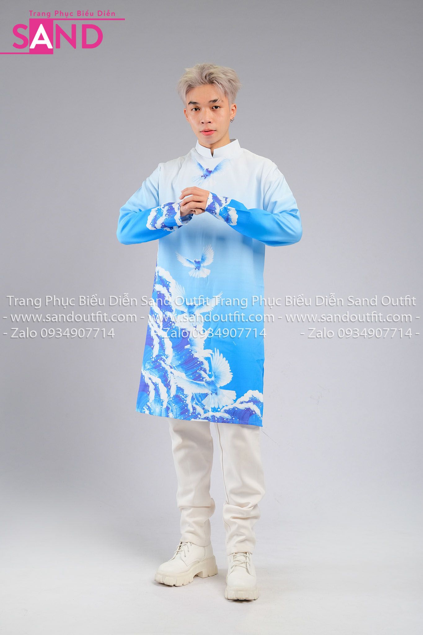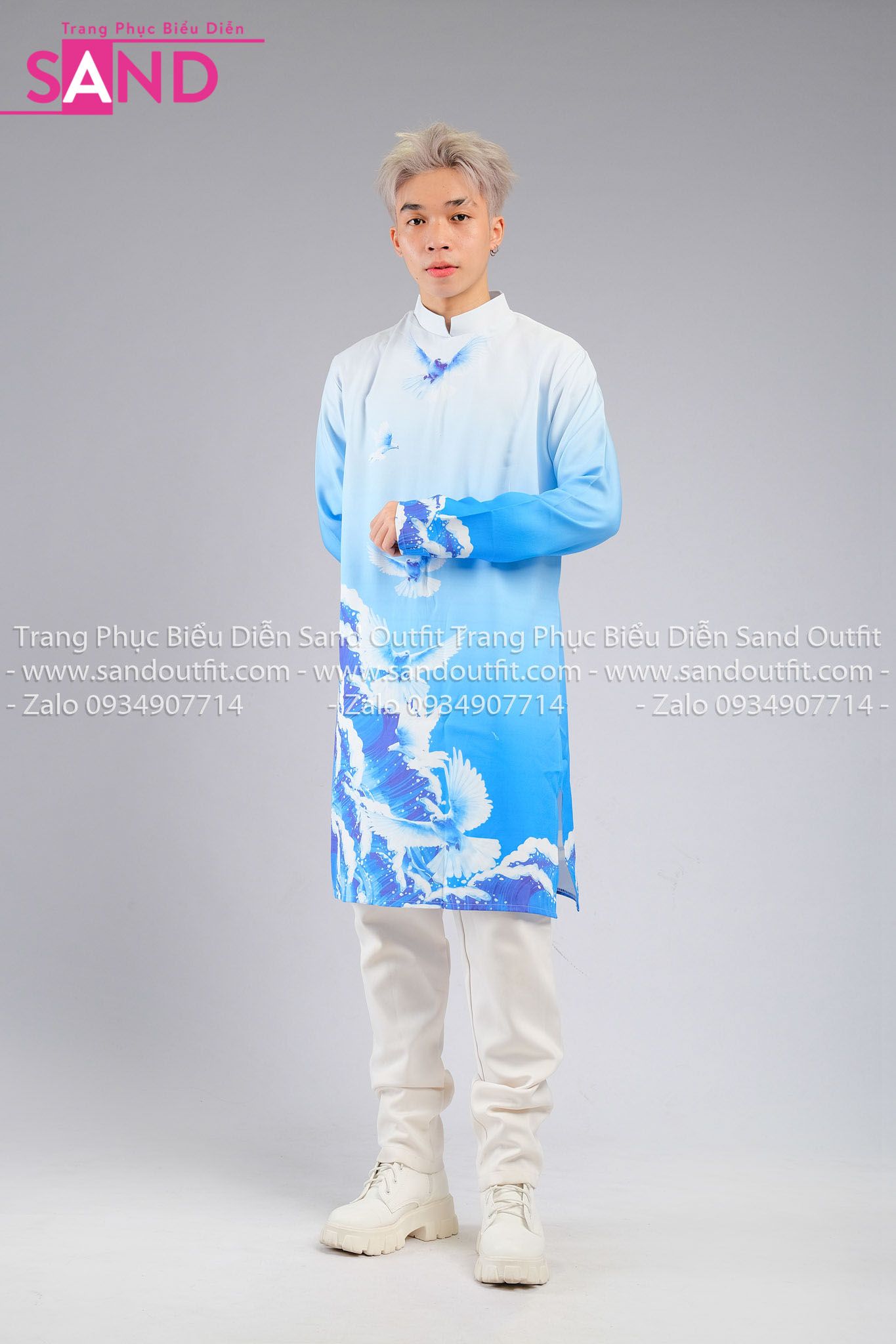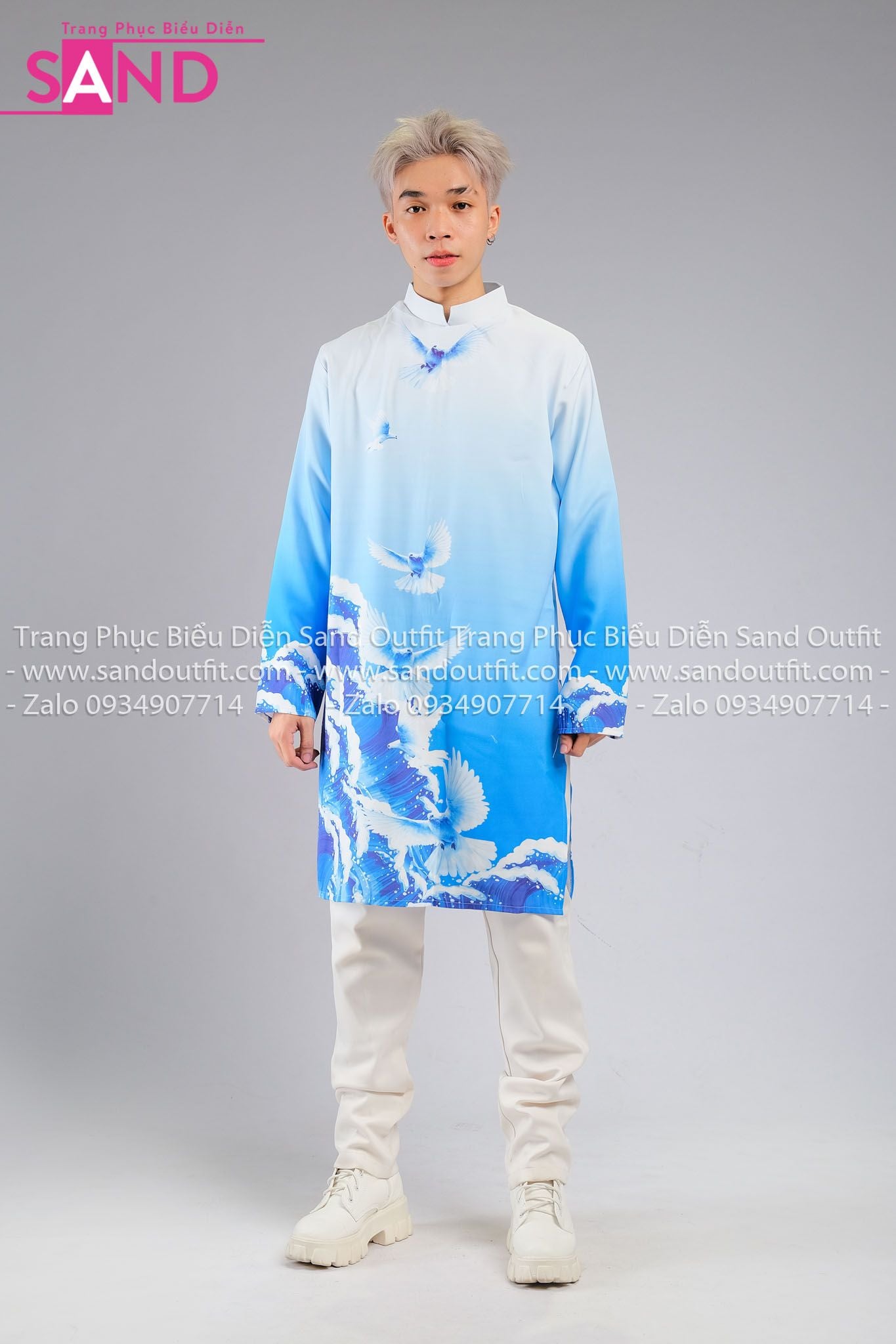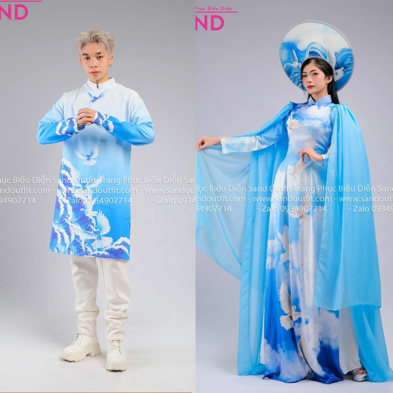 TAD0805 Áo Dài Nam Cách Tân Xanh Họa Tiết Chim Bồ Câu