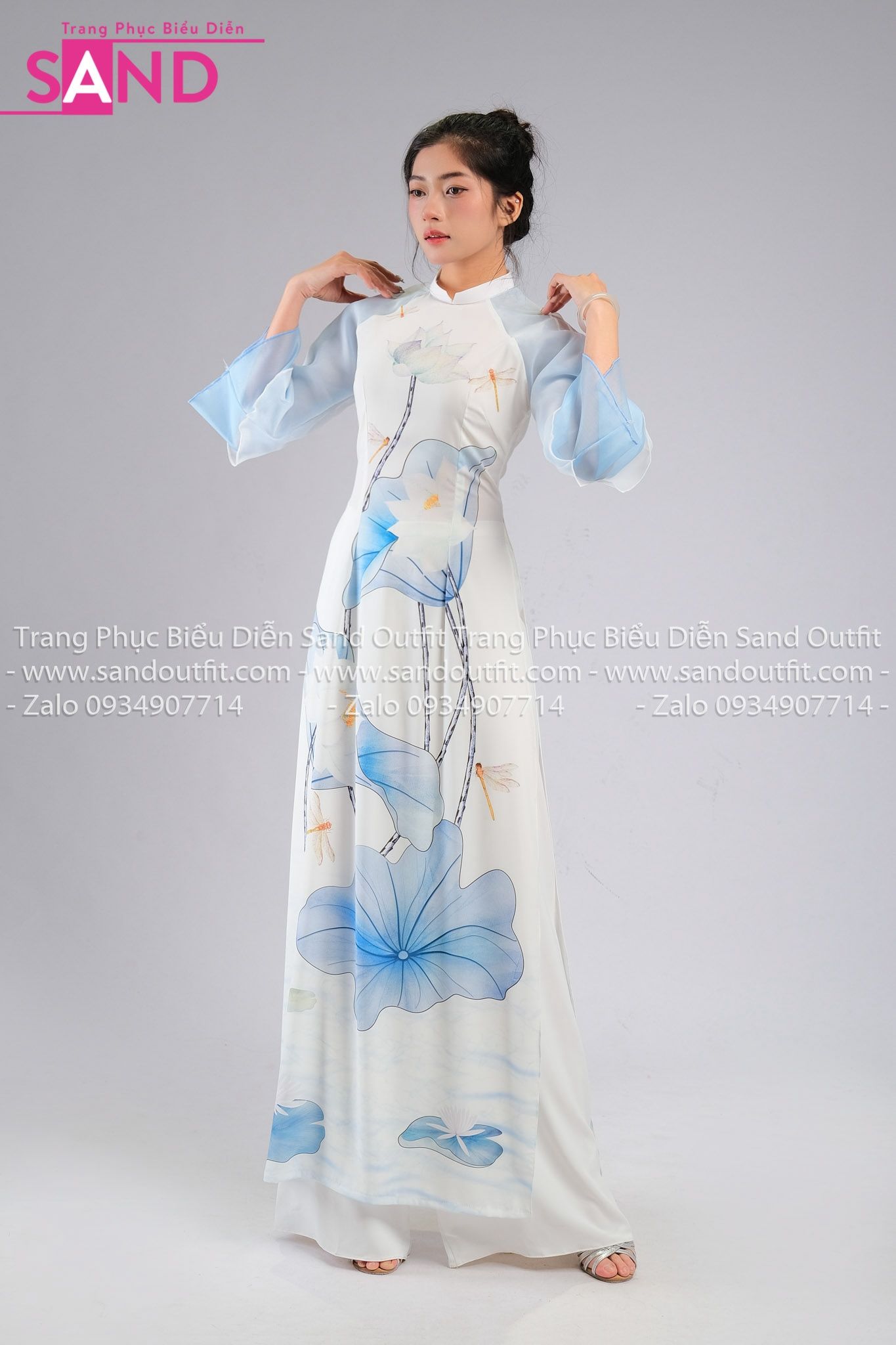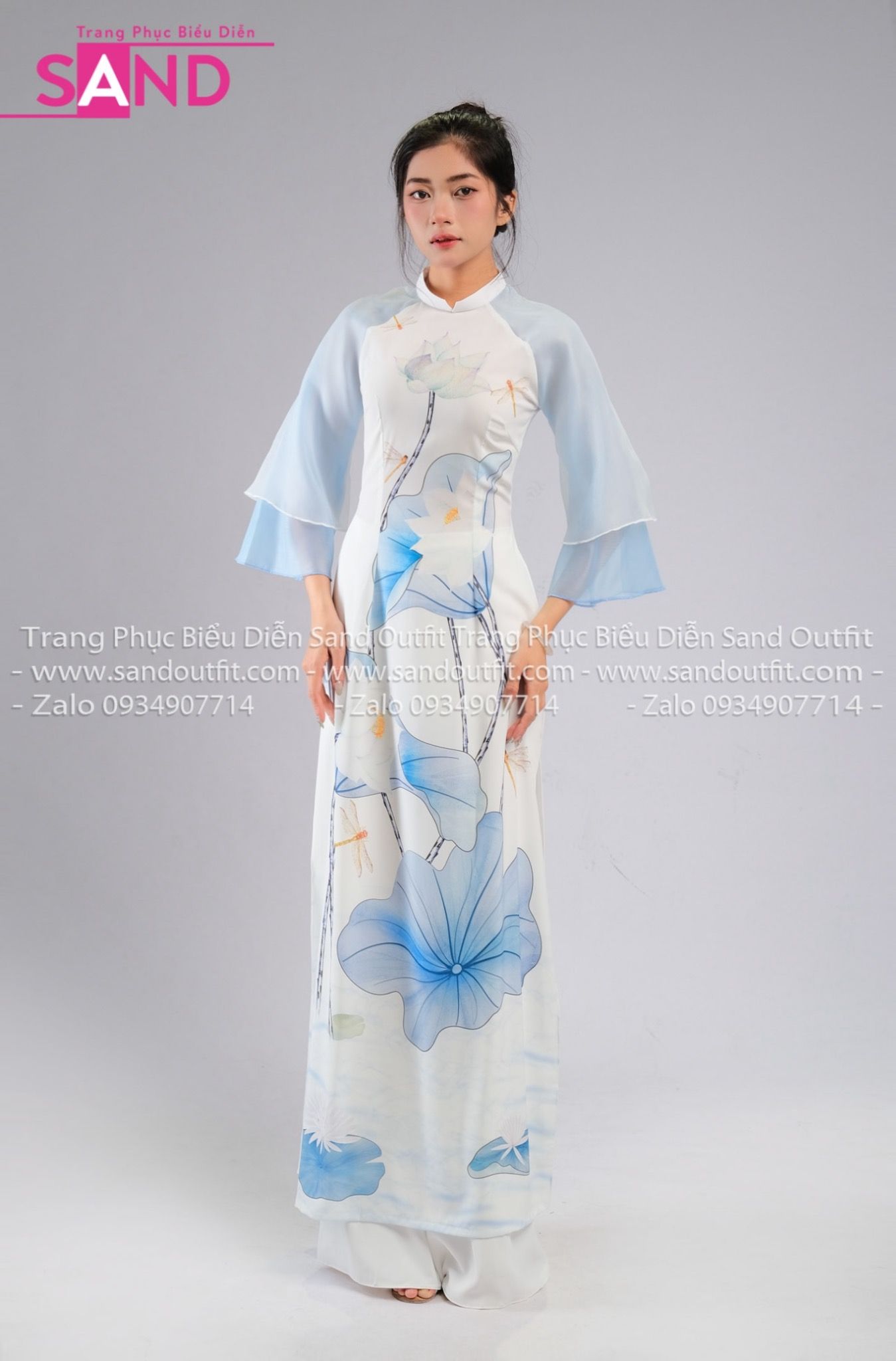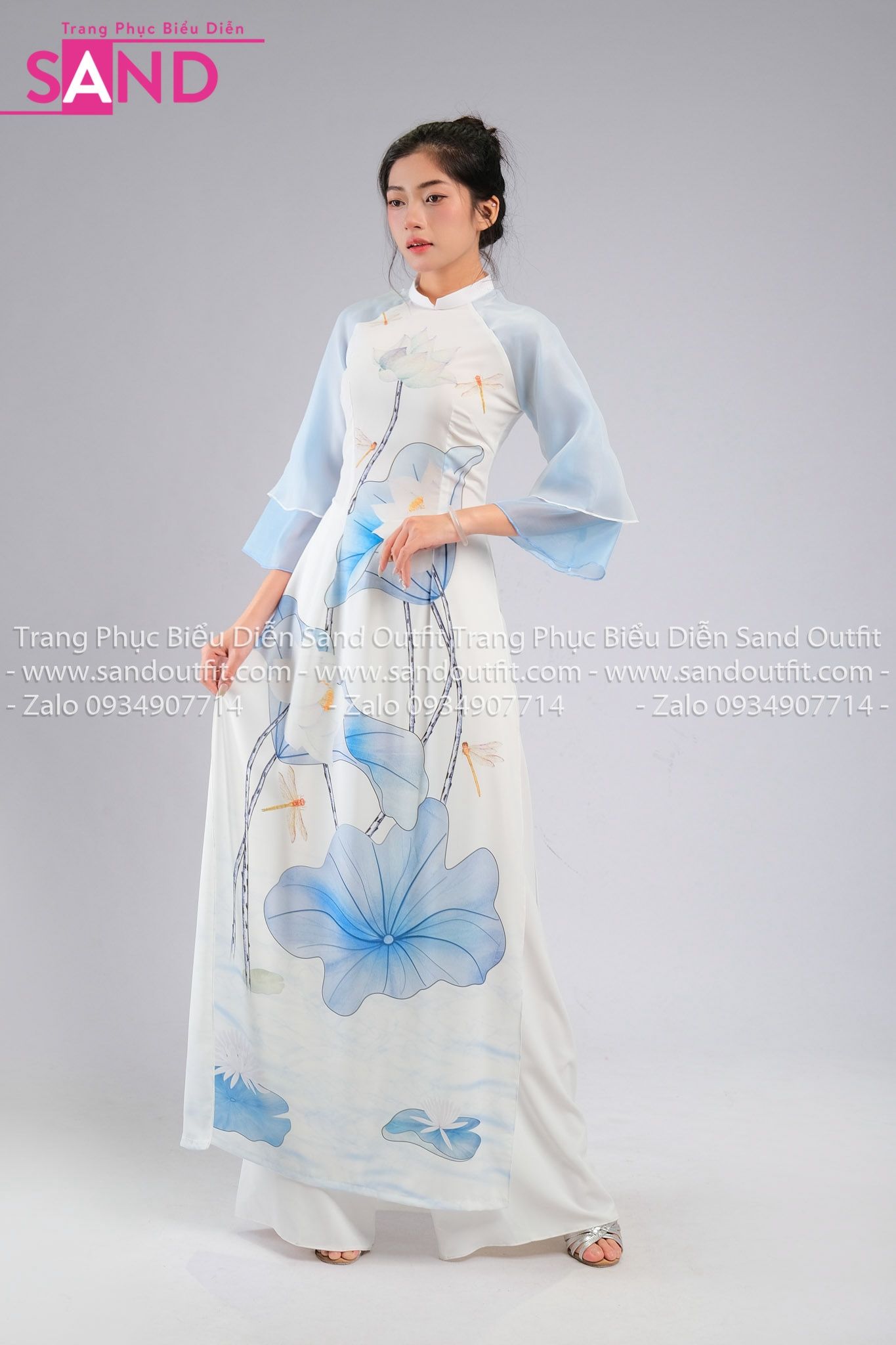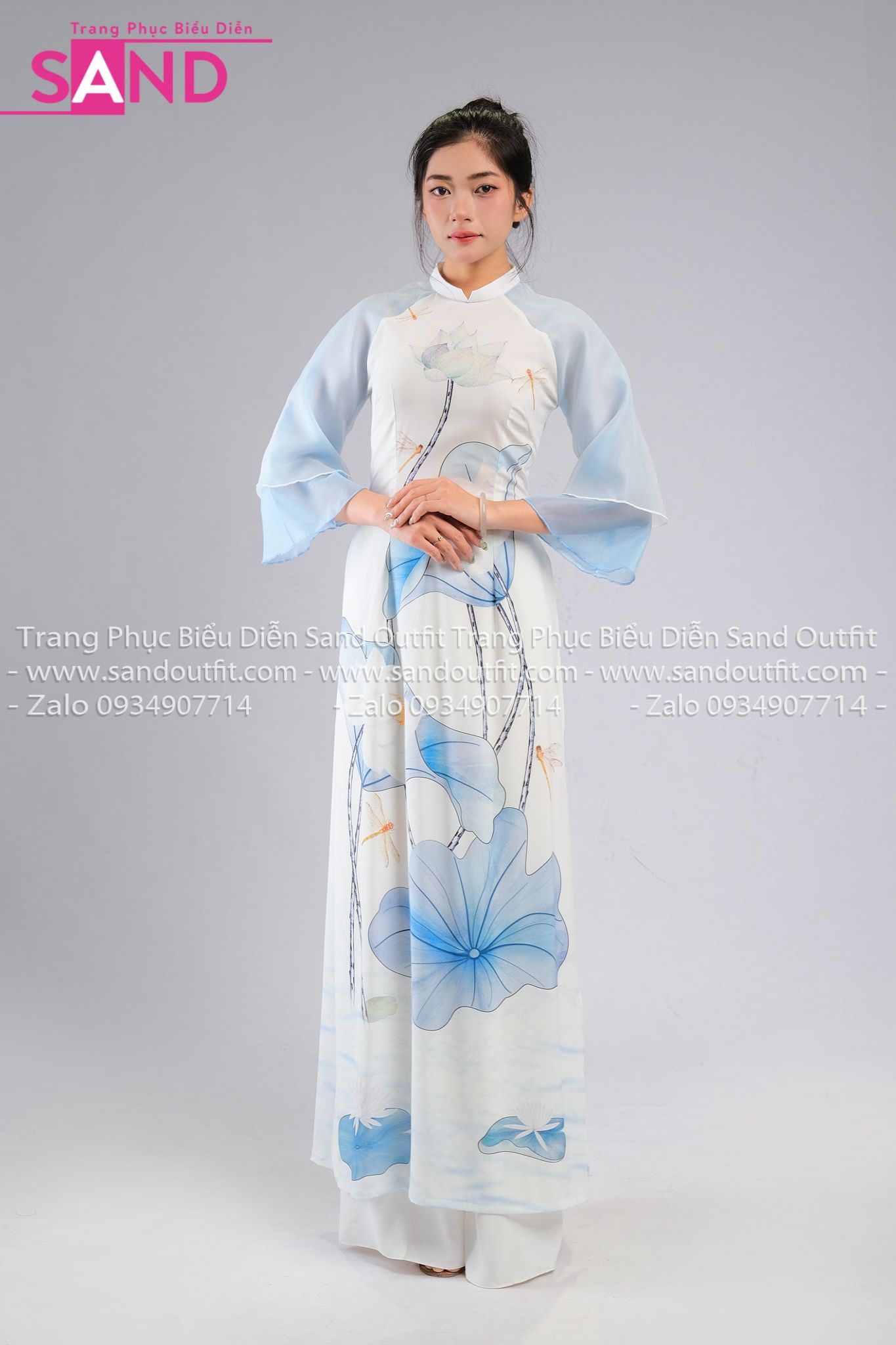 TAC0017 Áo Dài Trắng Sen Xanh Tay Voan Cánh Tiên - Nữ