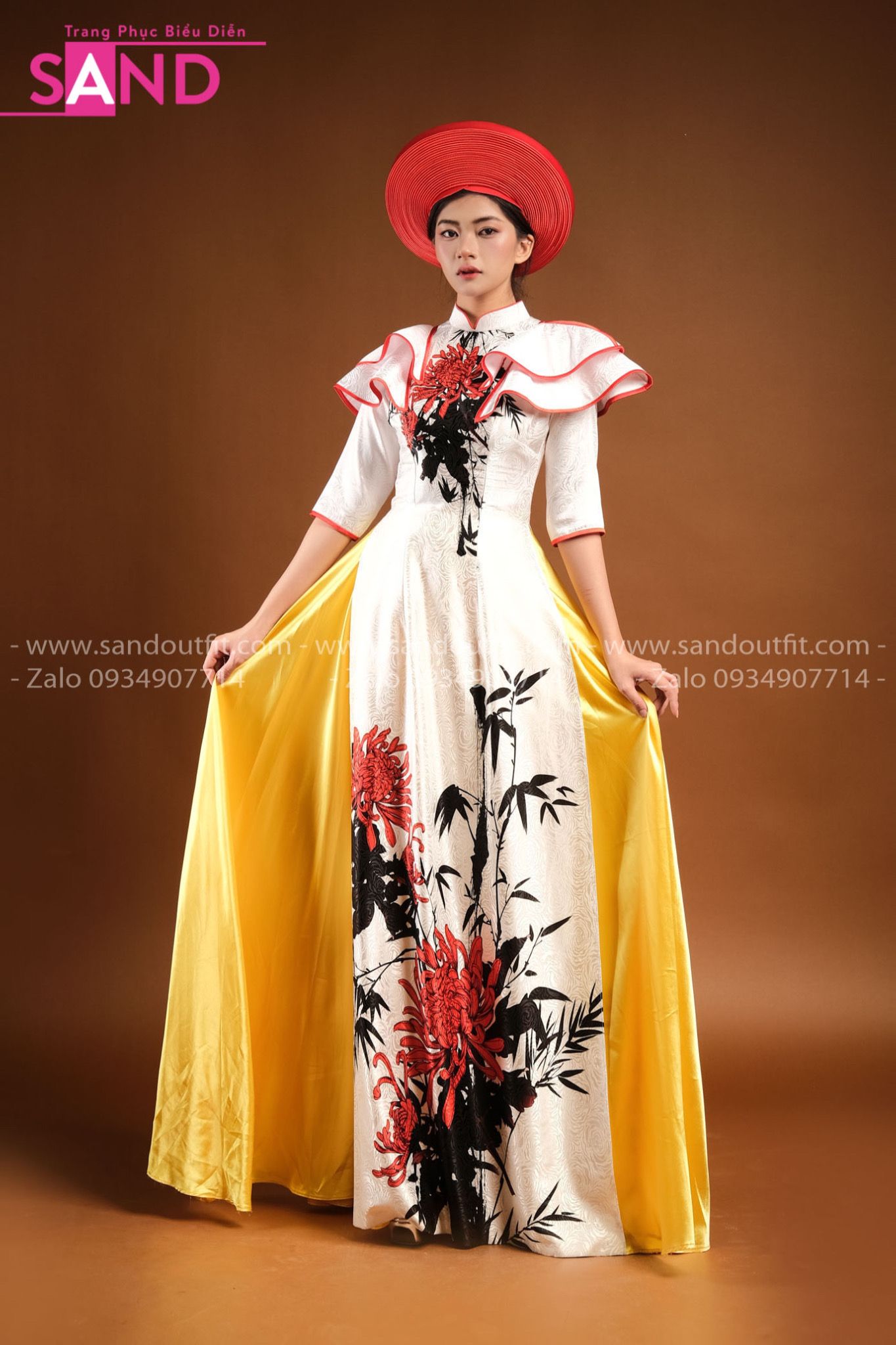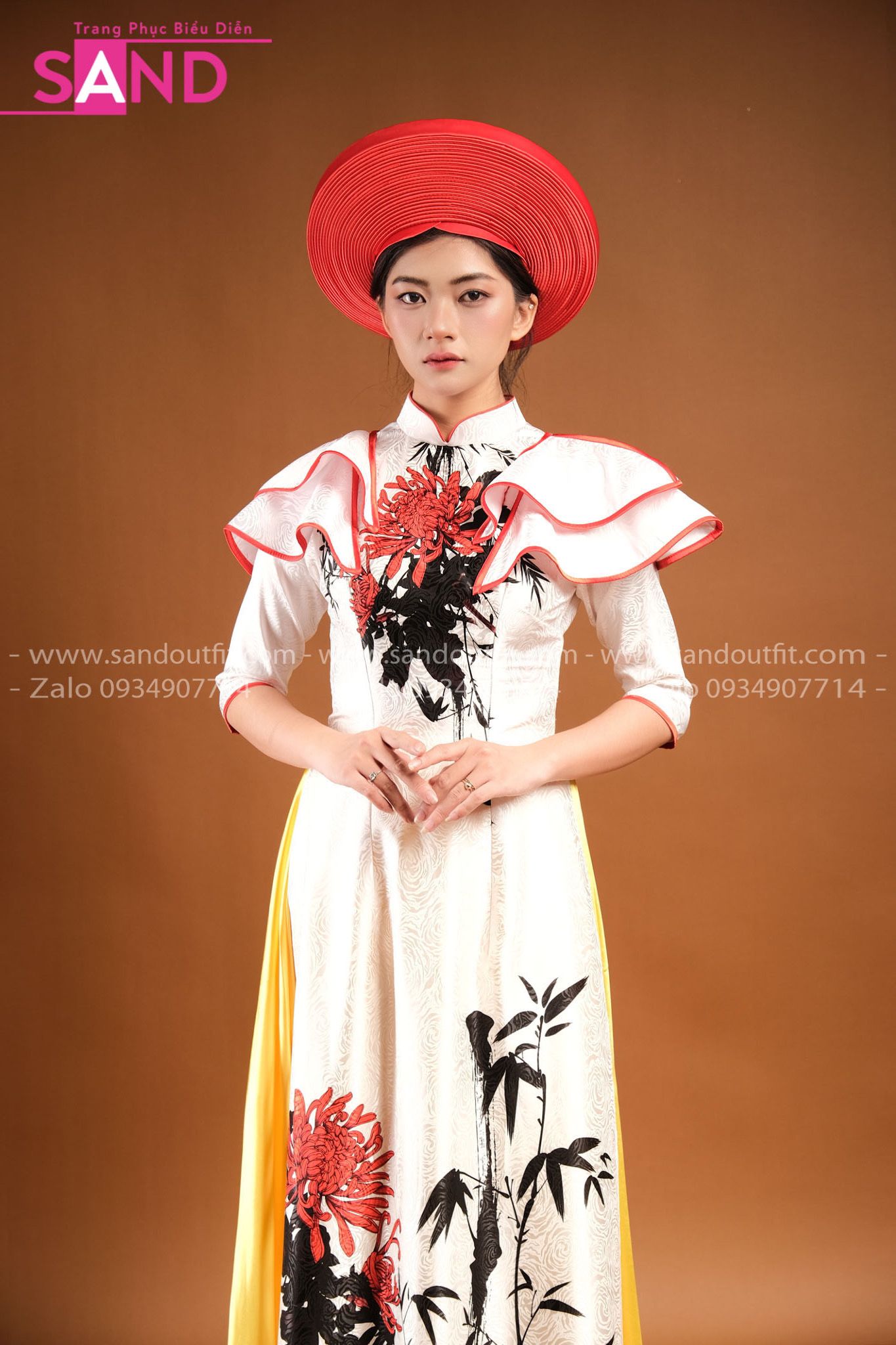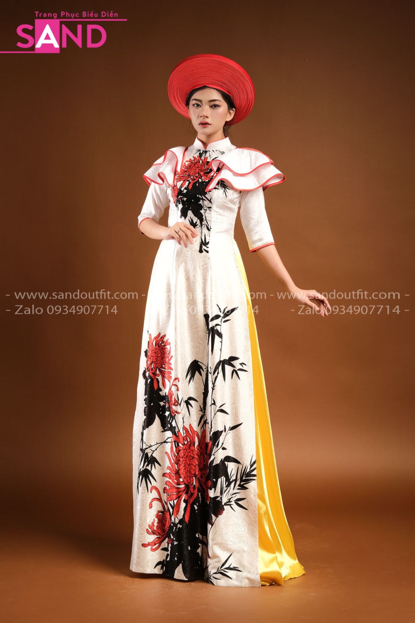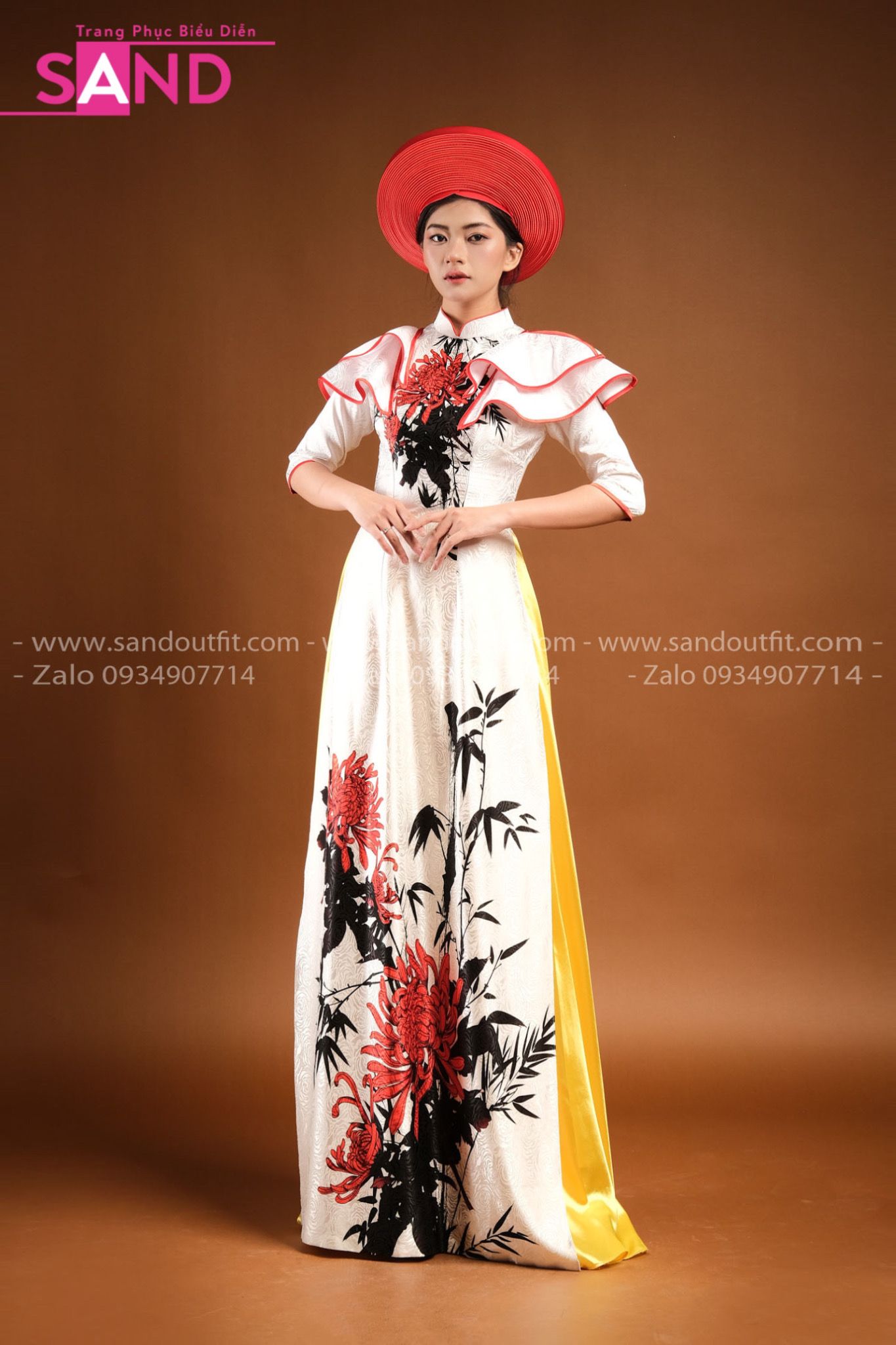 TAE0006 Áo Dài Thiết Kế Hoạ Tiết Hoa Đỏ - Màu Trắng ( KÈM MẤN )