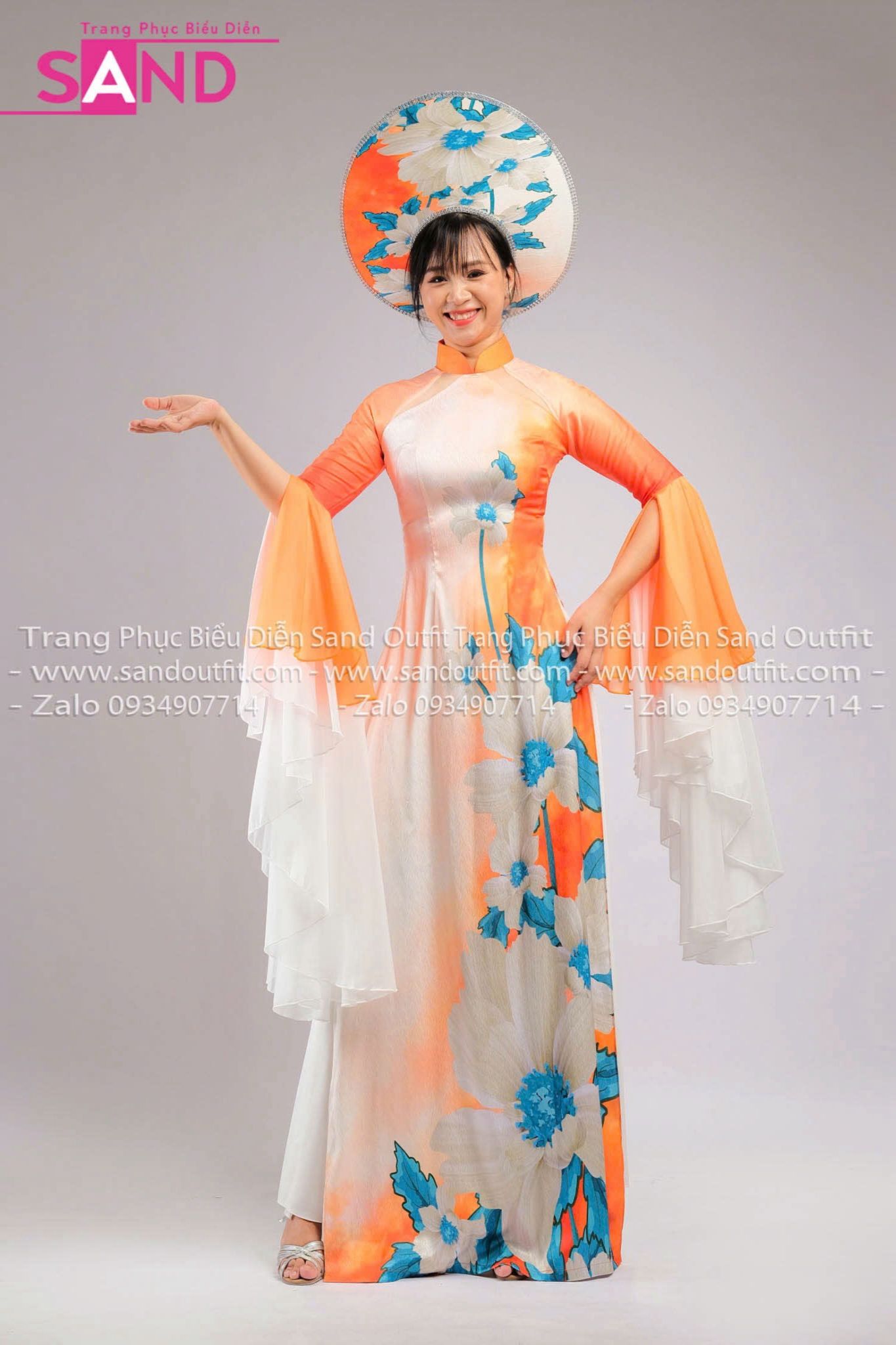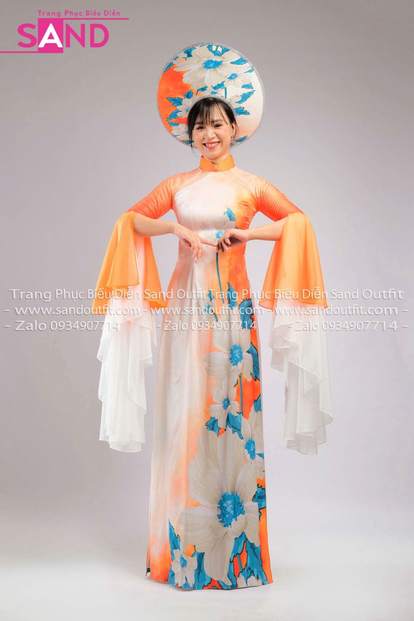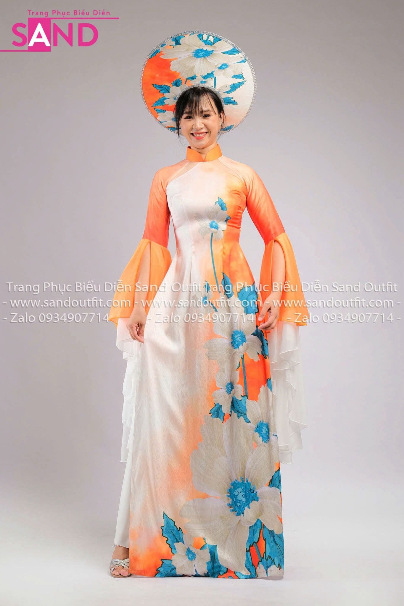 TAE0601 Áo Dài Thiết Kế Tay Voan Xoè Hoạ Tiết Hoa Trắng - Màu Cam ( KÈM MẤN )