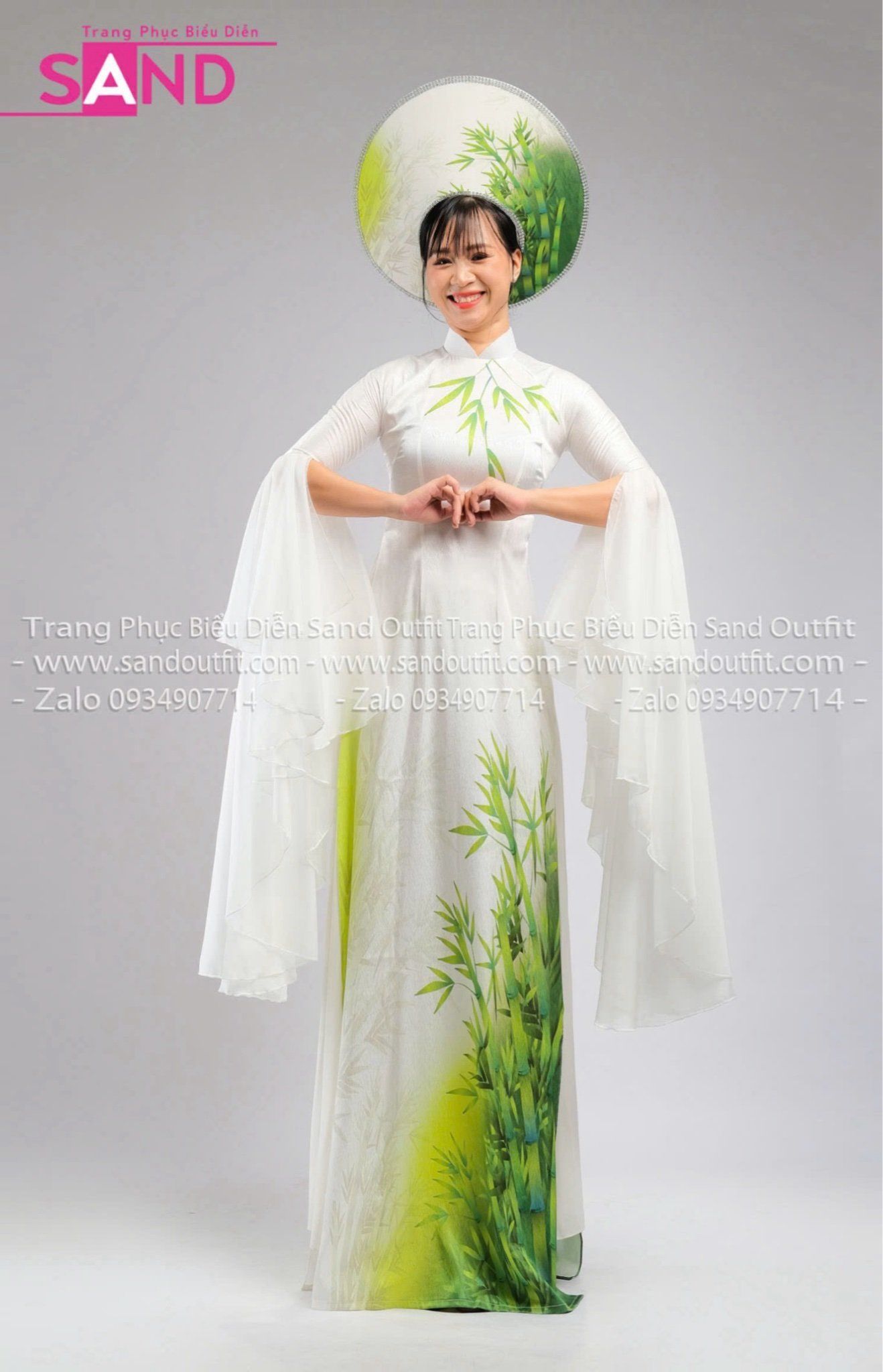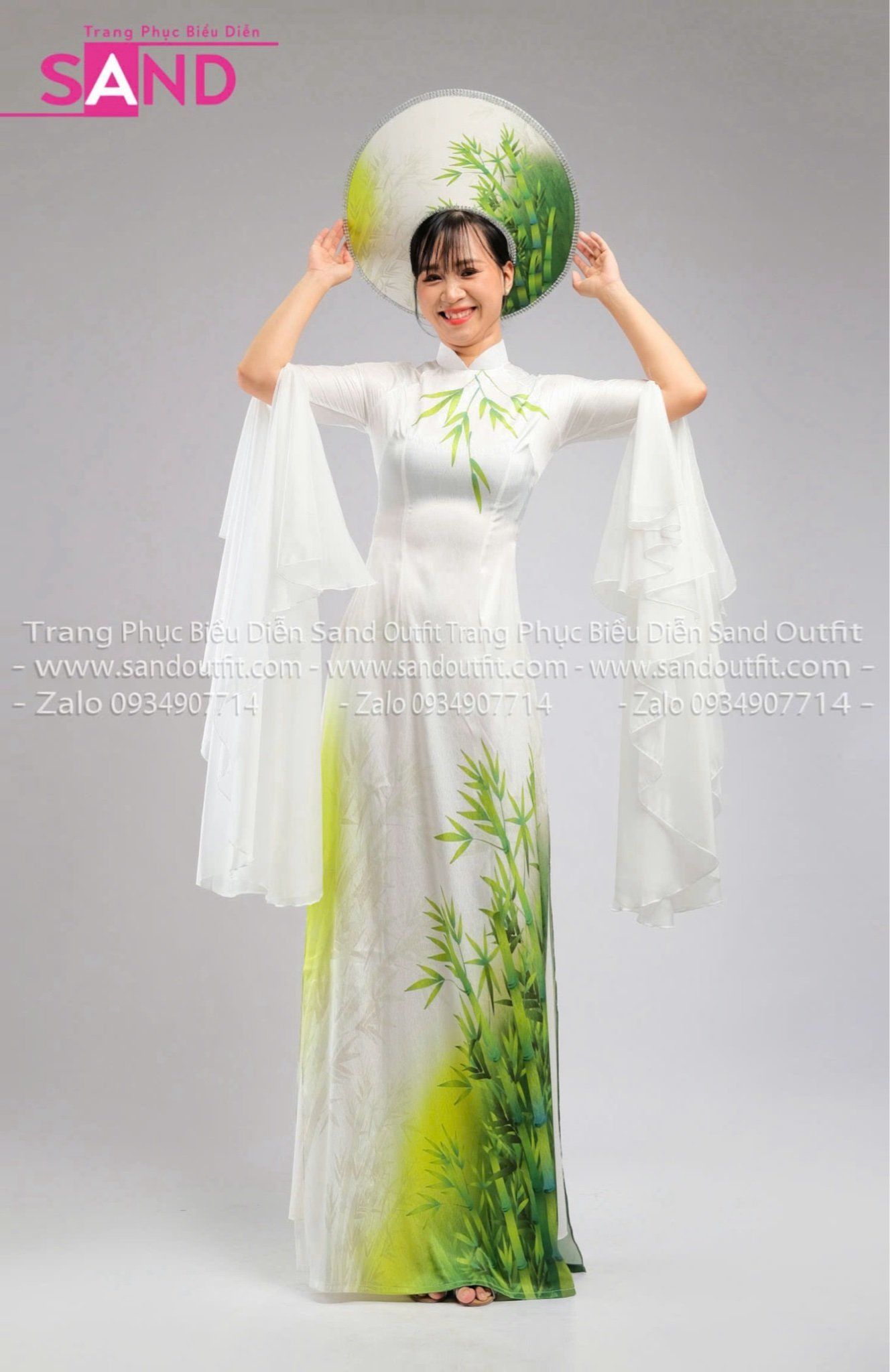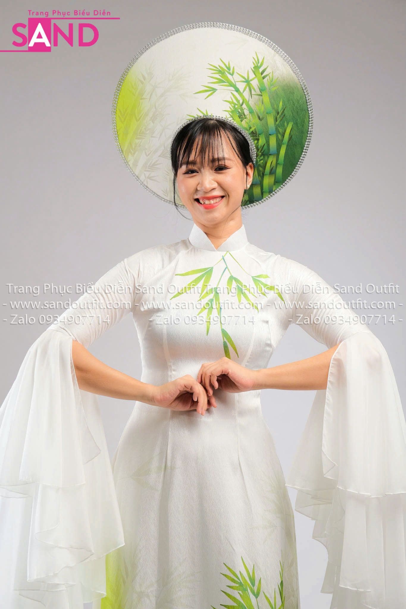 TAE0019 Áo Dài Thiết Kế Tay Voan Xoè Hoạ Tiết Tre Xanh - Màu Trắng ( KÈM MẤN )