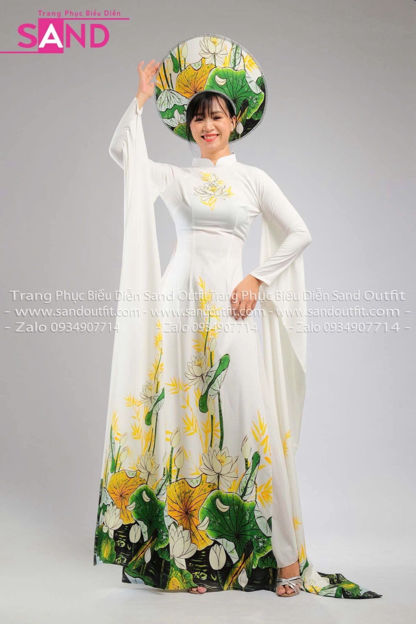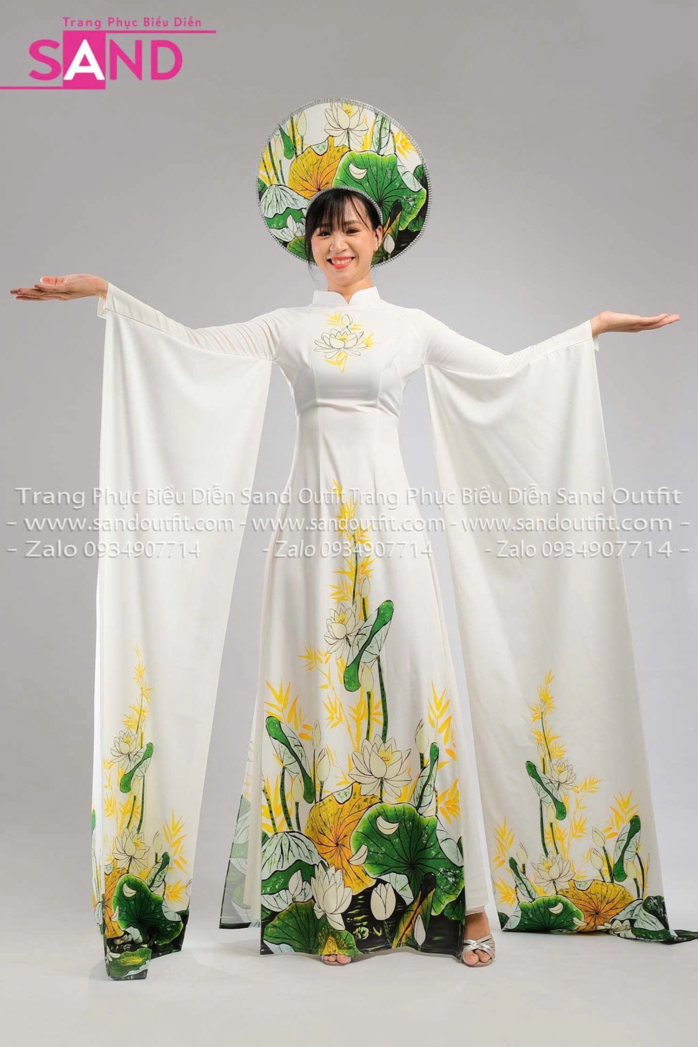 TAE0022 Áo Dài Trình Diễn Tay Lơi Hoạ Tiết Sen Trắng - Màu Trắng ( KÈM MẤN )