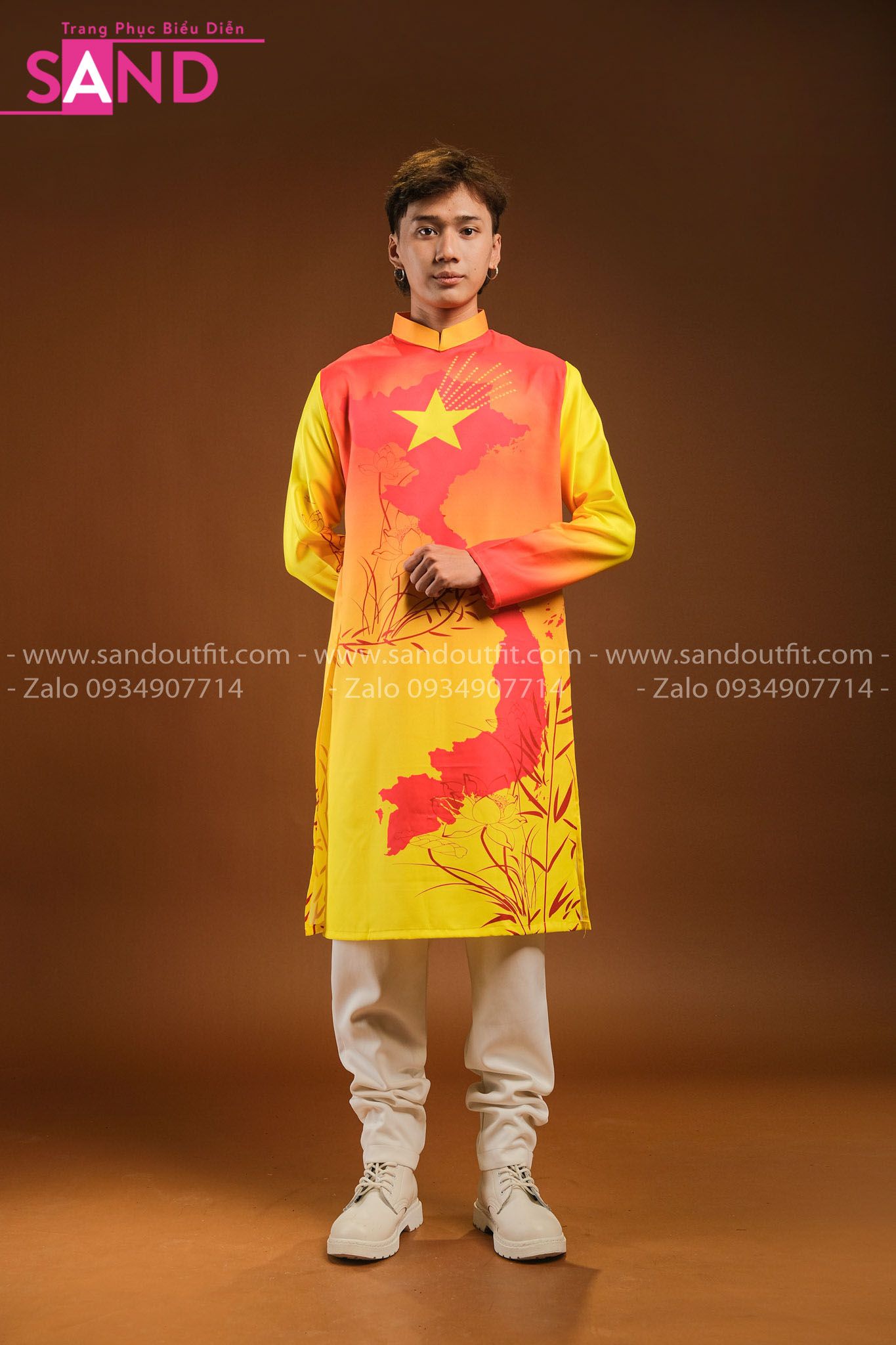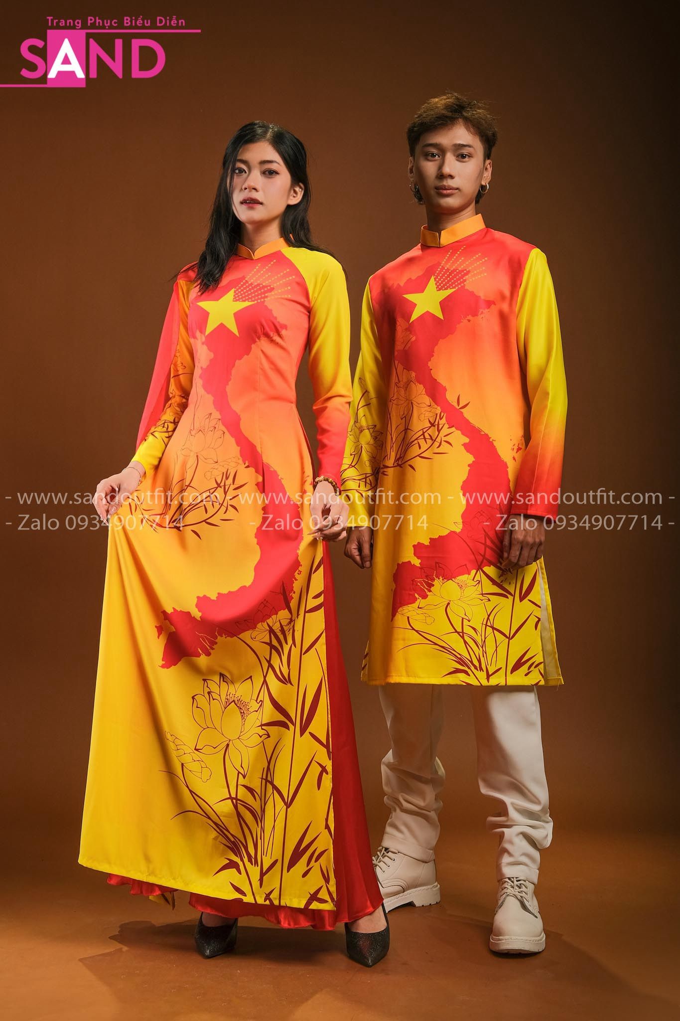 TAD0310 Áo Dài Vàng Hoạ Tiết Bản Đồ - Nam