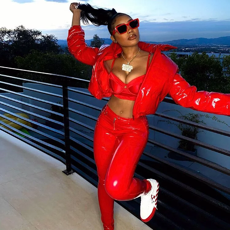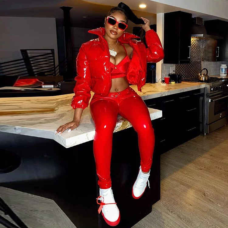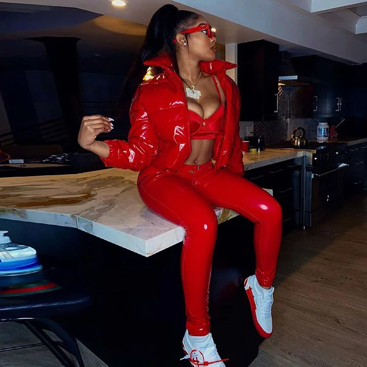 HAP0402 Áo Khoác Phao Da Croptop Dài Tay Đỏ