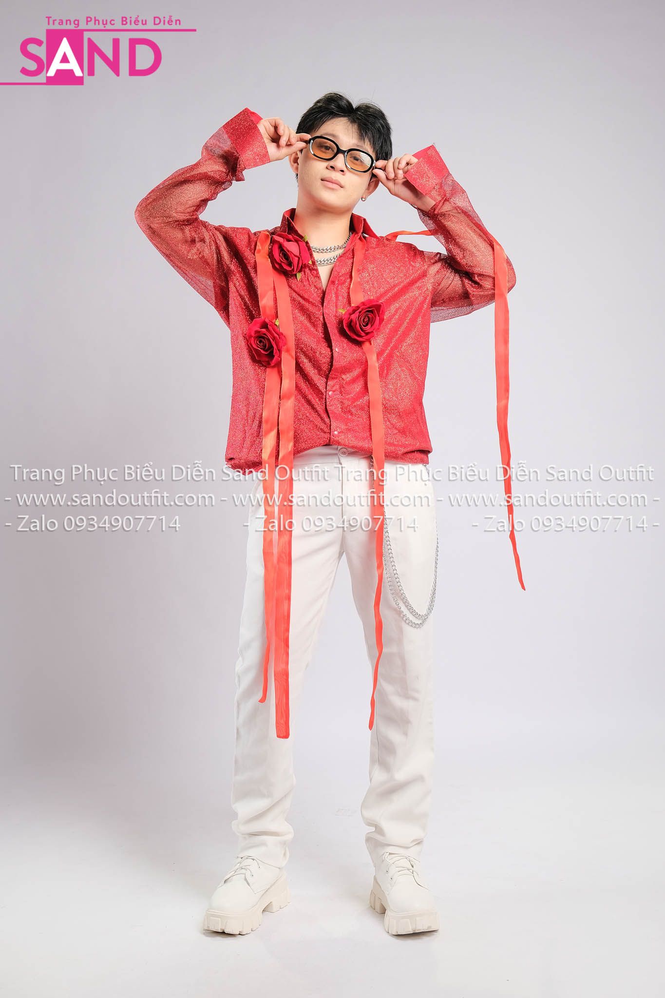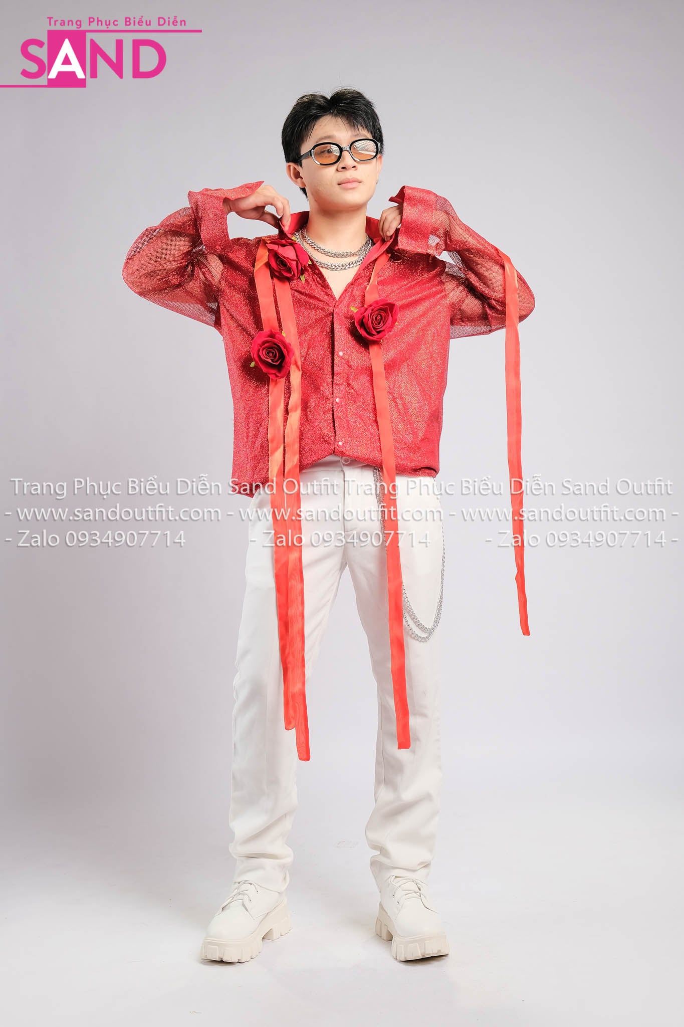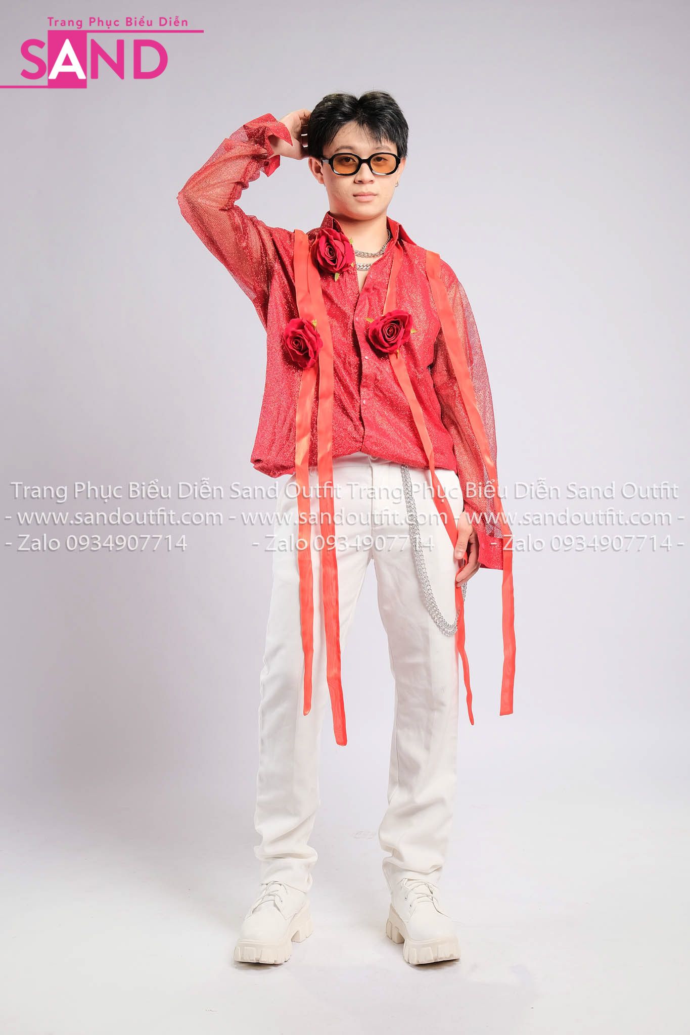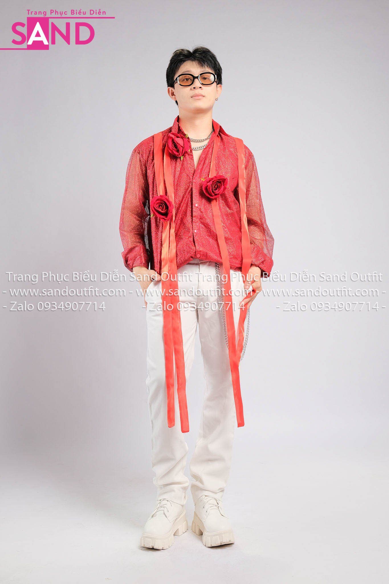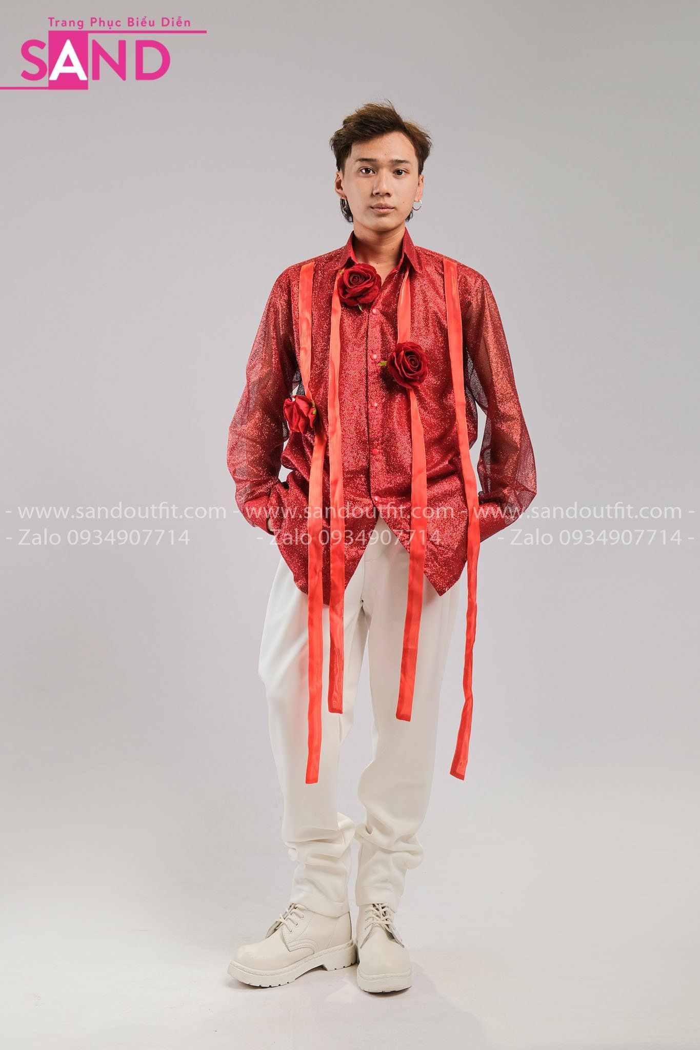 HAM0401 Áo Kim Sa Sơ Mi Dài Tay Hoa Hồng Đỏ Nam Phối HQD0003 Quần Suông Kaki Trắng nam