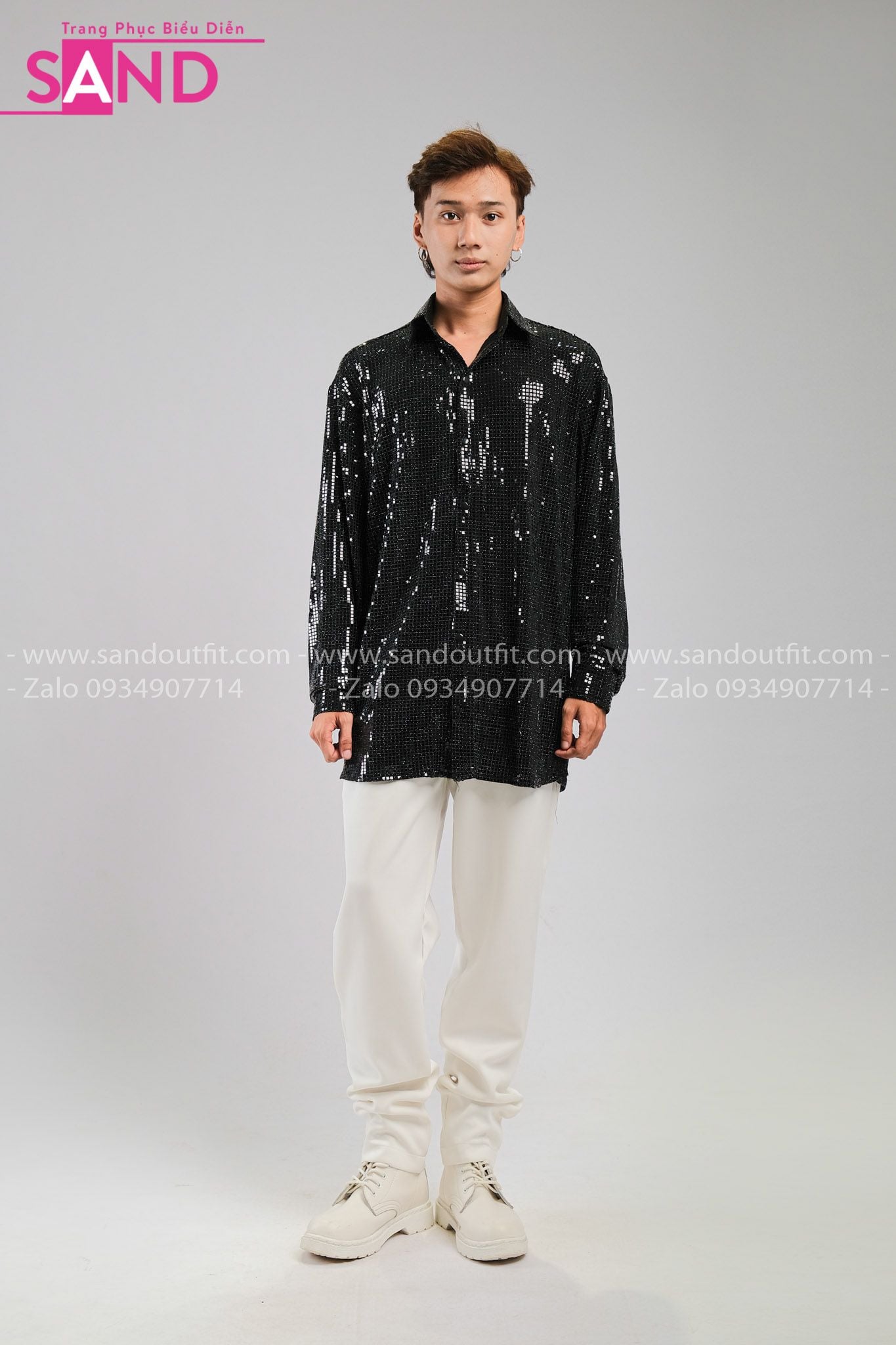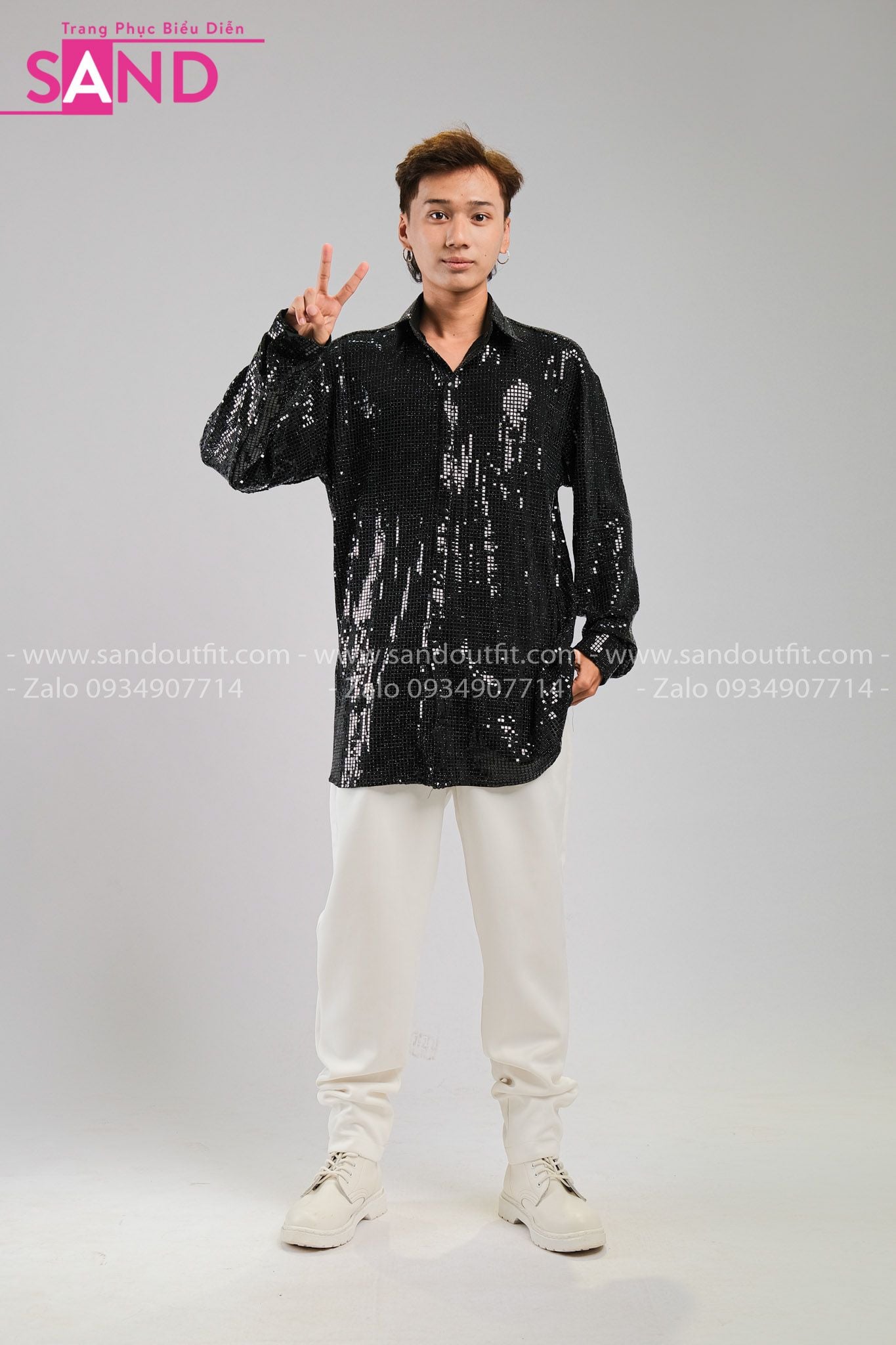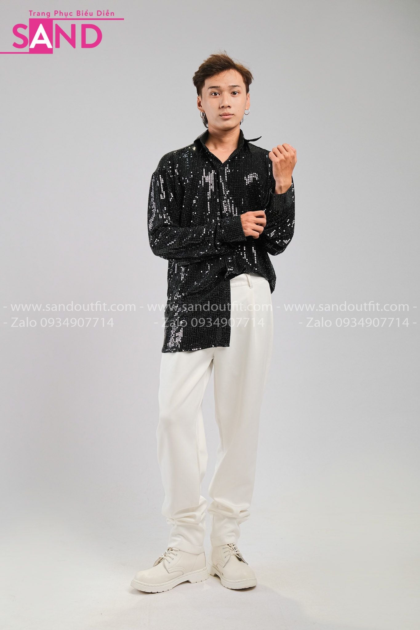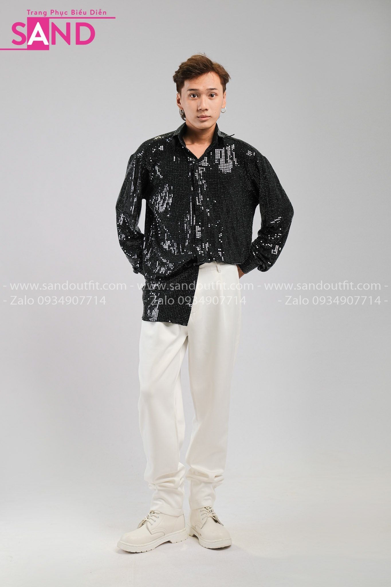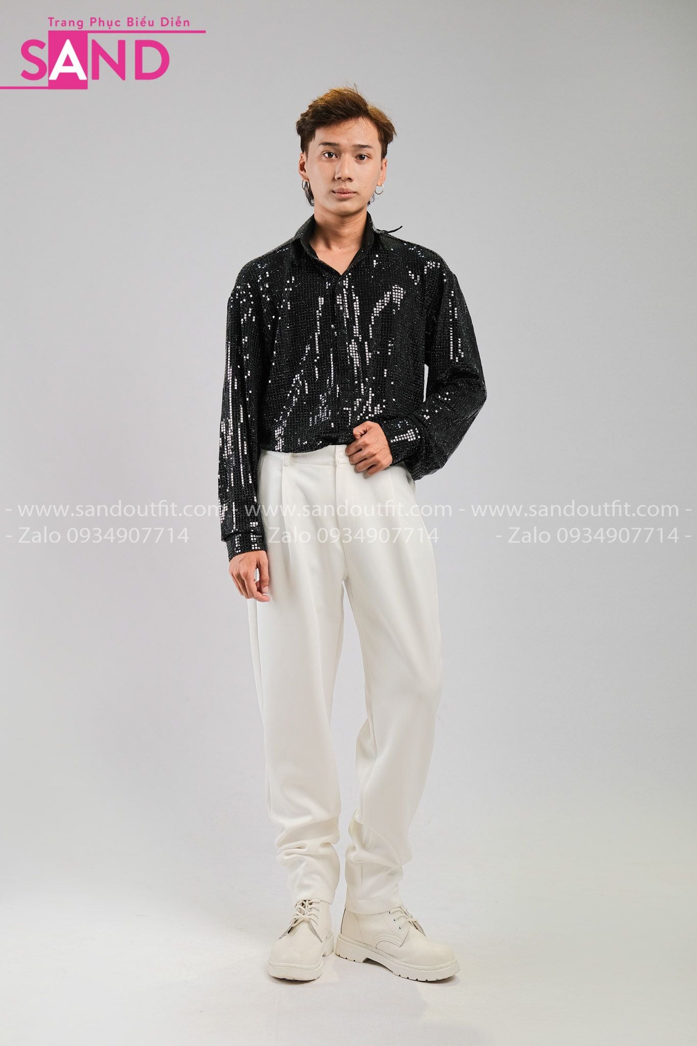 HAM0101 Áo Sơ Mi Kim Sa Dài Tay Đen Nam Phối HQD0003 Quần Suông Kaki Trắng nam