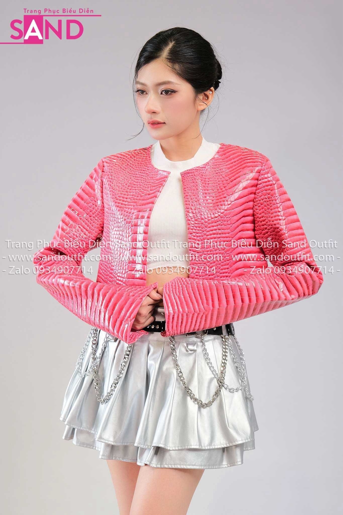Outfit Phối Sẵn (HAD0501 Áo Khoác Da Hồng Cá Sấu phối HVQ0202 Váy Xếp Li Bạc 2 Tầng Khoen)