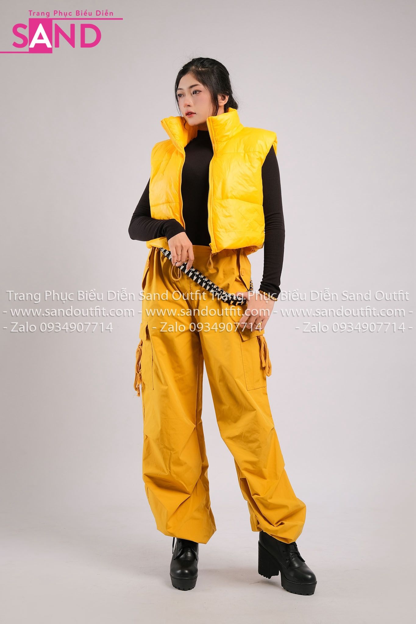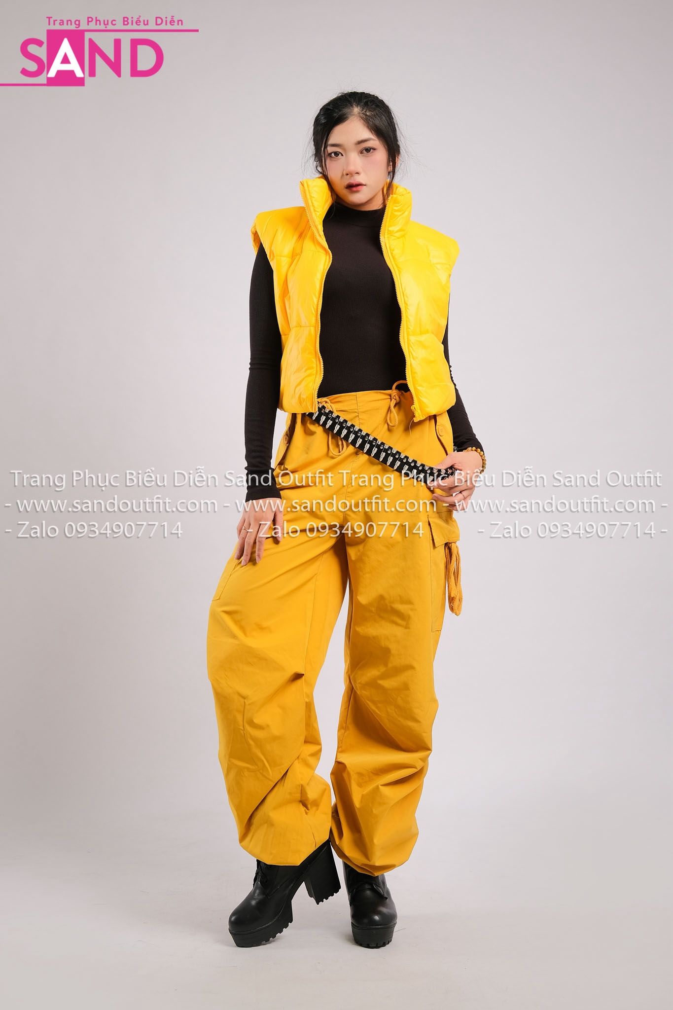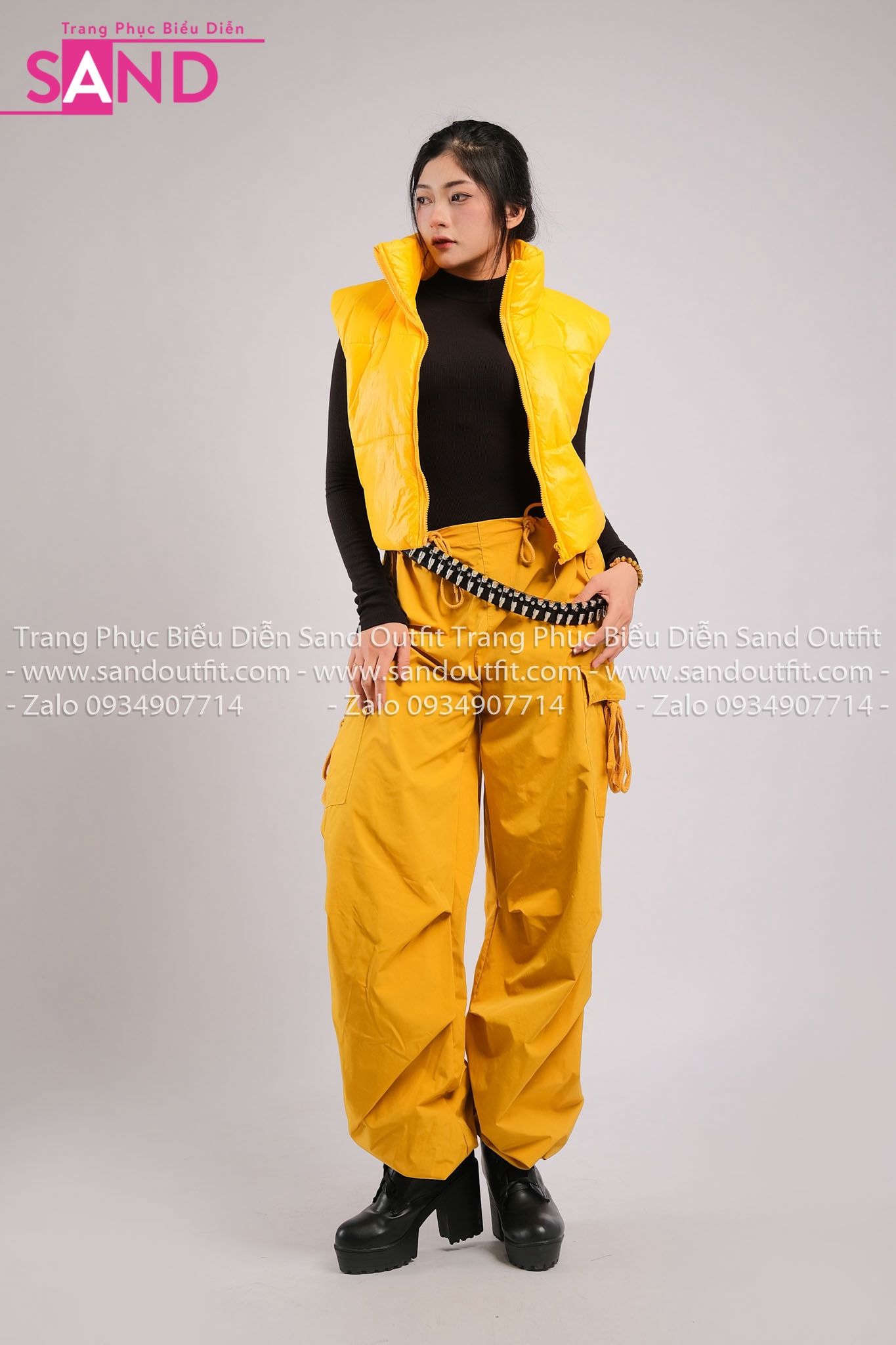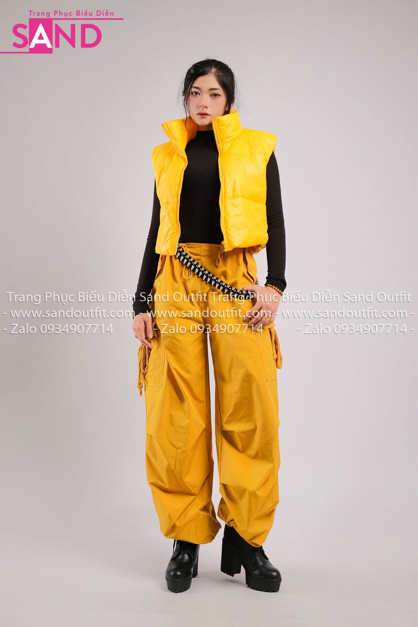 Outfit Phối Sẵn - (HQN0301 Quần Dài Vàng Nắp Túi Hộp Ngang Phối Dây HAP0301 Áo Gile Phao Croptop Vàng)