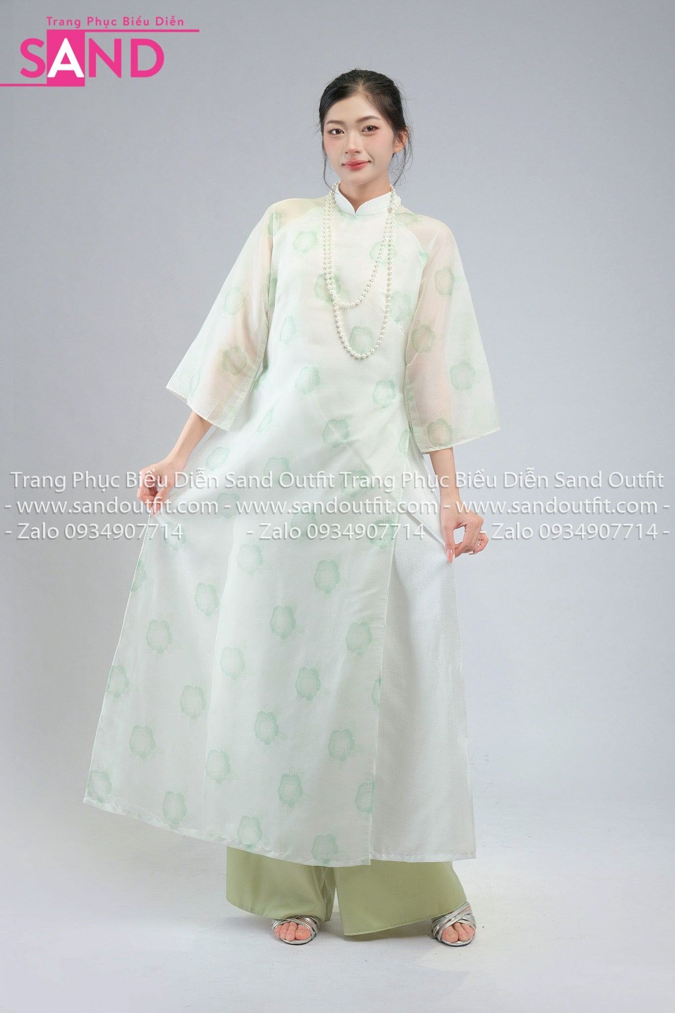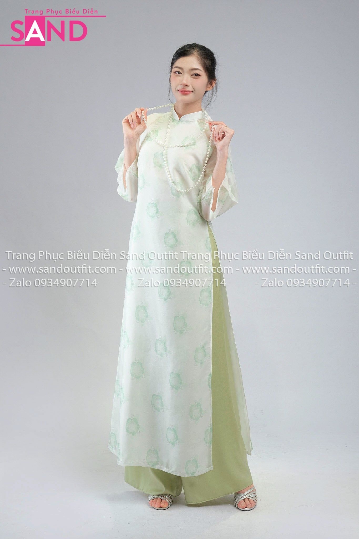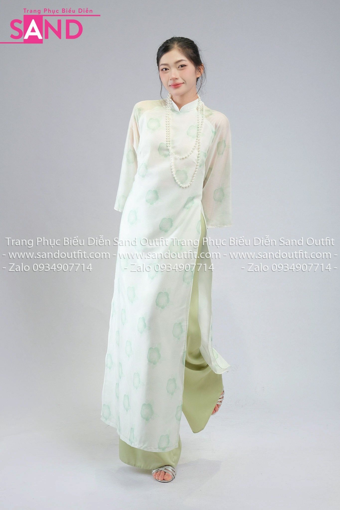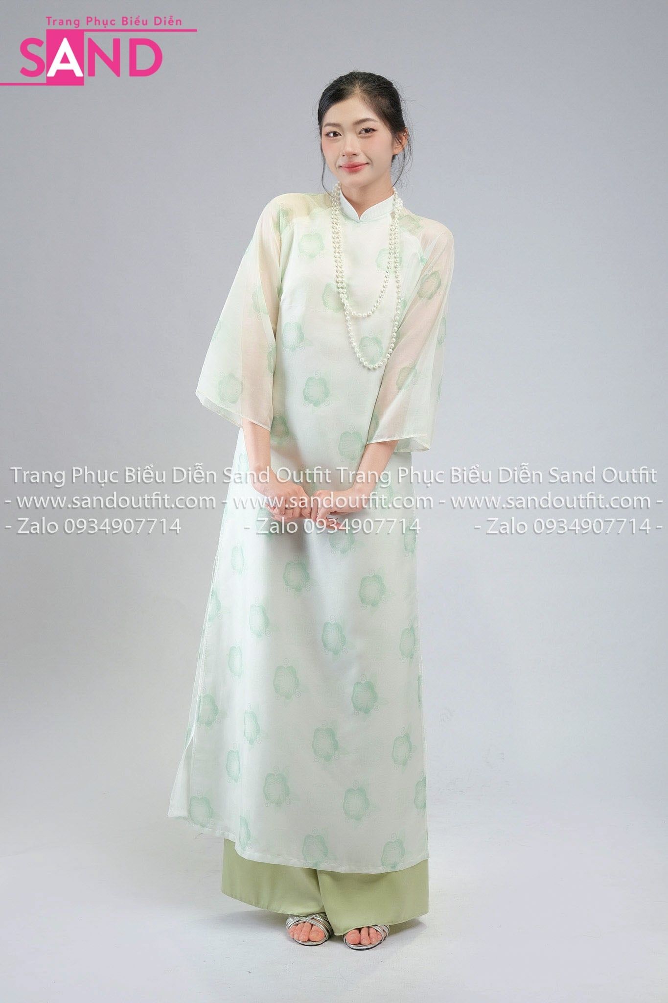 TAC0937 Áo Dài Nữ Cách Tân 4 tà Hoạ Tiết Tay Voan - Xanh Lá