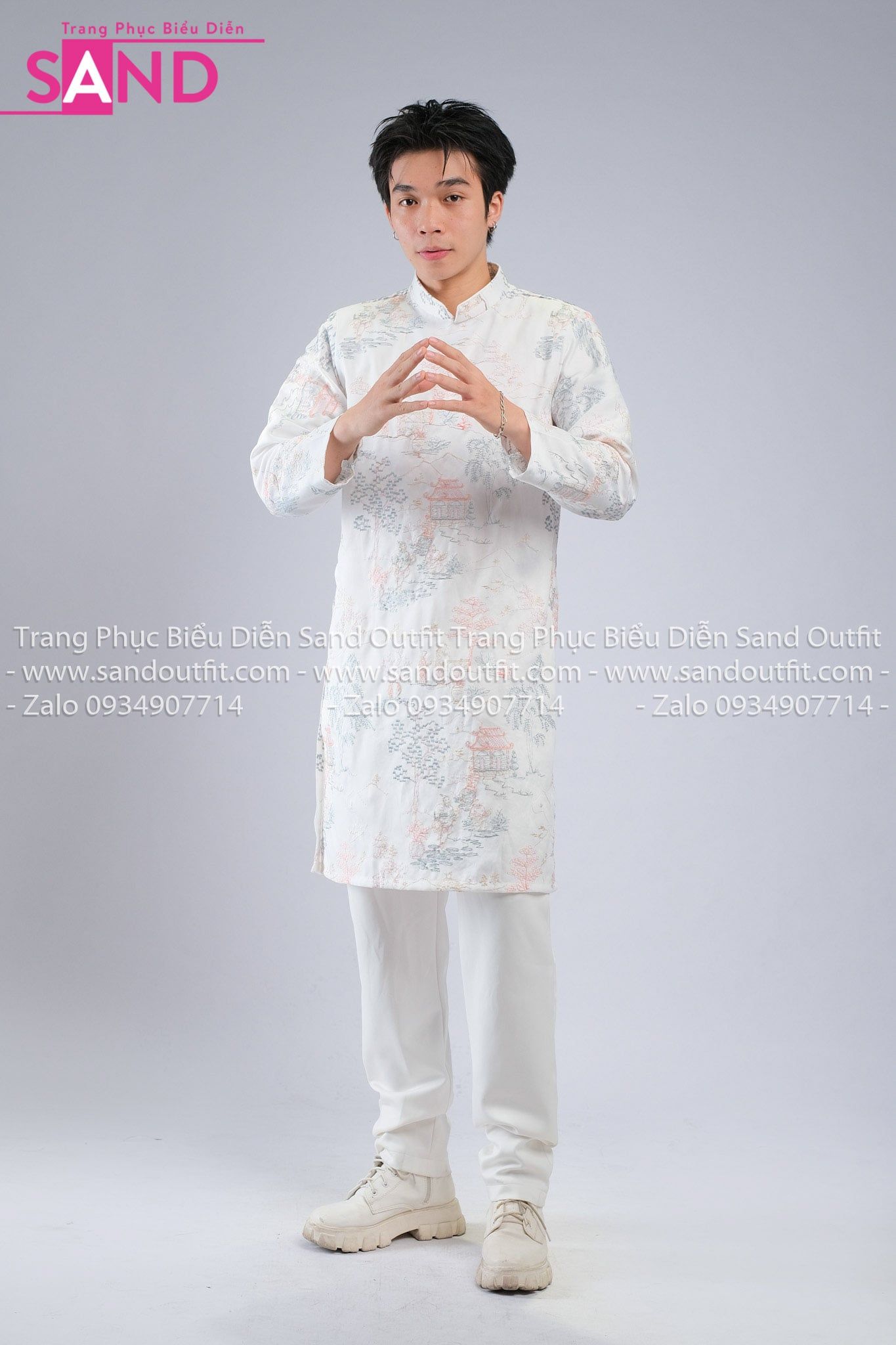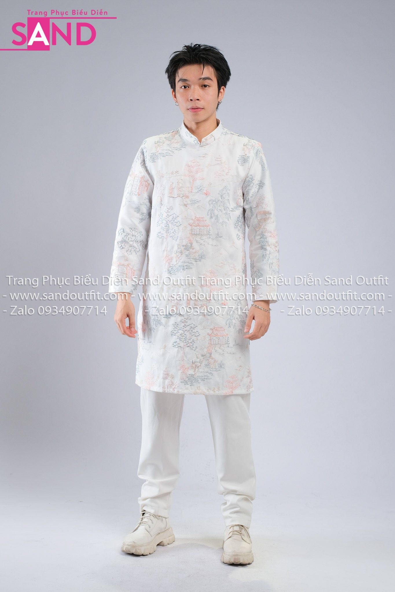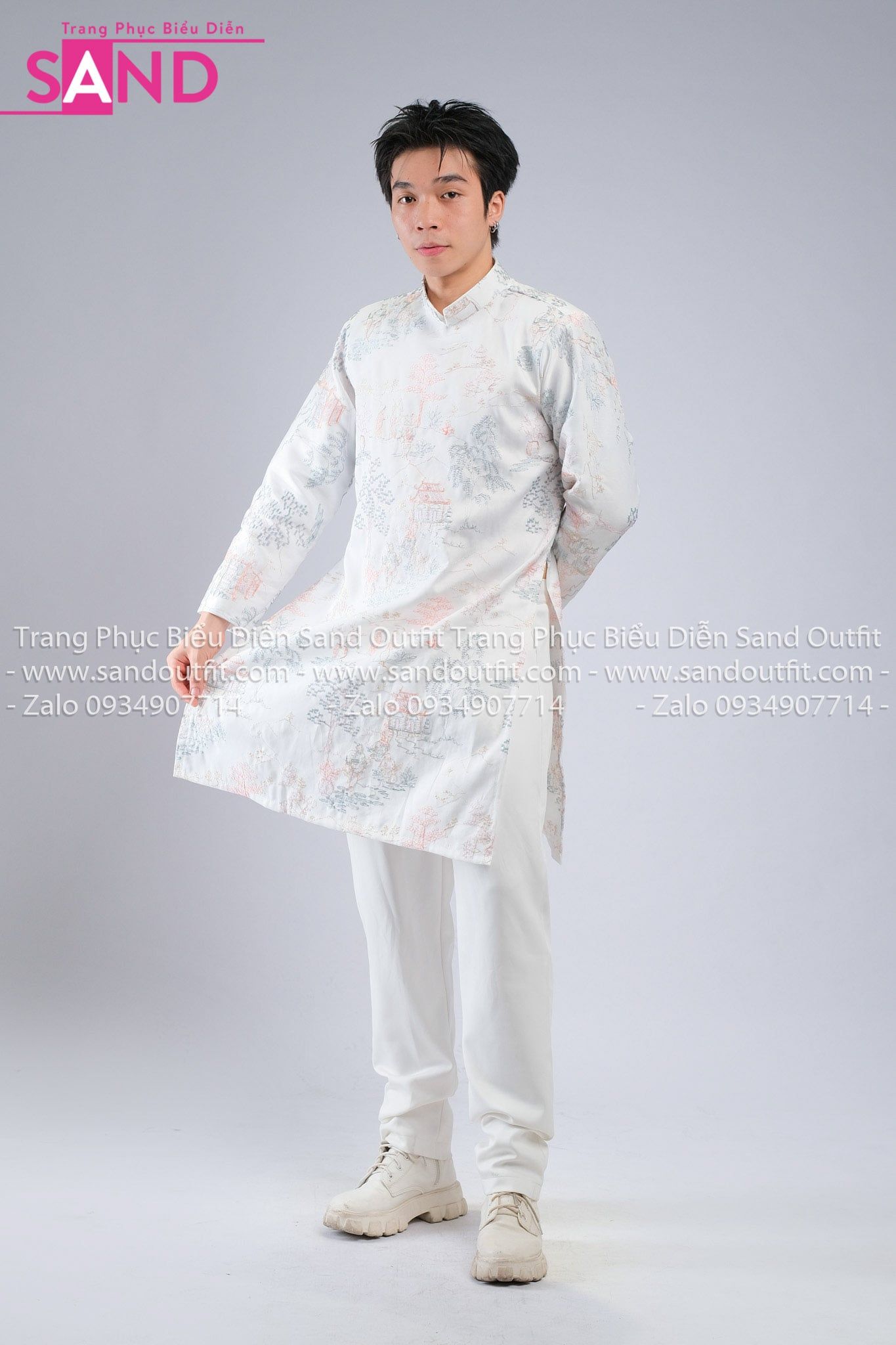 TAD0022 Áo Dài Nam Cách Tân Thêu Hoạ Tiết - Trắng