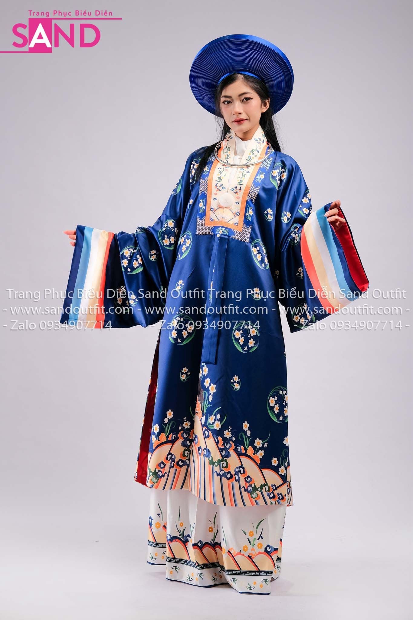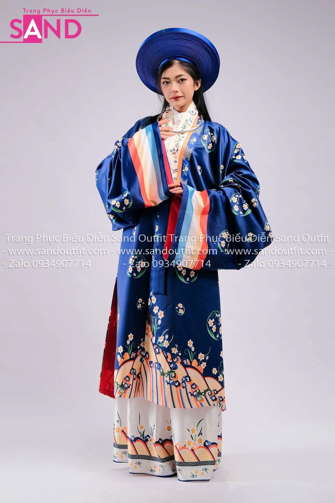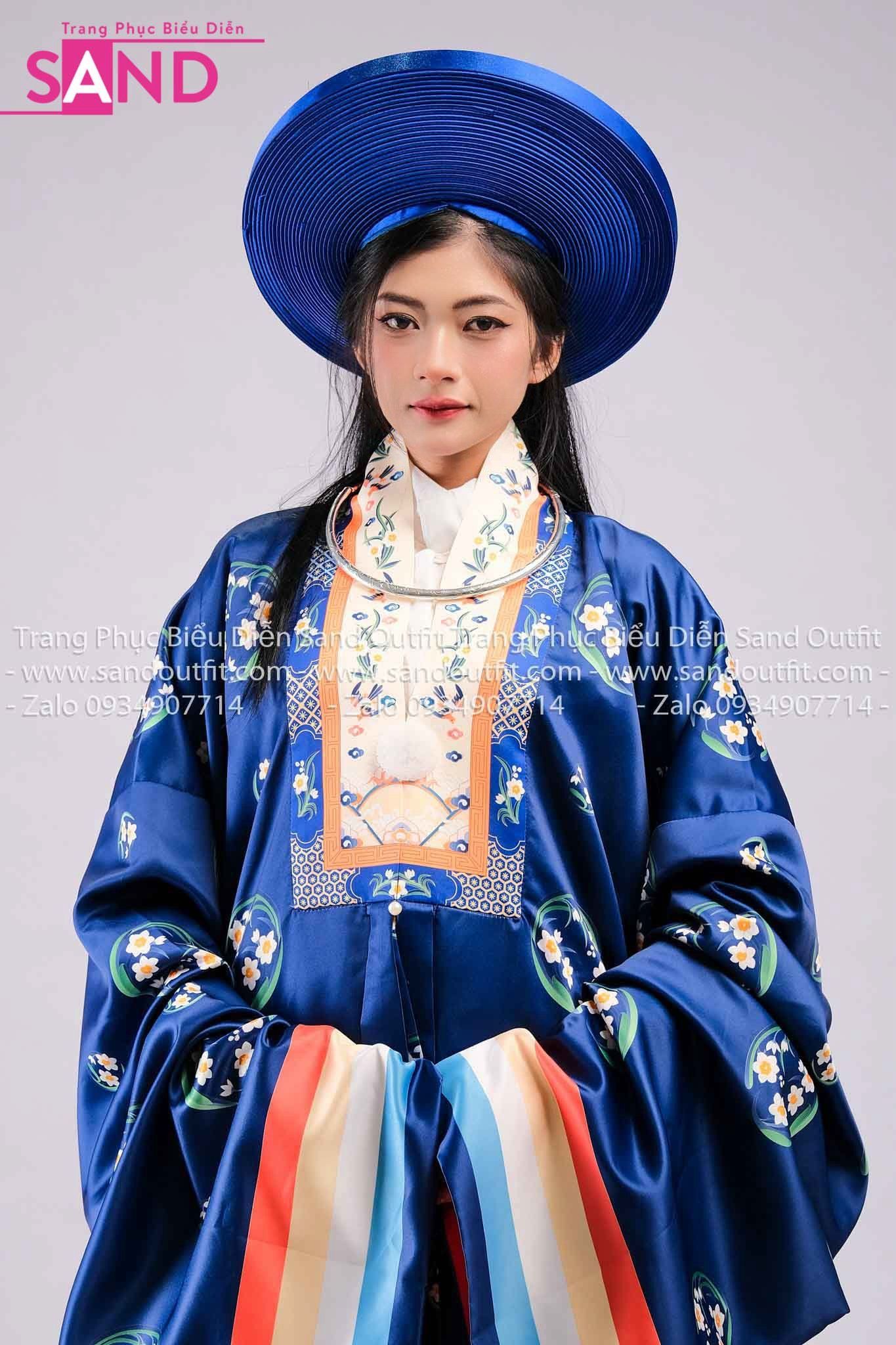 TCB0806 Nhật Bình Cổ Phục Việt Nữ Hoạ Tiết Phối Thường Trắng - Màu Xanh Dương
