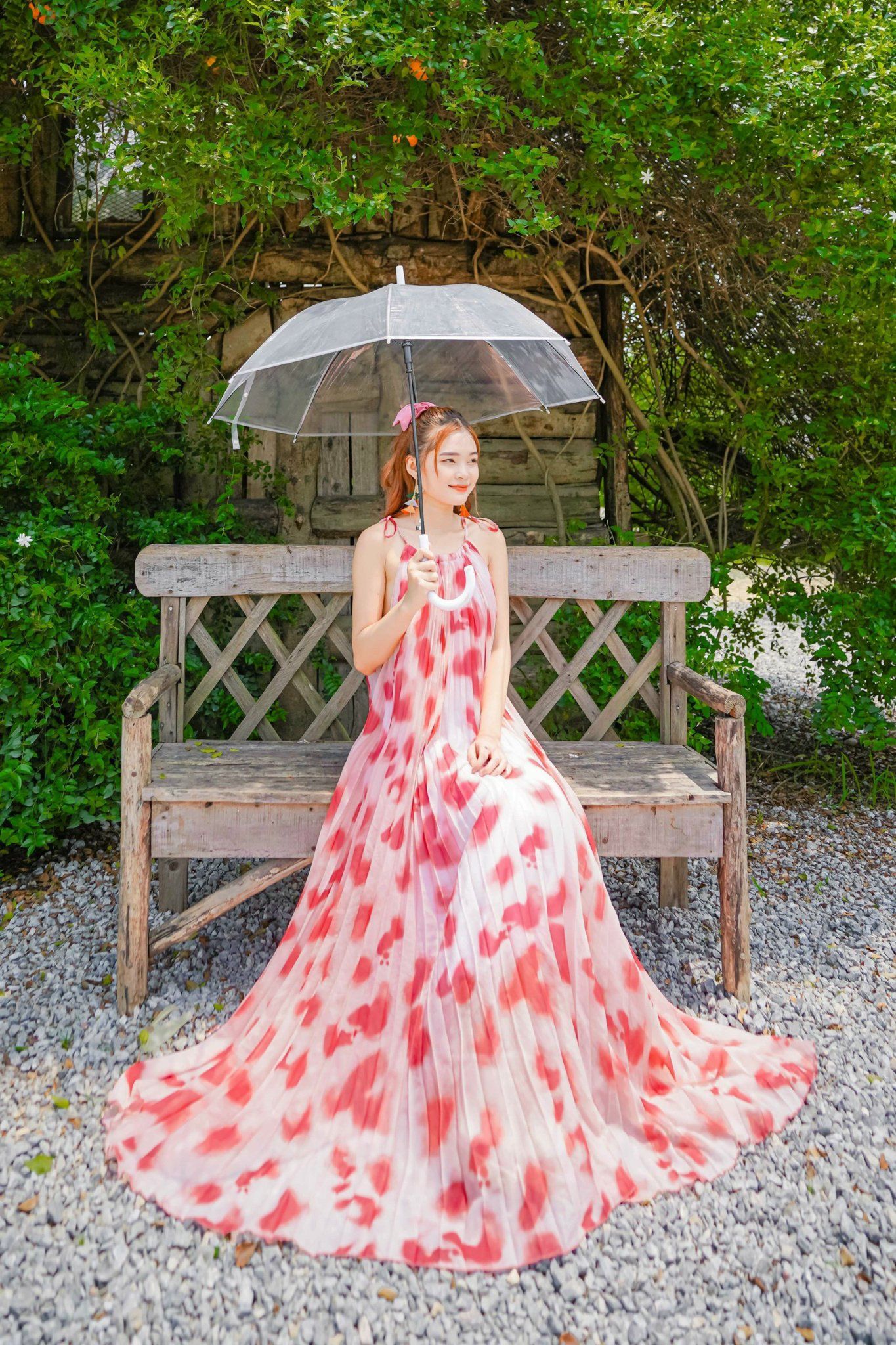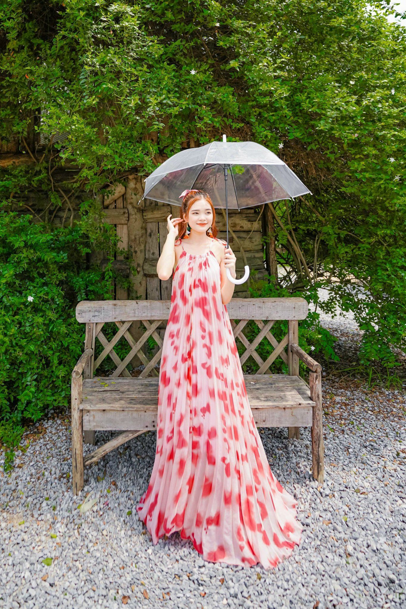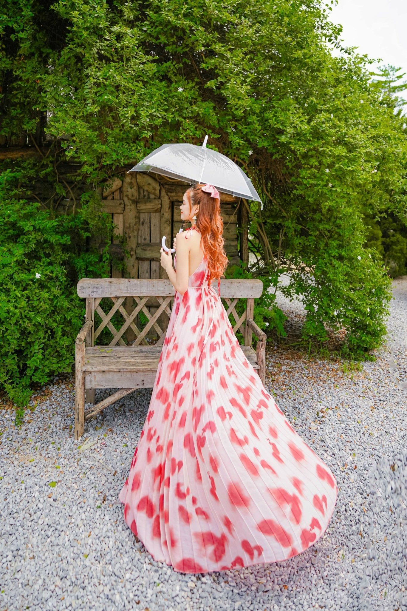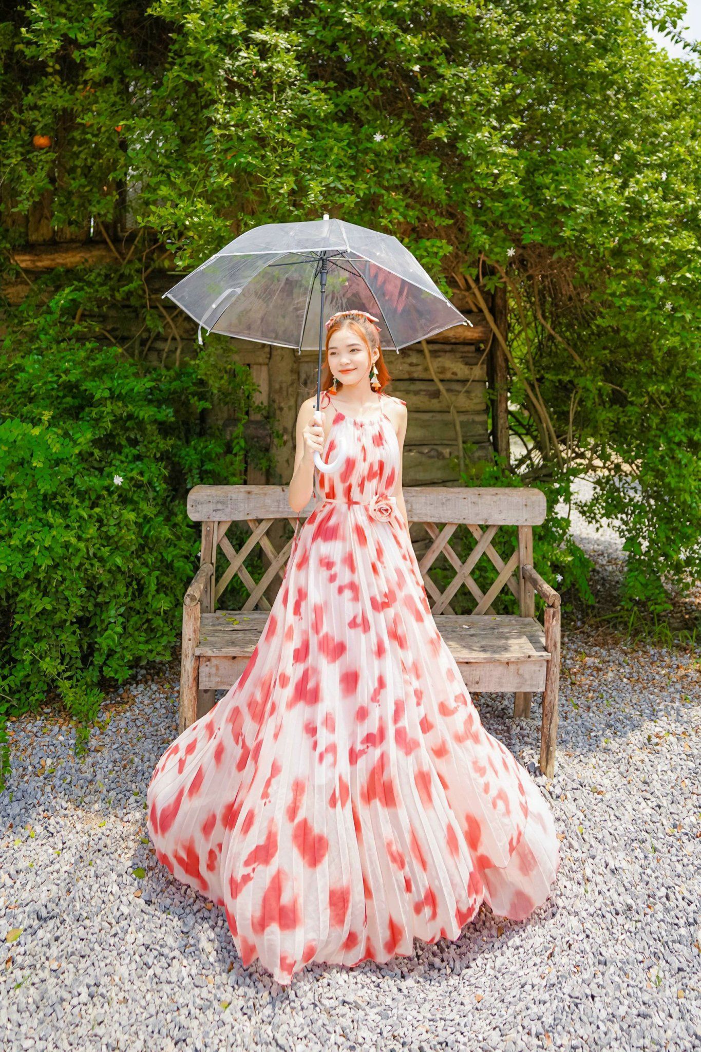 VBM0411 Váy Maxi Loang Đỏ Cổ Yếm Xếp Ly Dáng Xoè