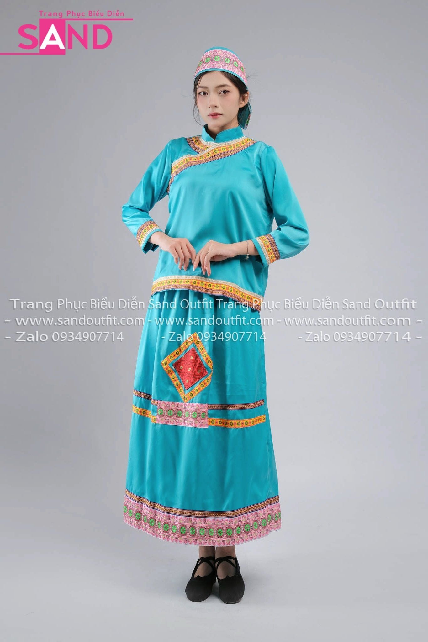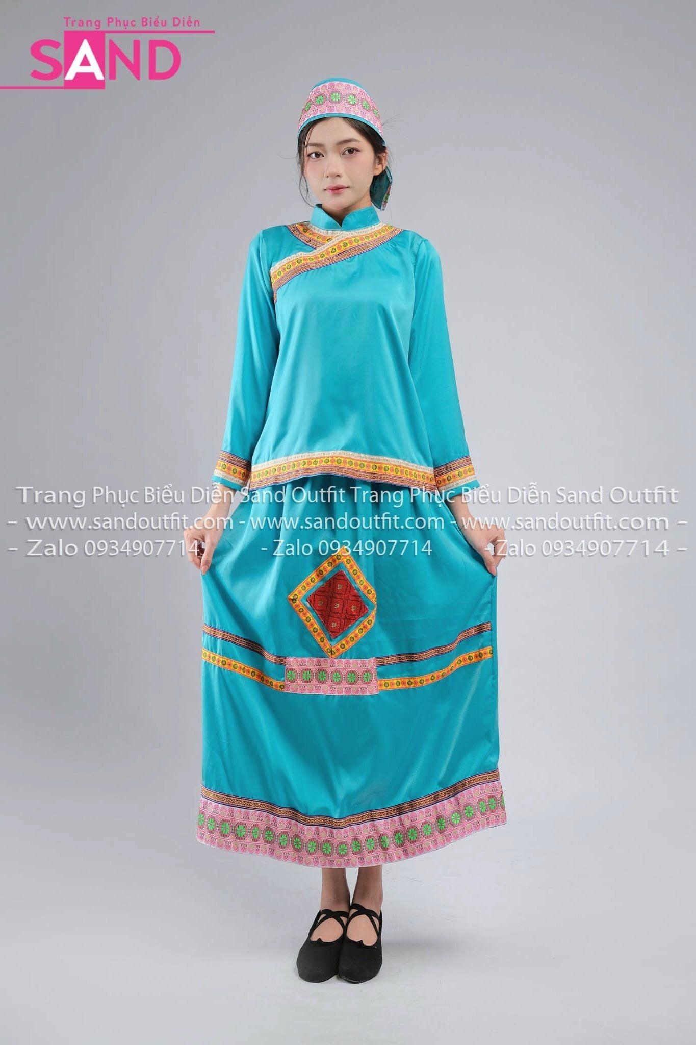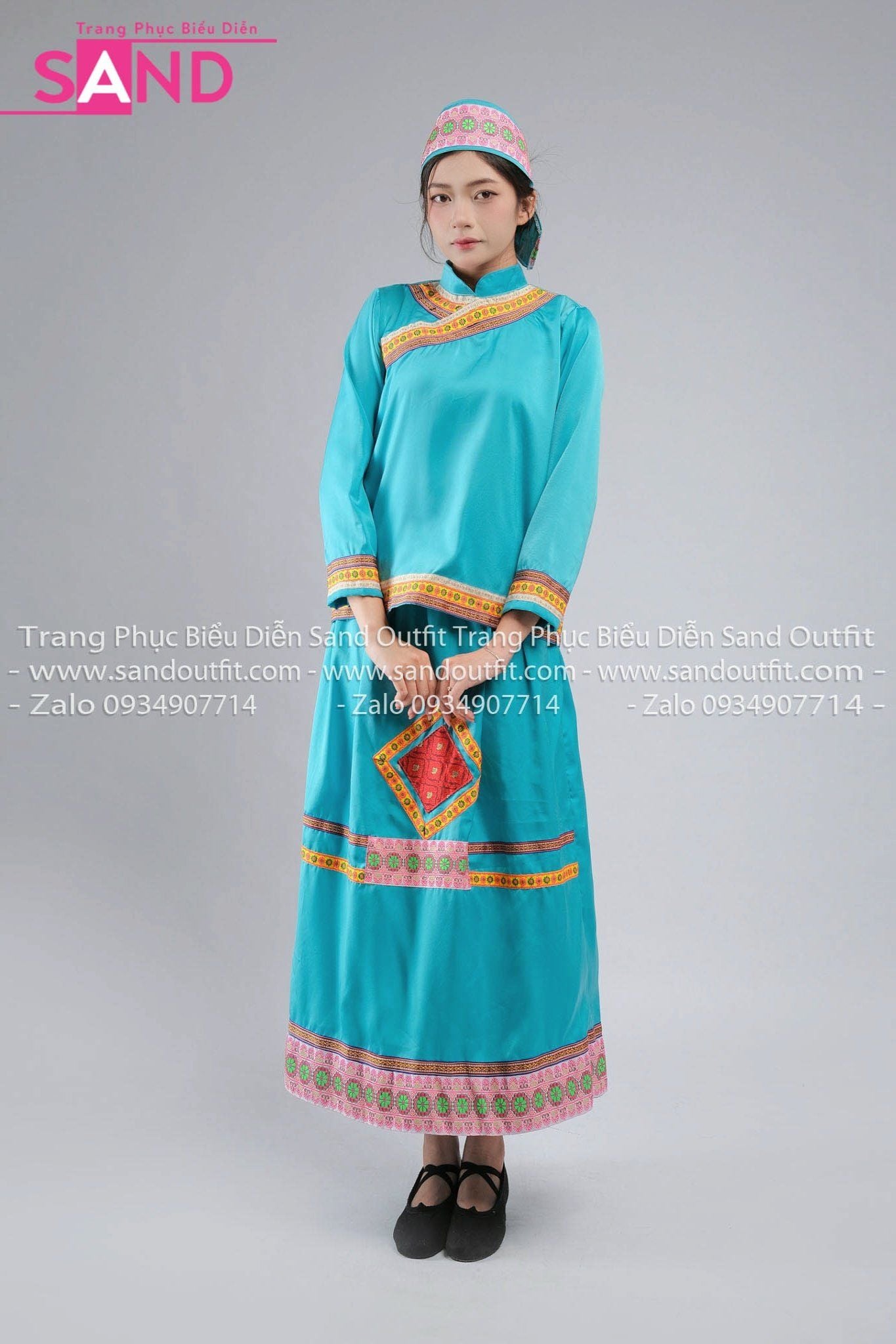 NHO0802 Trang Phục Dân Tộc Hoa Nữ Xanh Nhạt