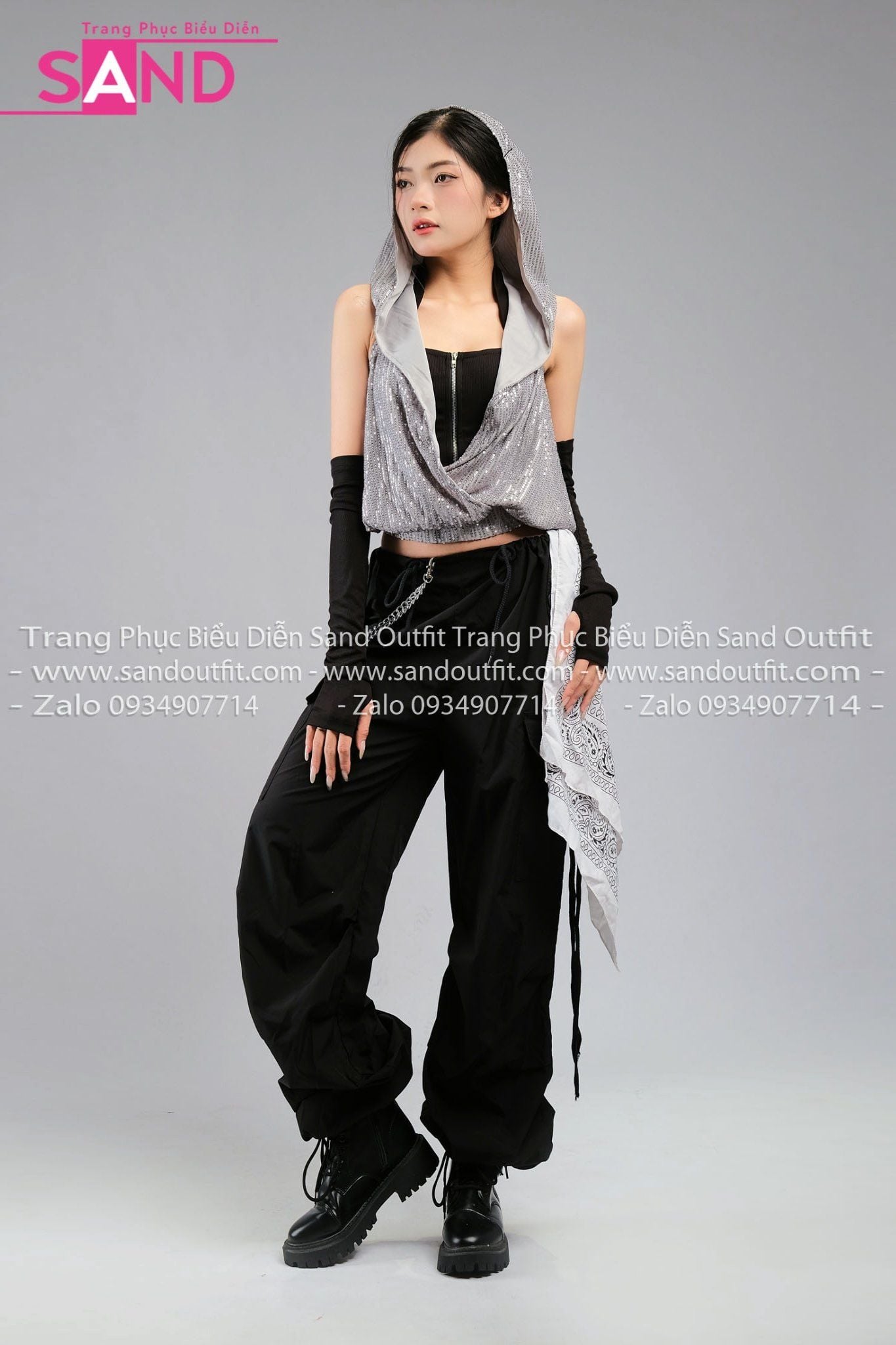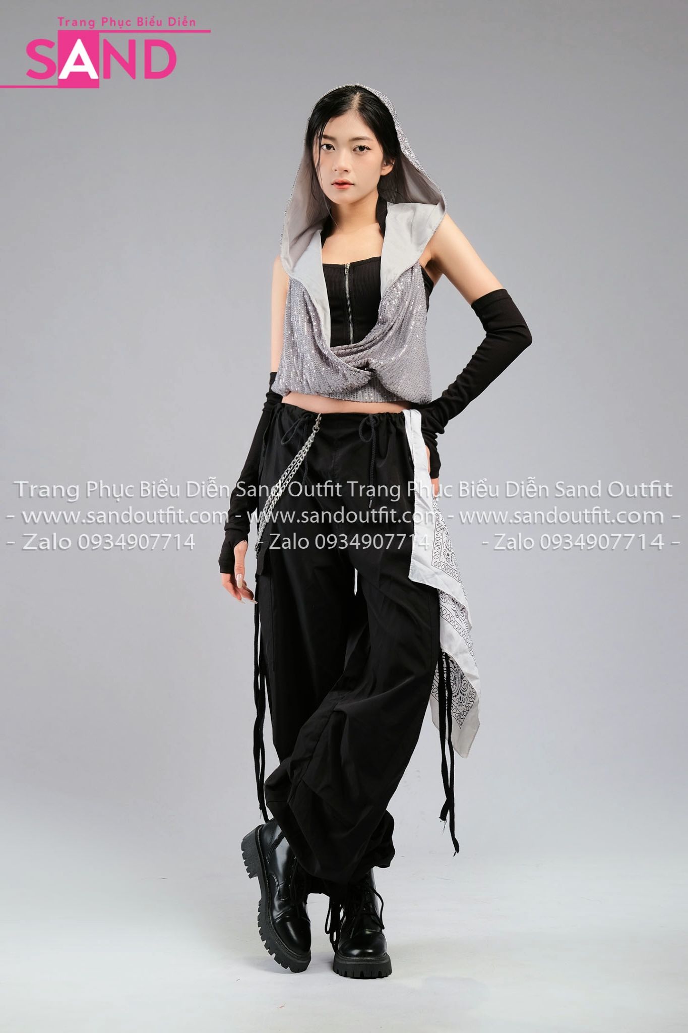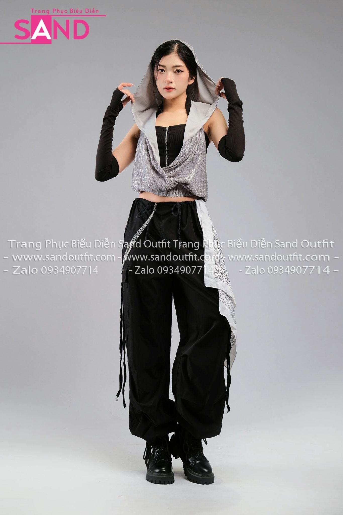 Outfit Phối Sẵn - (HQN0101 Quần Dài Đen Nắp Túi Hộp Ngang Phối Dây phối HAM0103 Áo Kim Sa Ánh Bạc Mũ Trùm Kèm Bao Tay Đen)