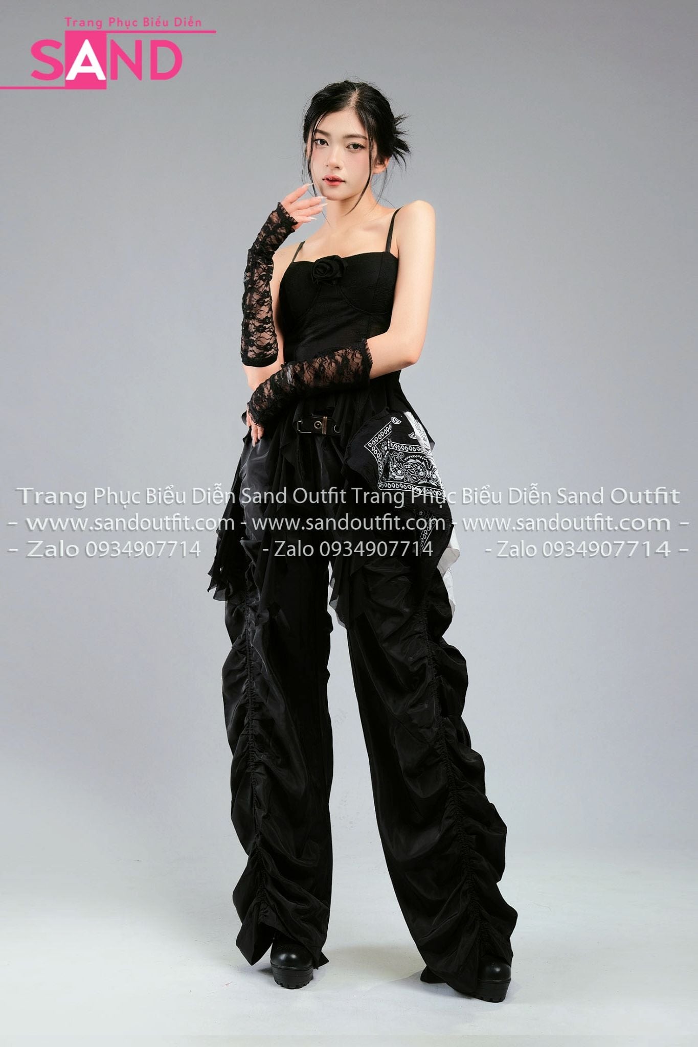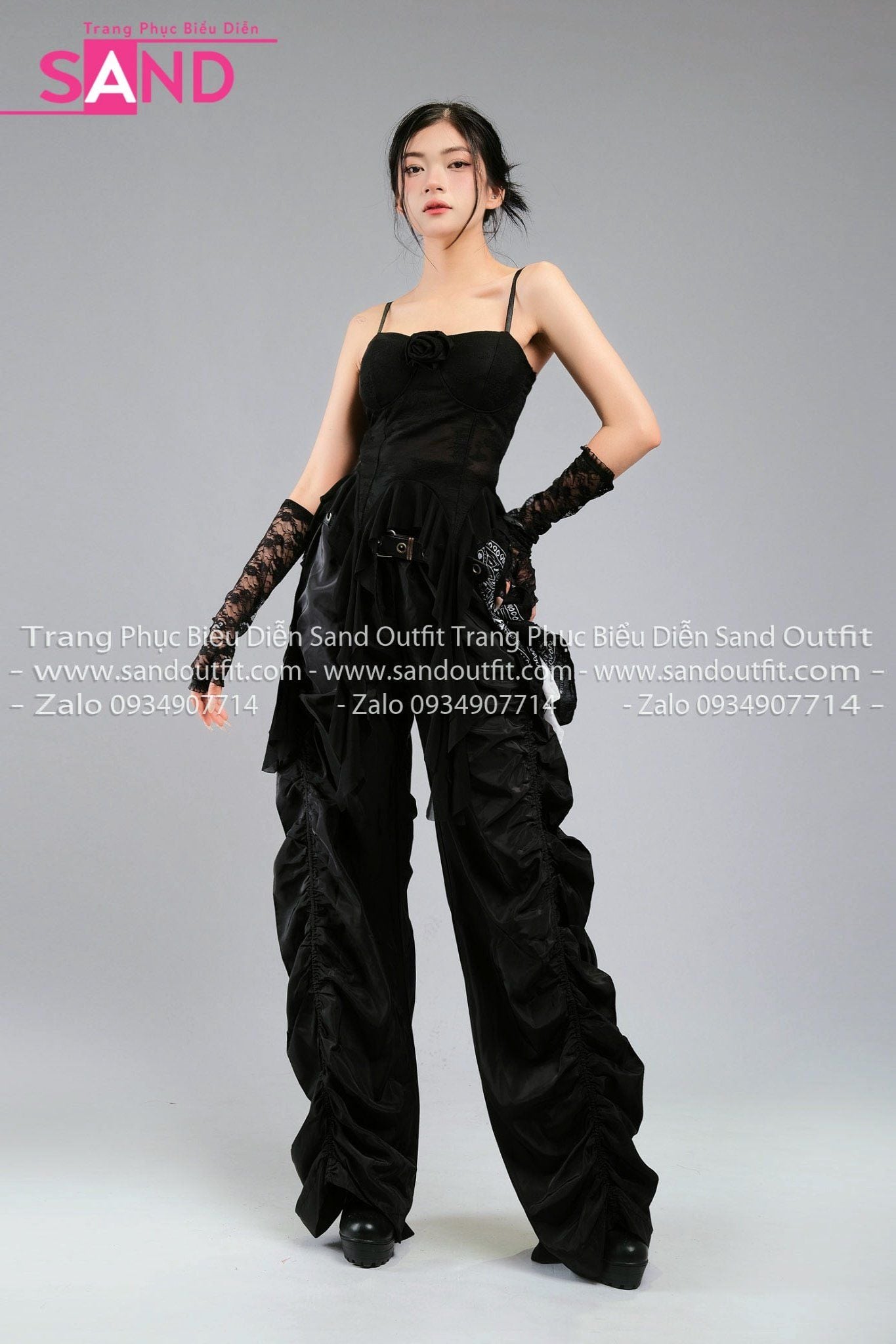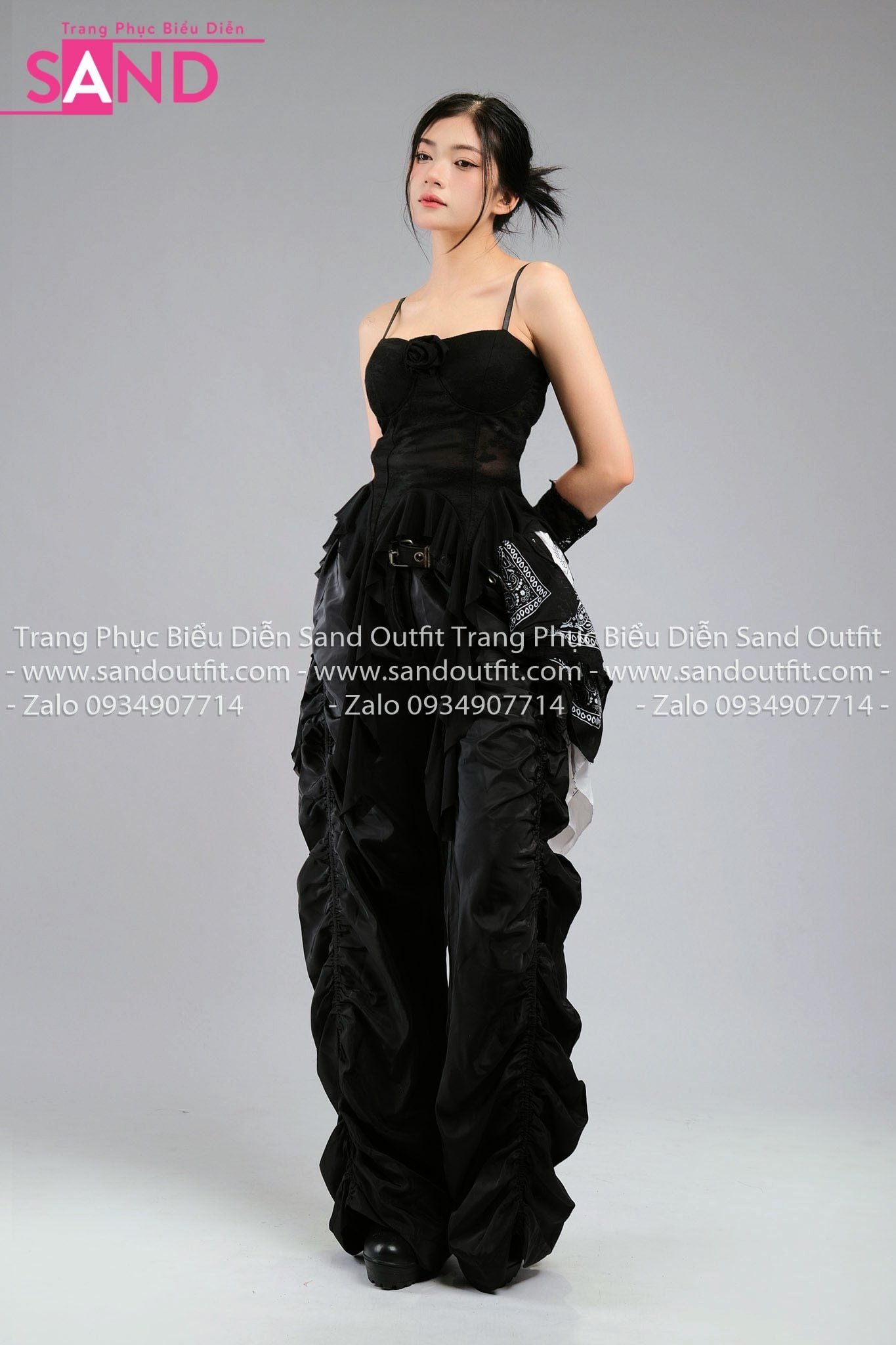 Outfit Phối Sẵn - (HQC0101 Quần Dù Ống Rộng Phối Chun Dây Rút - Đen phối HAQ0101 Áo 2 Dây Cúp Ngực Tua Rua Đen)