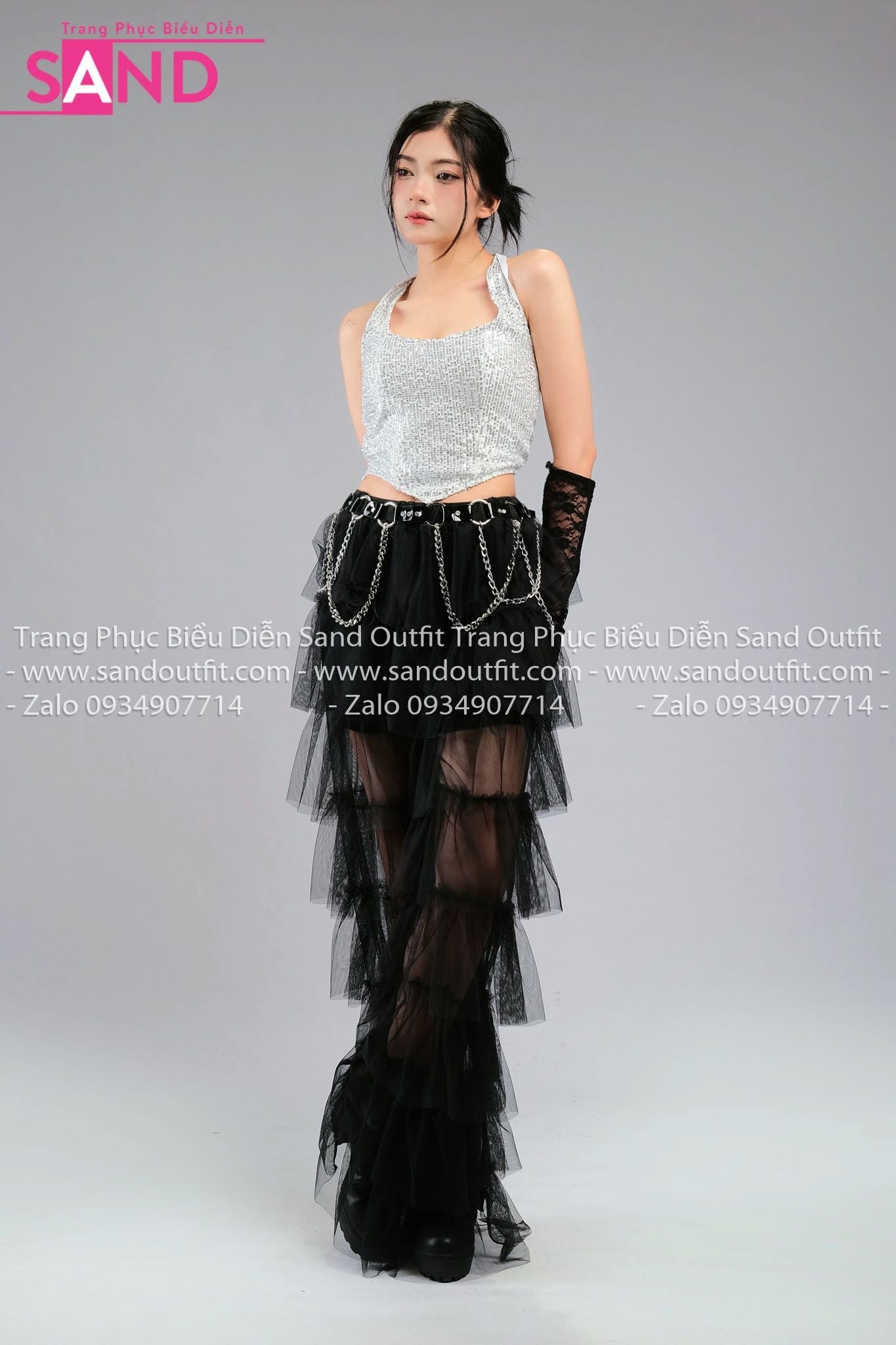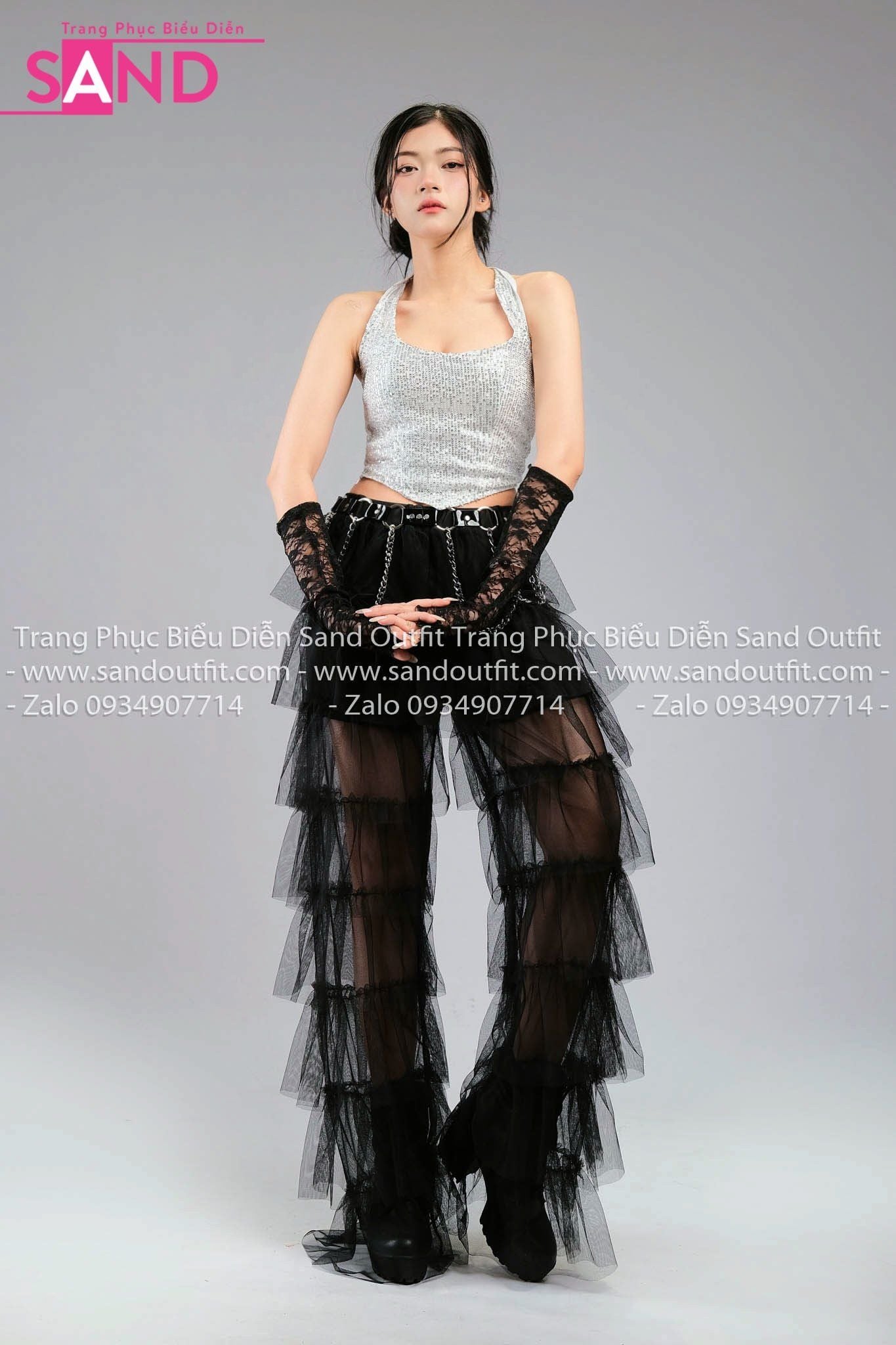Outfit Phối Sẵn - ( HQD0102 Quần Dài Tua Rua Tầng Voan phối HAM0201 Áo 2 Dậy Kim Sa Bạc)