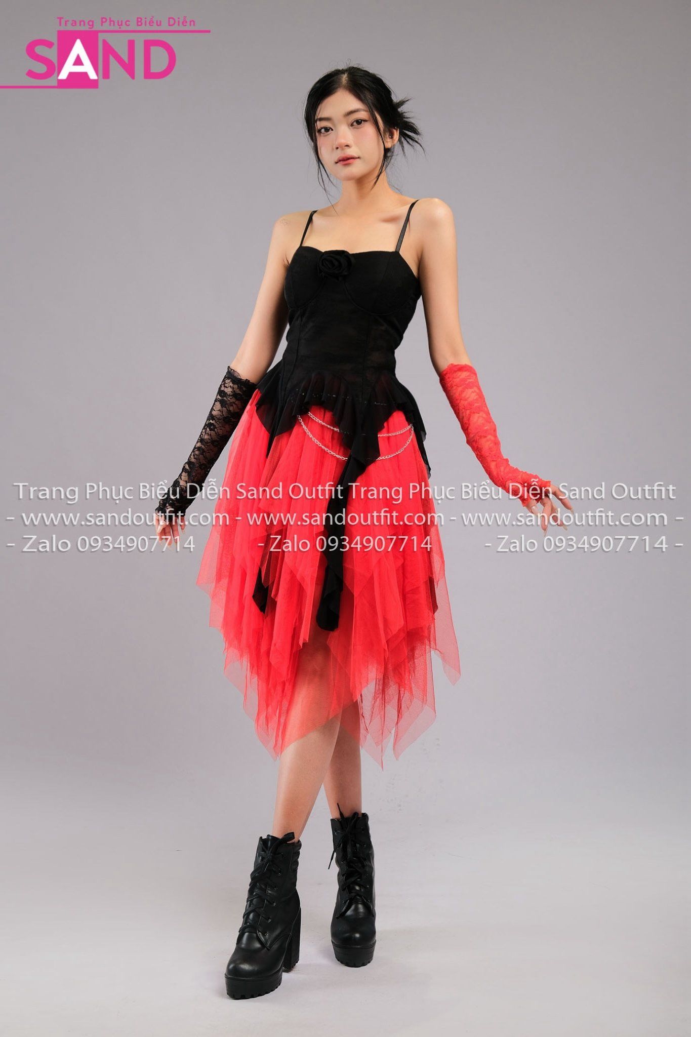 Outfit Phối Sẵn - ( HVL0401 Váy Voan Đỏ Đuôi Nhọn phối HAQ0102 Áo 2 Dây Cúp Ngực Tua Rua Đen)