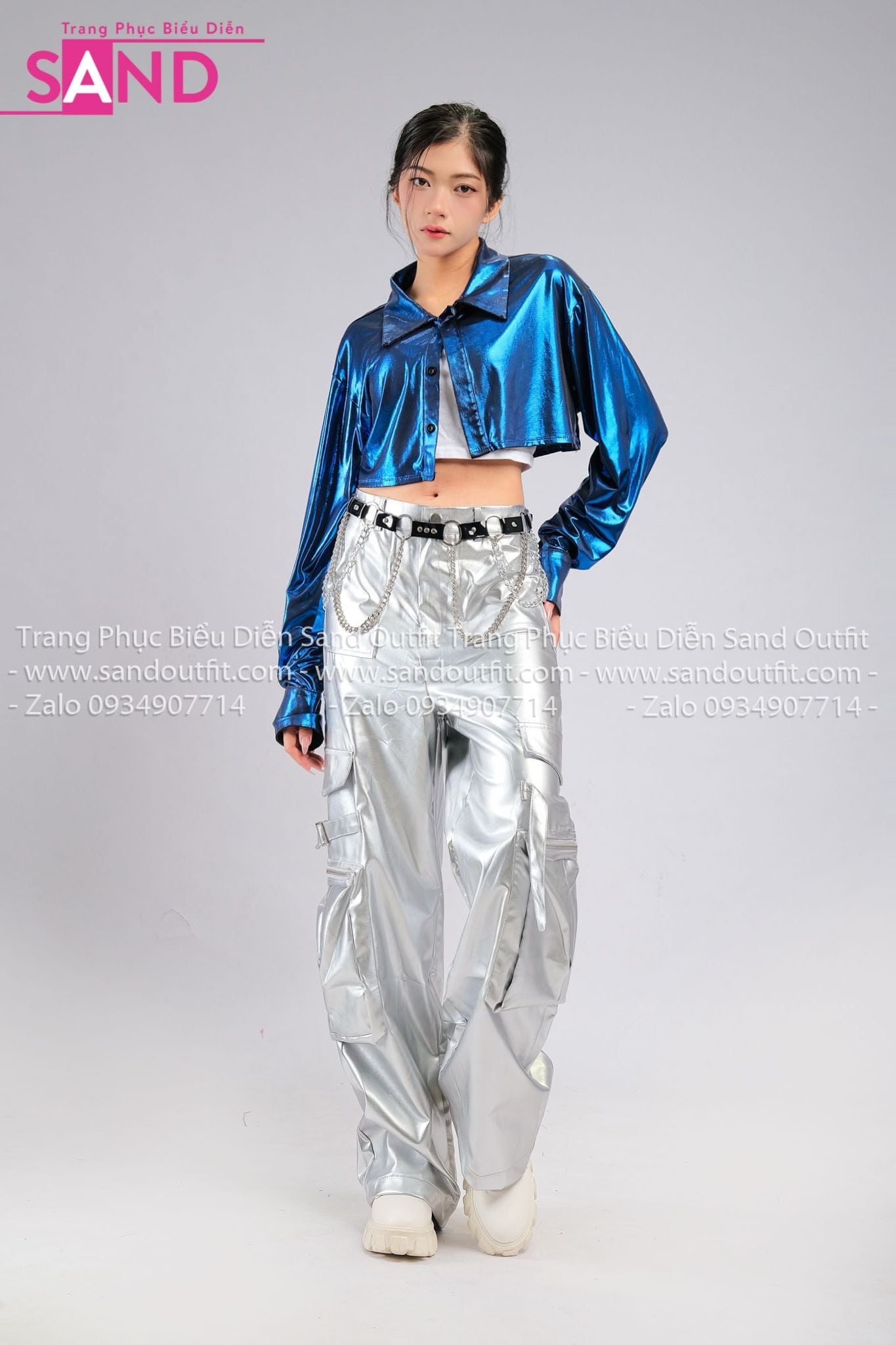 Outfit Phối Sẵn - (HAS0801 Áo Khoác Crop Cổ Sơ Mi Nhũ Xanh Dương phối HQD0203 Quần Suông Túi Hộp Bạc Form Cứng)