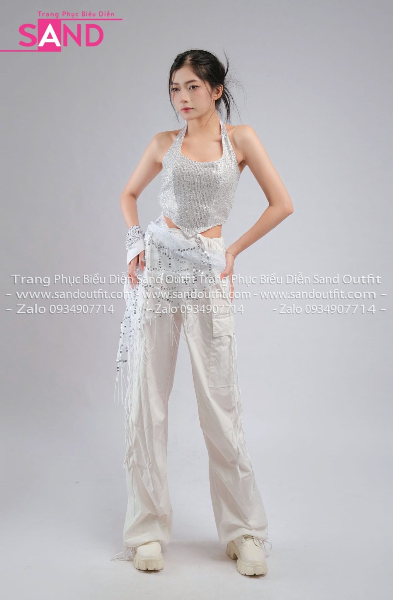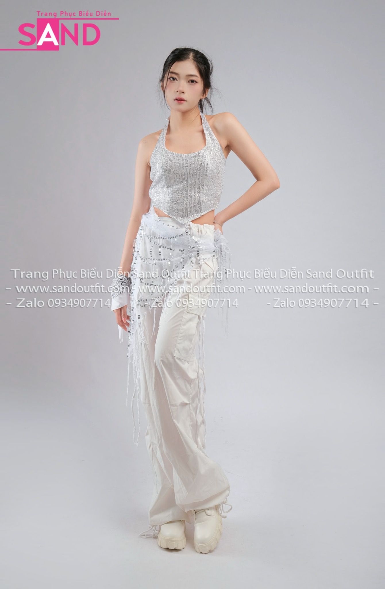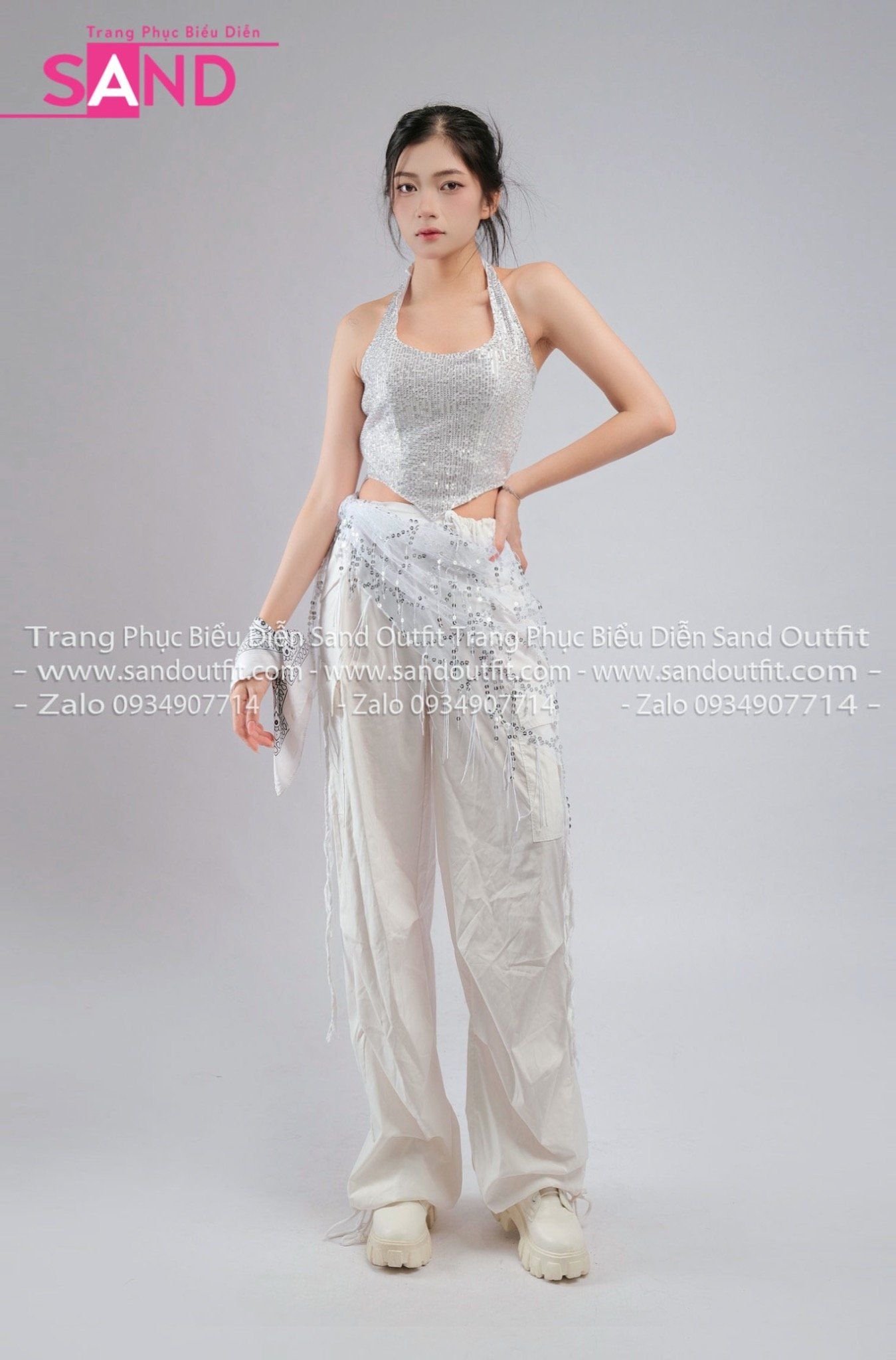 Outfit Phối Sẵn - (HAM0201 Áo Croptop Kim Sa Bạc Cổ Chữ U Hở Lưng phối HQN0002 Quần Dài Nắp Ngang Trắng Túi Hộp Phối Dây - PTB0003 Thắt Lưng Khăn Choàng Hông Sequin Tua Rua Trắng )