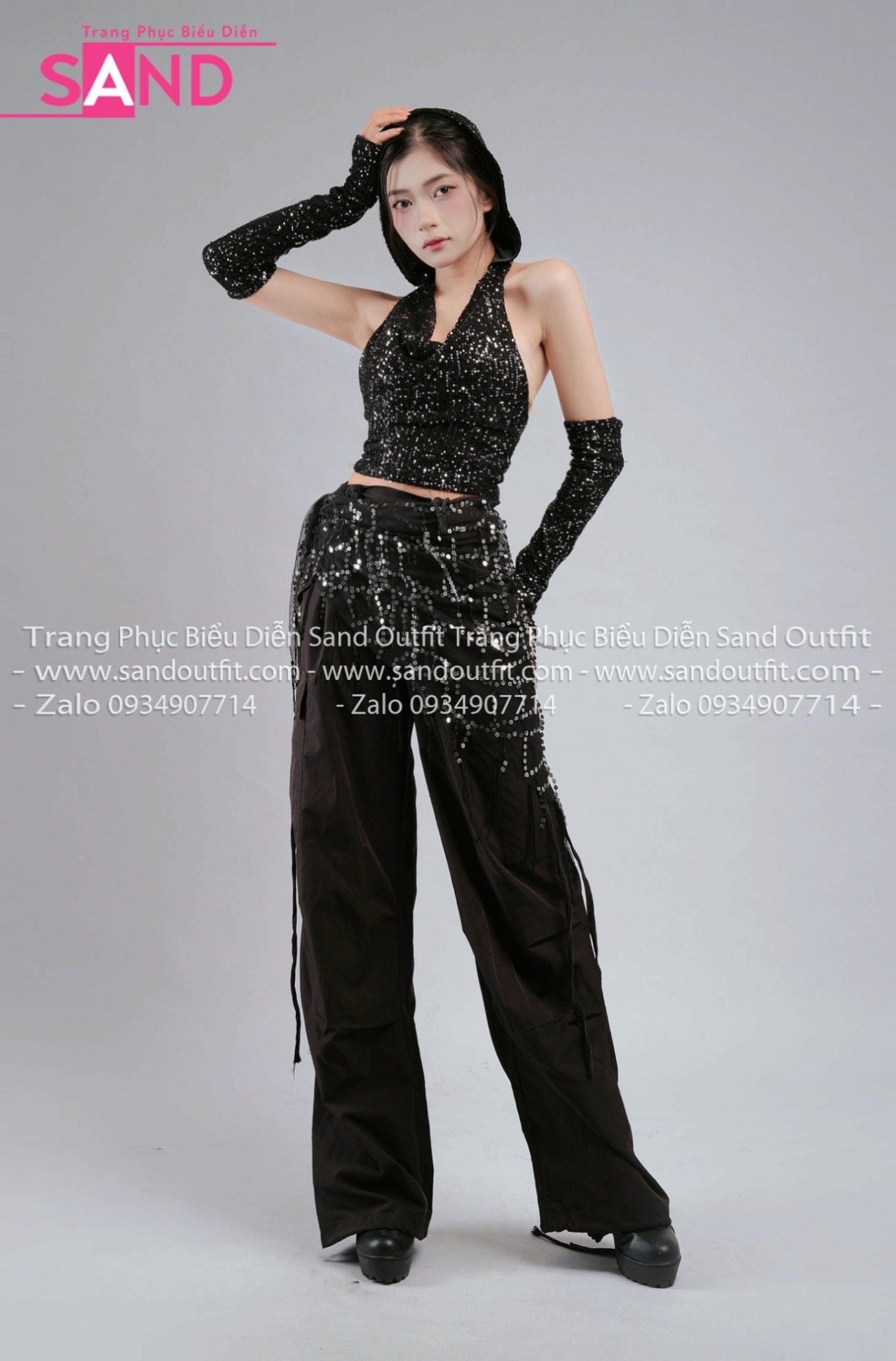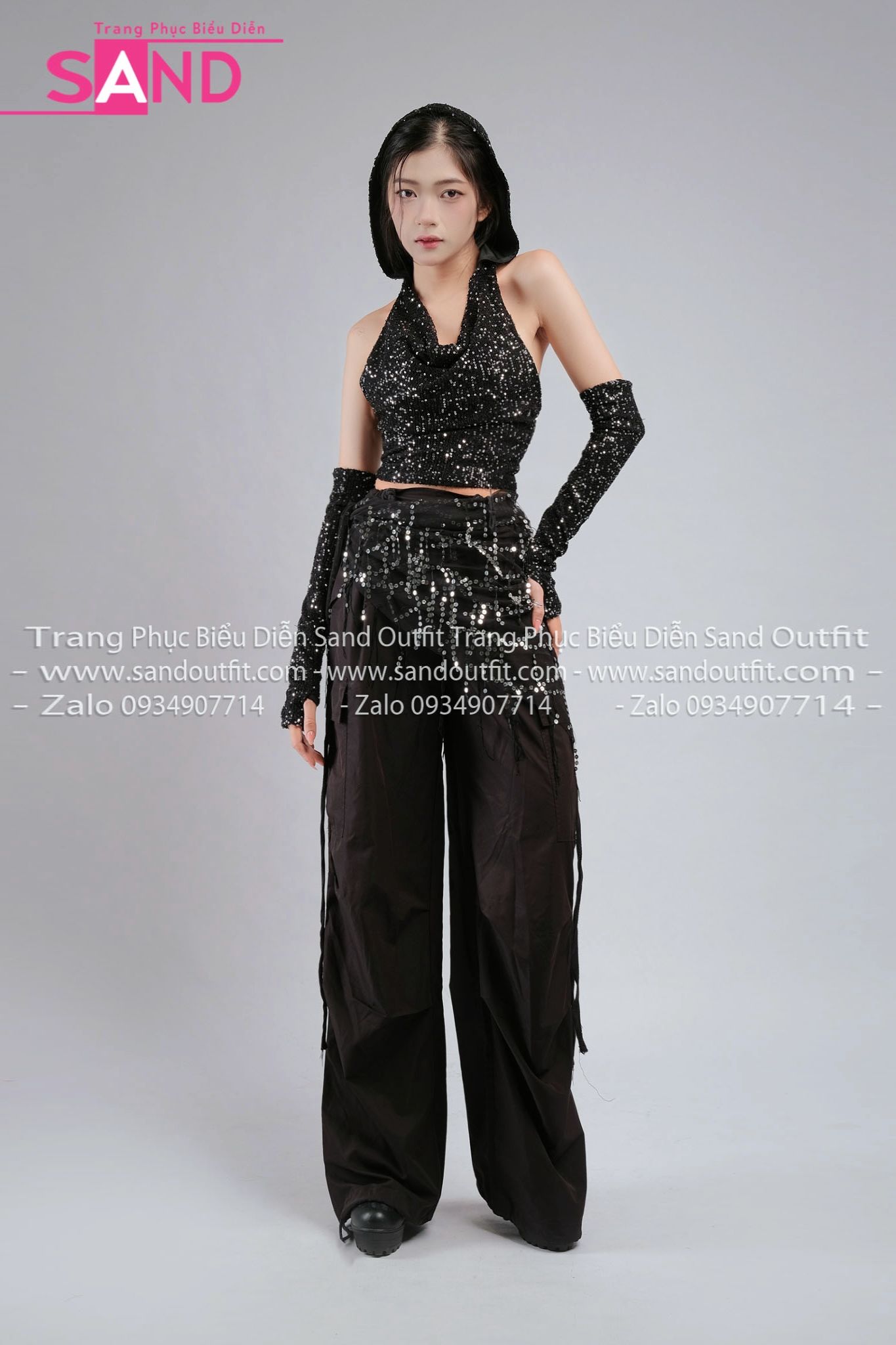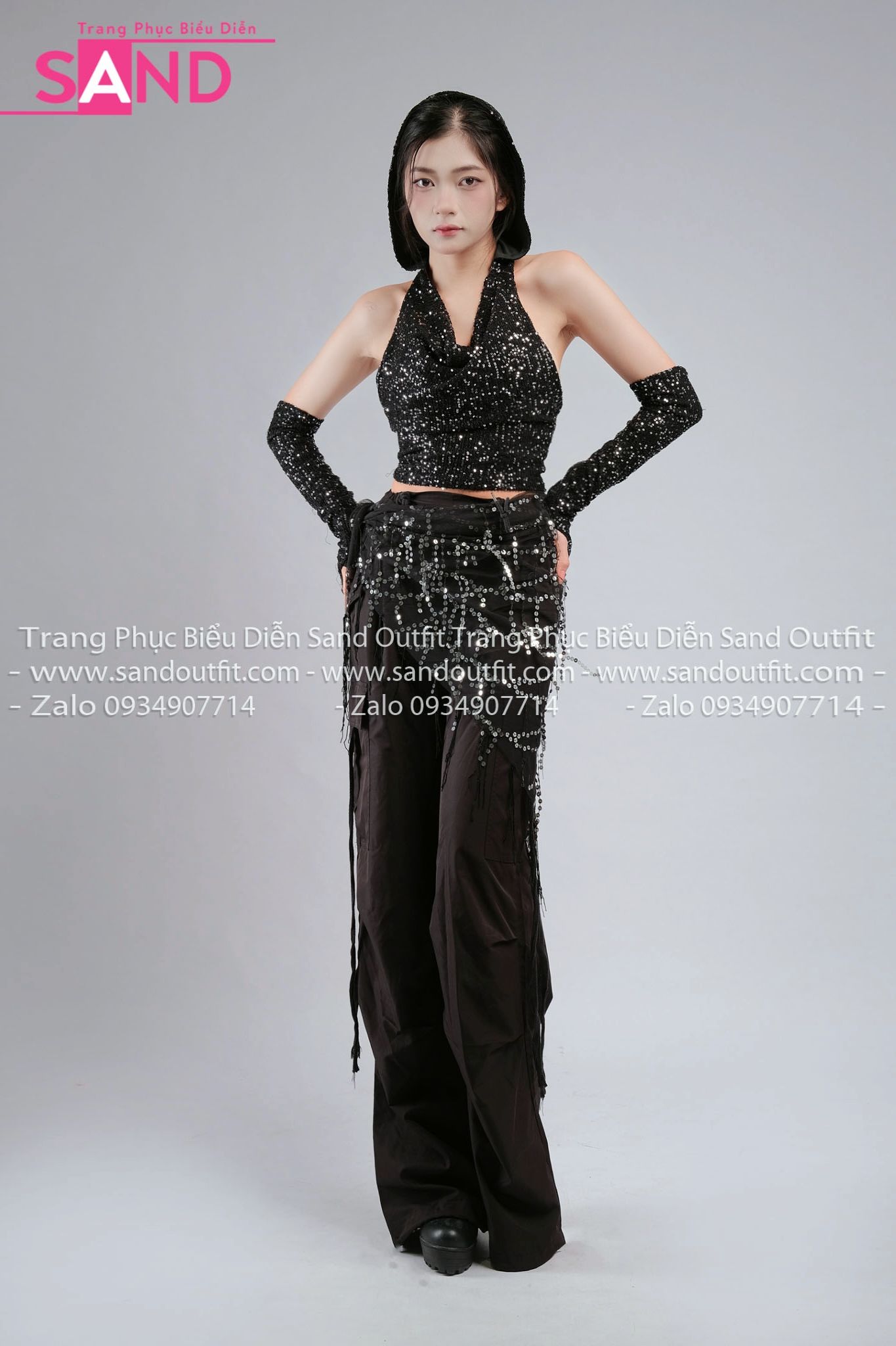 Outfit Phối Sẵn - (HAM0103 Áo Kim Sa Đen Mũ Trùm Kèm Bao Tay Kim Sa phối HQN0101 Quần Dài Đen Nắp Túi Hộp Ngang Phối Dây - PTB0102 Thắt Lưng Khăn Choàng Hông Sequin Tua Rua Đen )
