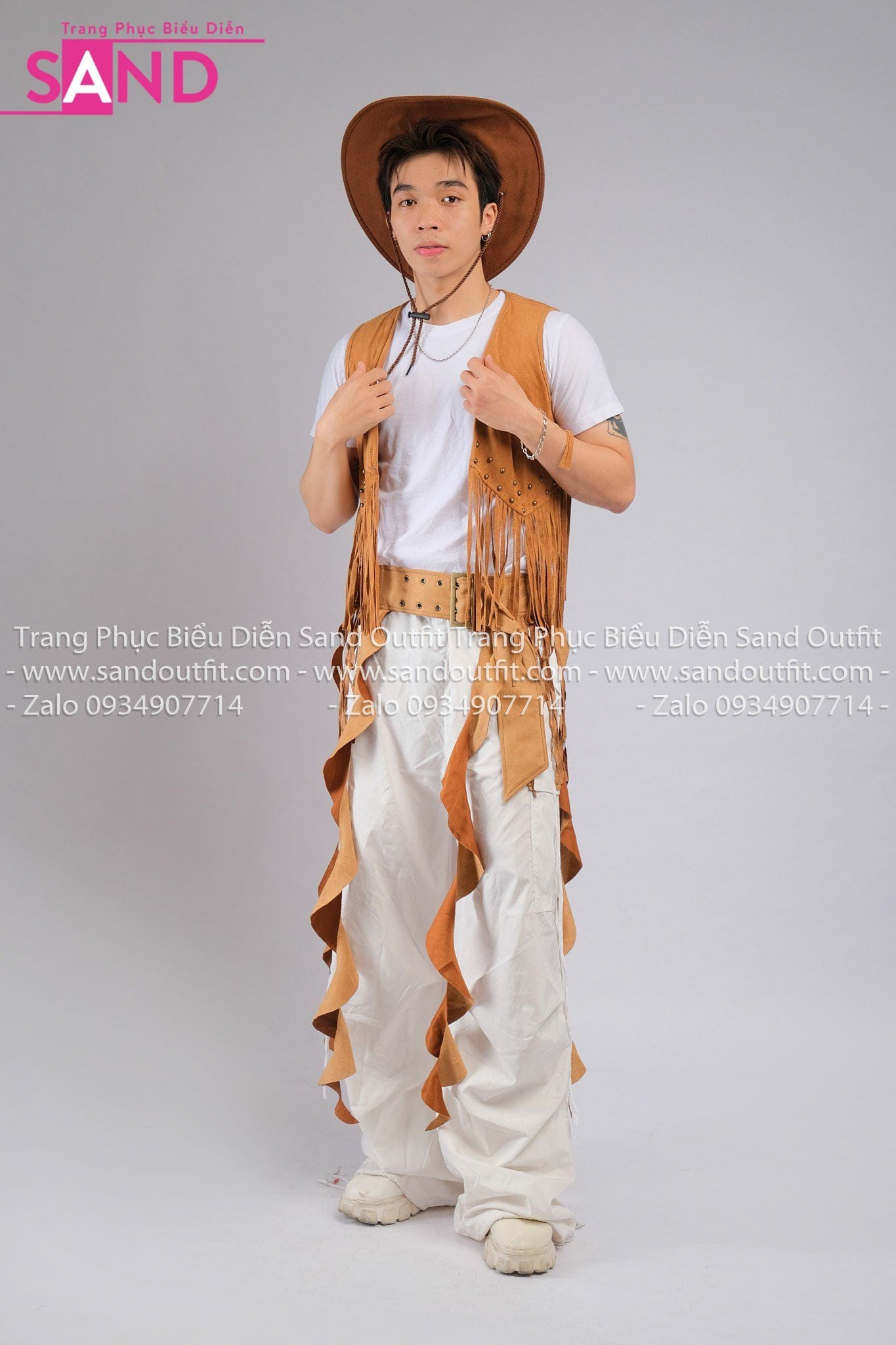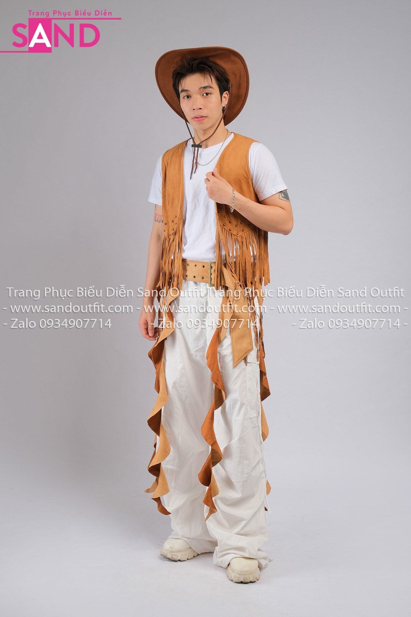 Outfit Phối Sẵn - (HAG1004 Áo Gile Tua Rua Nâu Mẫu 4 phối HQN0002 Quần Dài Nắp Ngang Trắng Túi Hộp Phối Dây - PND1002 Đai Nịt Thắt Lưng Tua Rua Nâu)