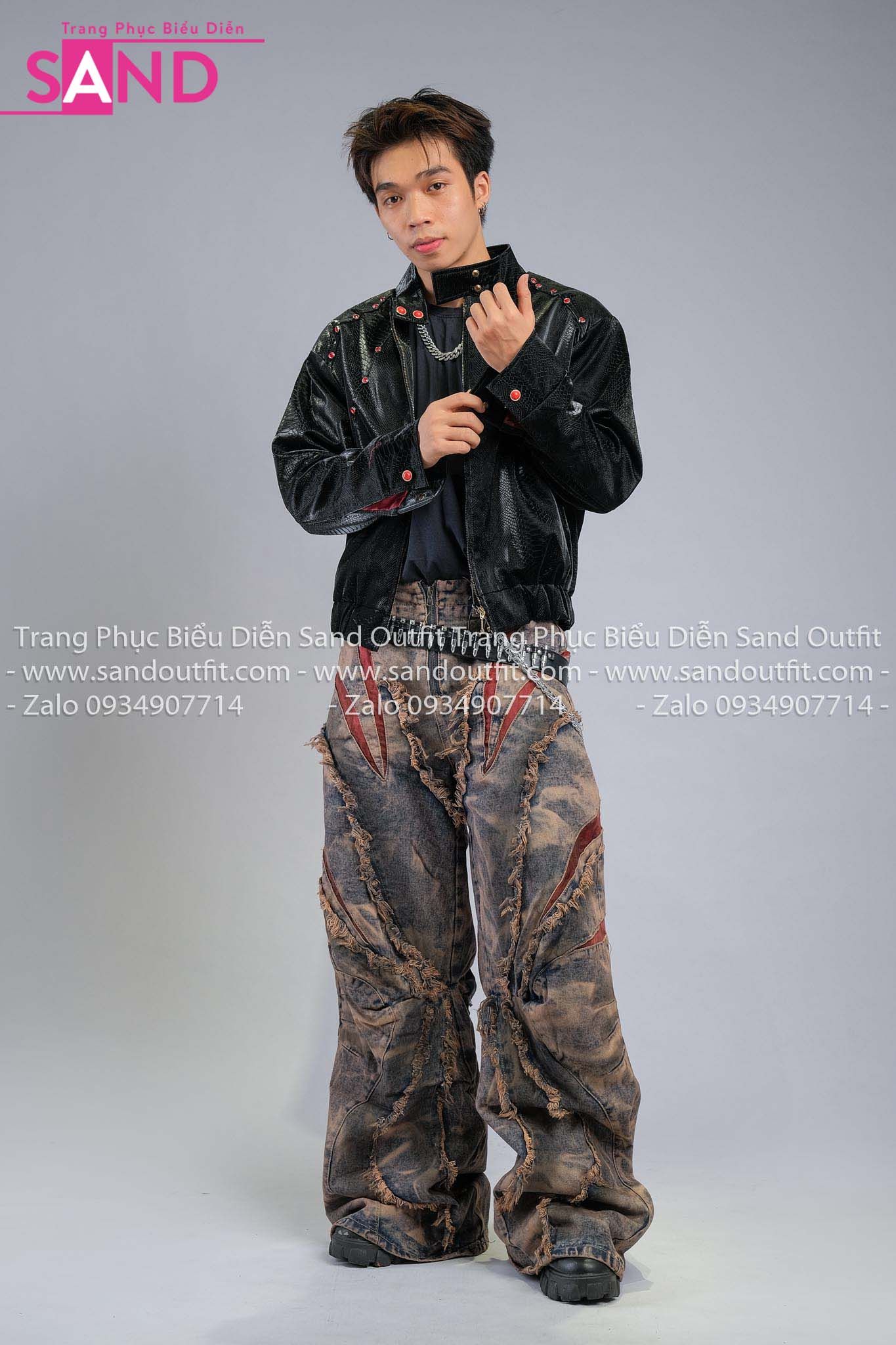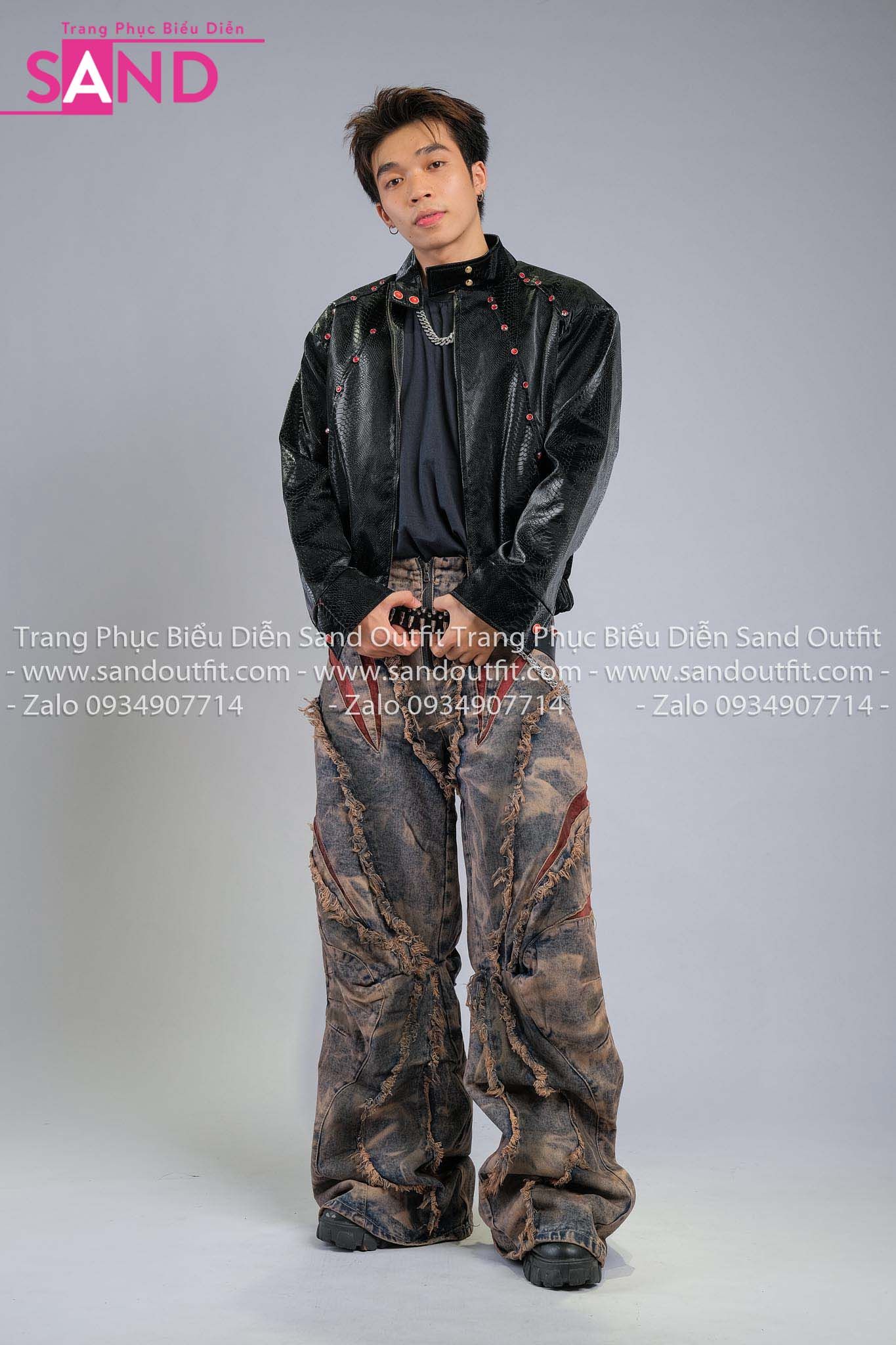 Outfit Phối Sẵn - (HAD0130 Áo Khoác Da Đính Đá Đỏ Nam - Đen phối HQB0820 Quần Jean Ống Rộng Phối Đỏ)