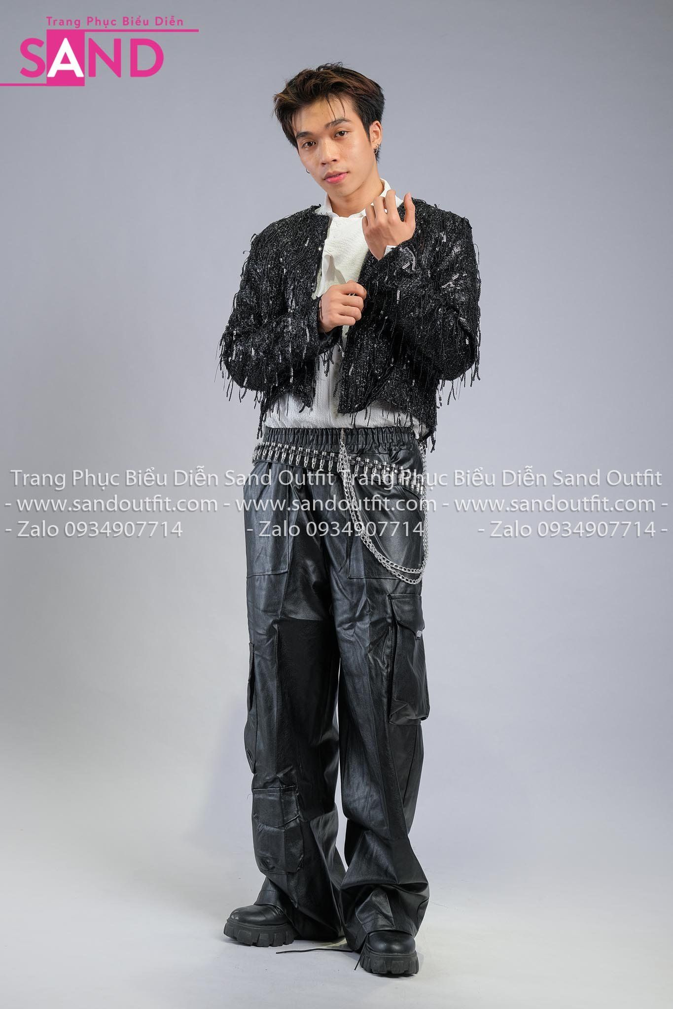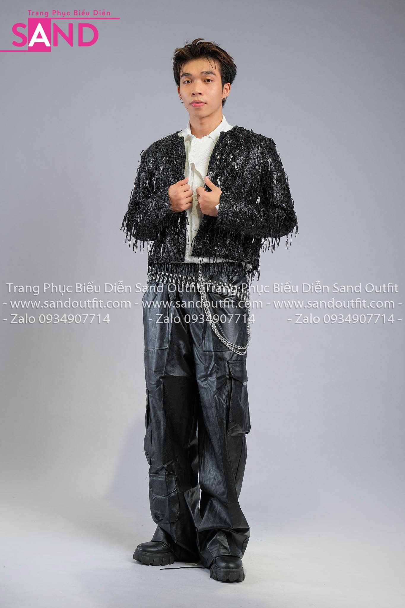 Outfit Phối Sẵn - (HAM0407 Áo Khoác Kim Sa Tua Rua Đen Nam phối HQA0106 Quần Da Suông Túi Hộp Nam - Đen)