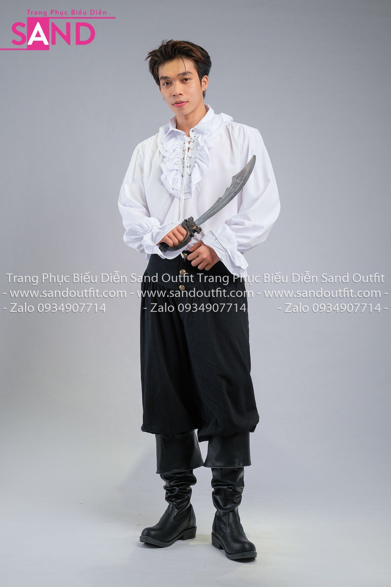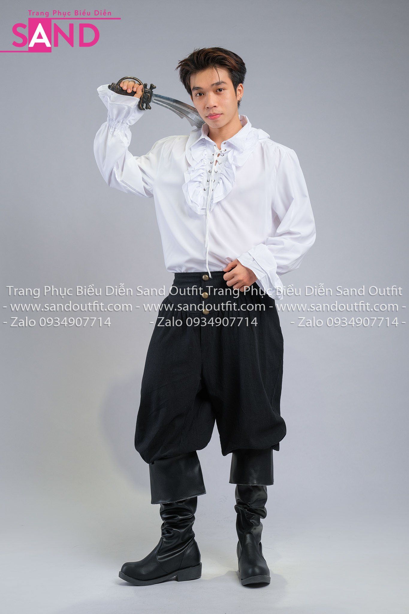 Outfit Phối Sẵn - (HAS0015 Áo Sơ Mi Cổ Bèo Trắng Hoàng Tử phối HQR0103 Quần Ống Rộng Cướp Biển Châu Âu Nam - Đen)