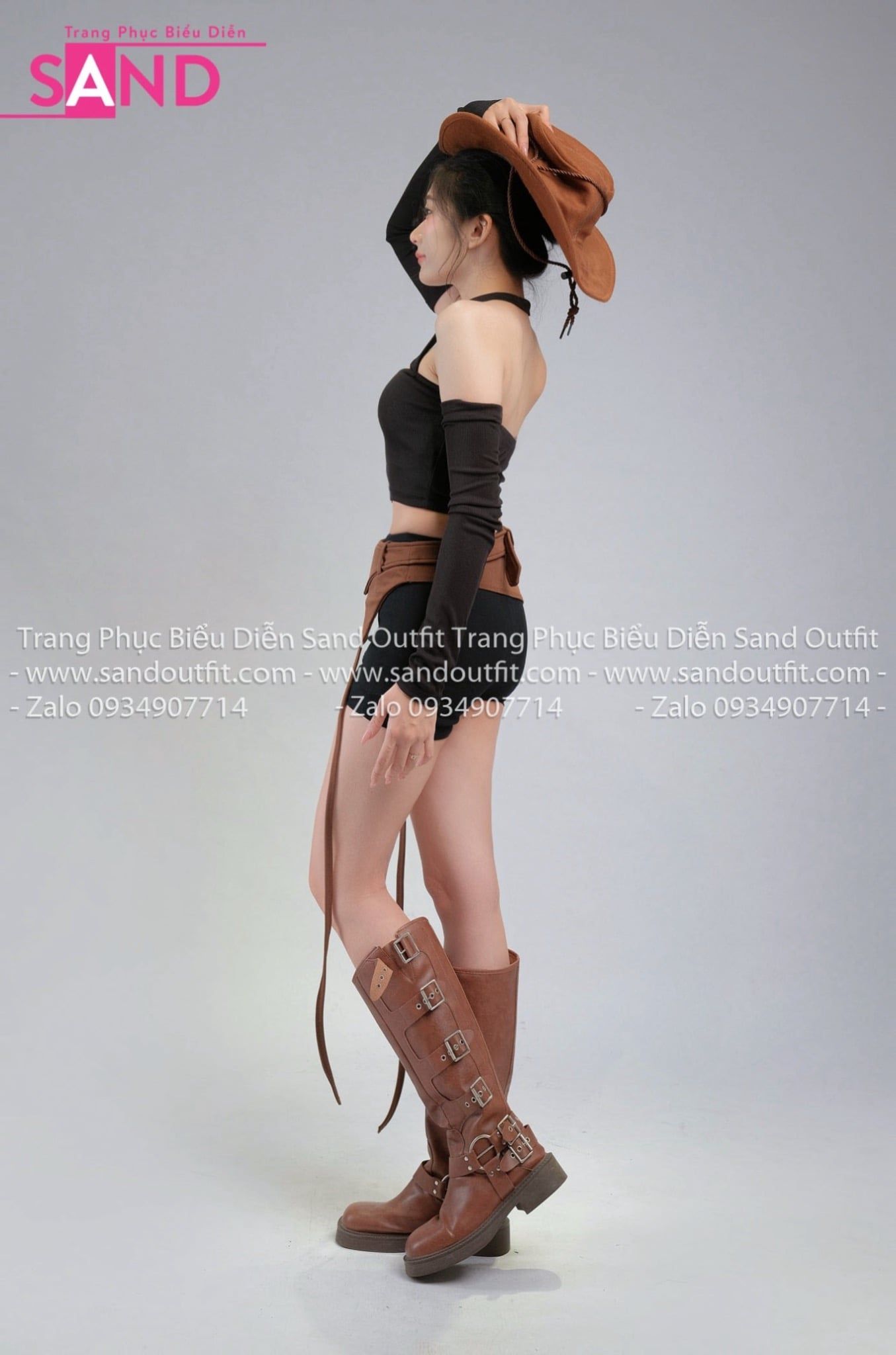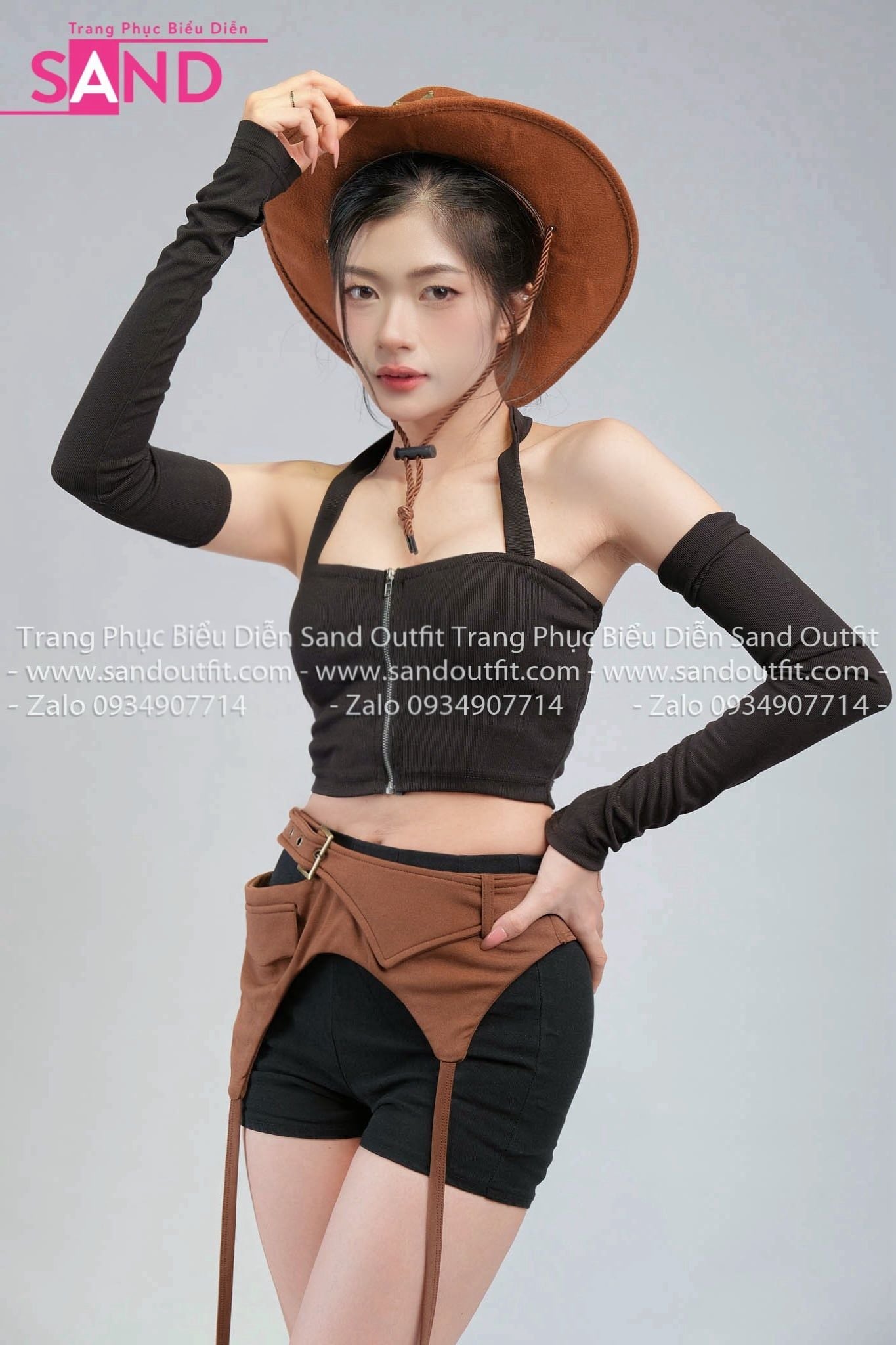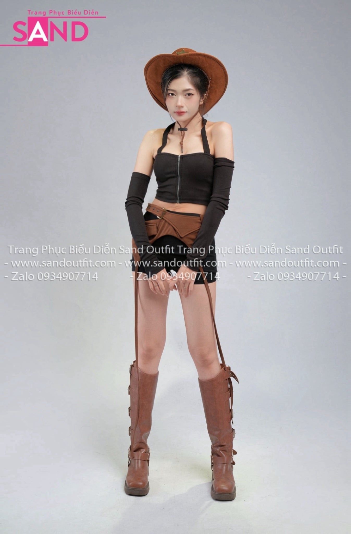 Outfit Phối Sẵn (Set Áo Croptop Đen Kèm Bao Tay phối PDB1002 Đai Thắt Lưng Nâu Phối Dây)