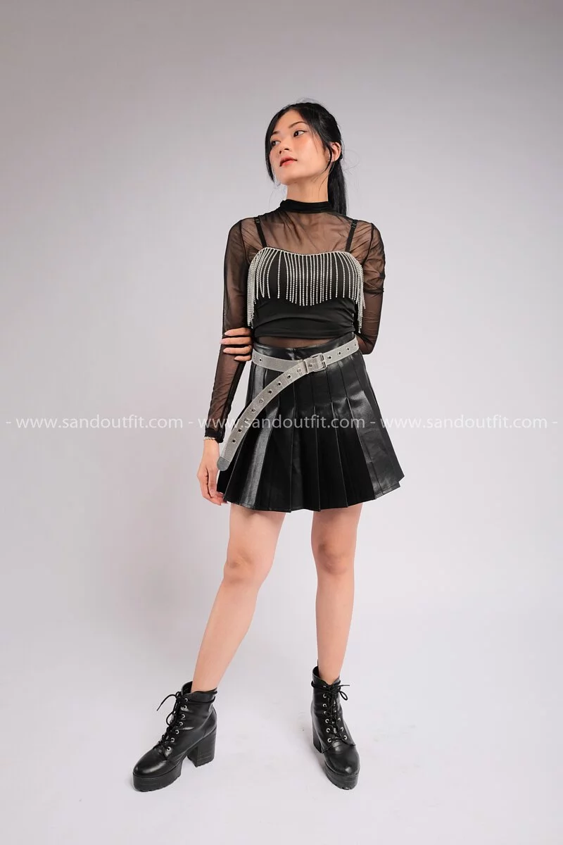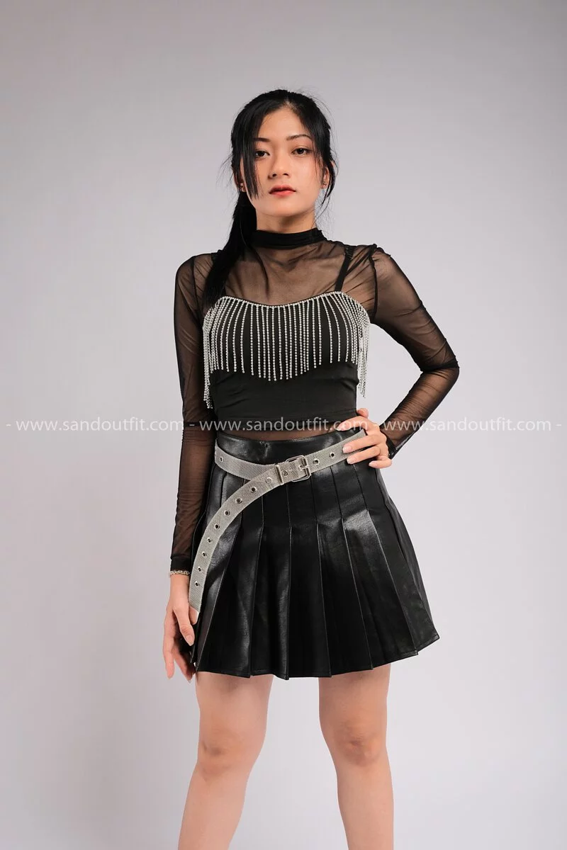 Outfit Phối Sẵn -(Chân Váy Xếp Li Da phối Áo Quây Đính Đá)