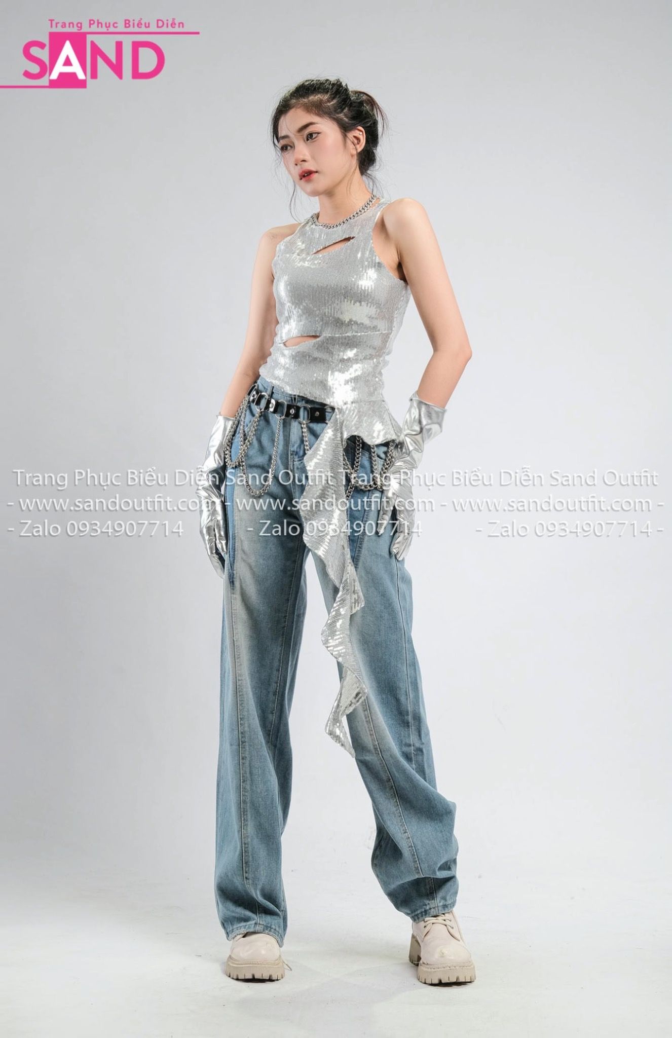 Outfit Phối Sẵn - ( HQB0819 Quần Jean Túi Hộp Ống Rộng Mẫu 19 phối HAM0202 Áo Croptop Kim Sa Ánh Kim Bạc Không Tay Tua Tua)