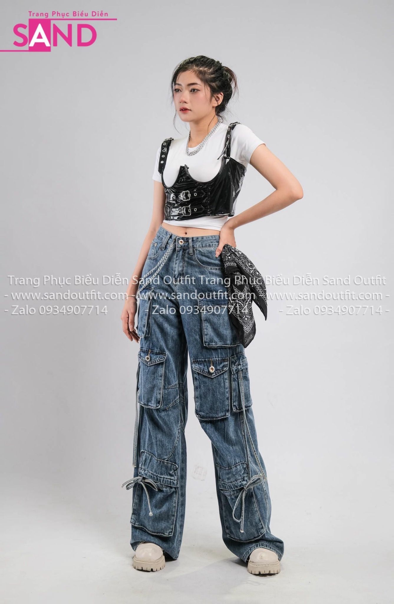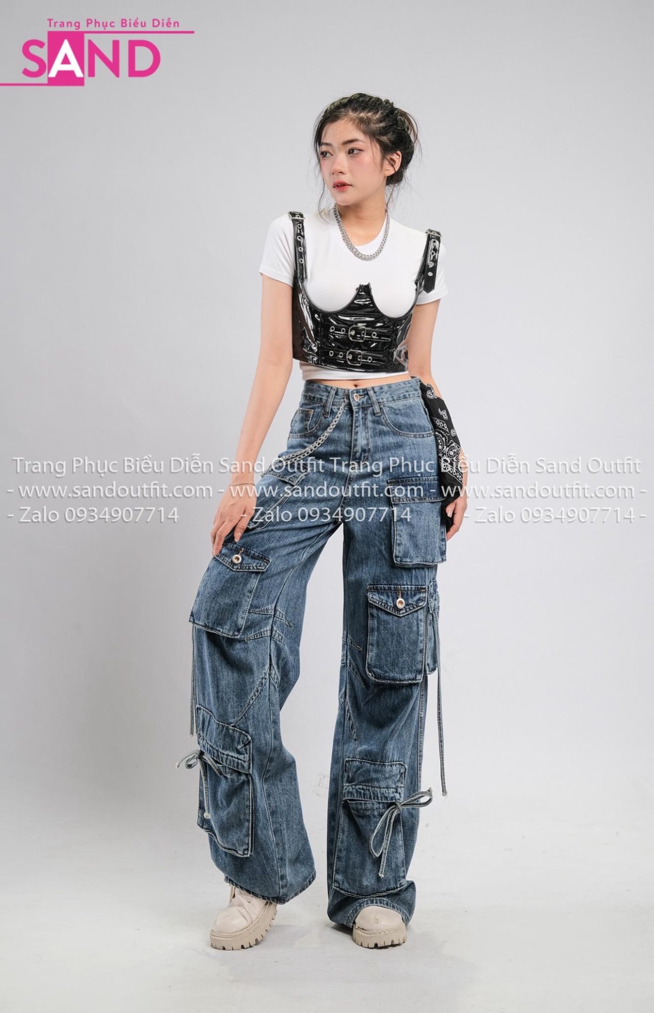 Outfit Phối Sẵn - ( HQB0802 Quần Jean Túi Hộp Ống Rộng Mẫu 2 phối PDN0102 Corset Da Khóa Gài Phối Dây Kéo - Đen)