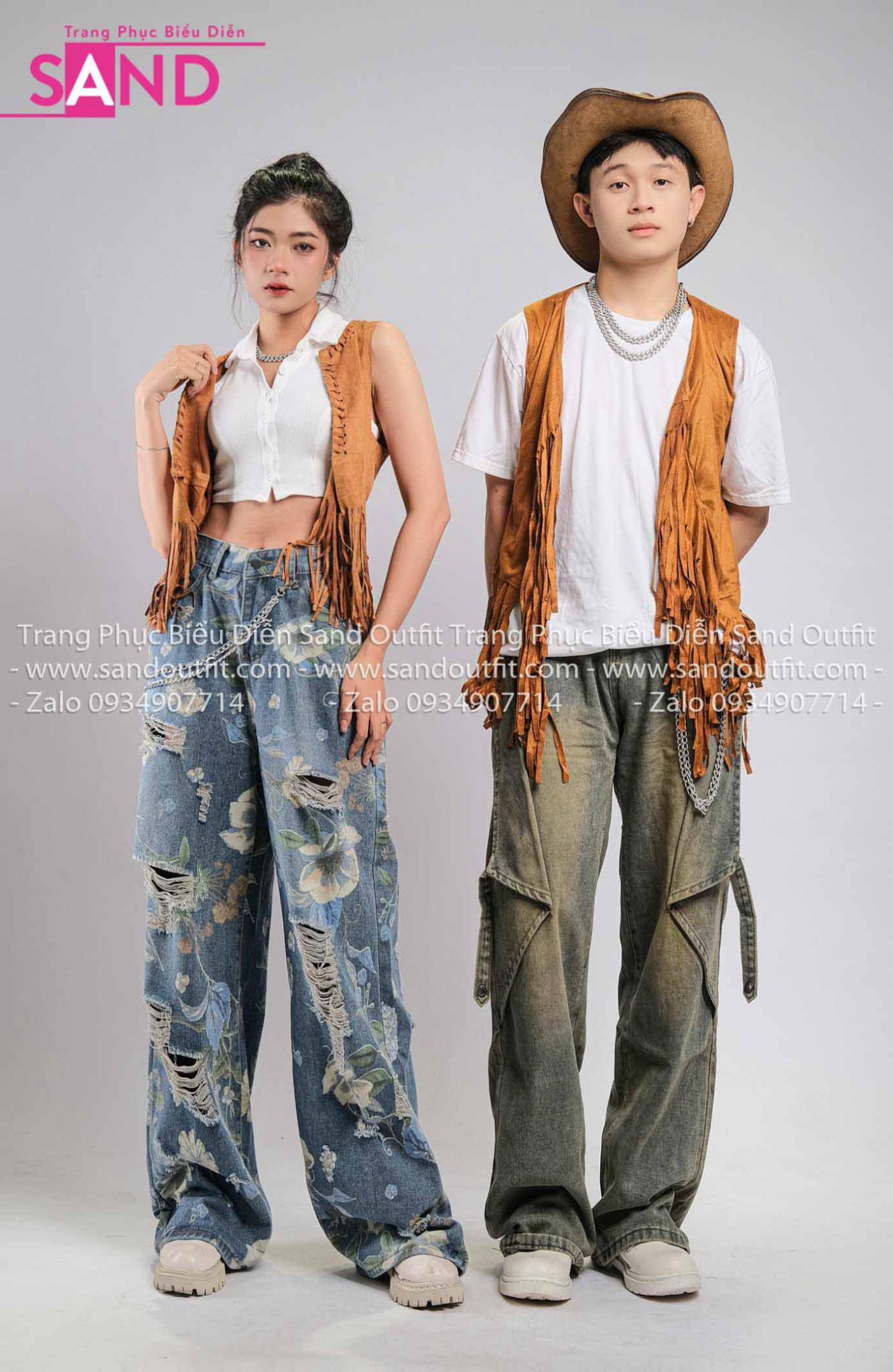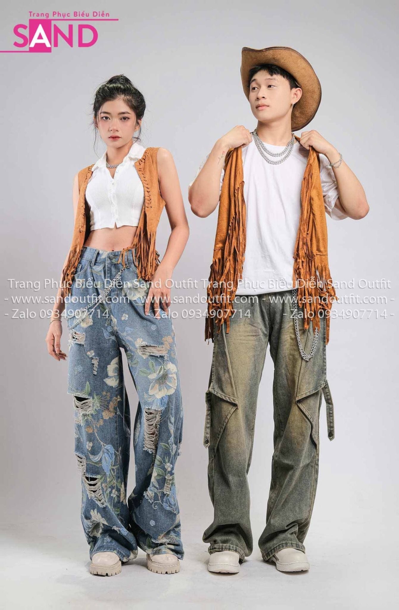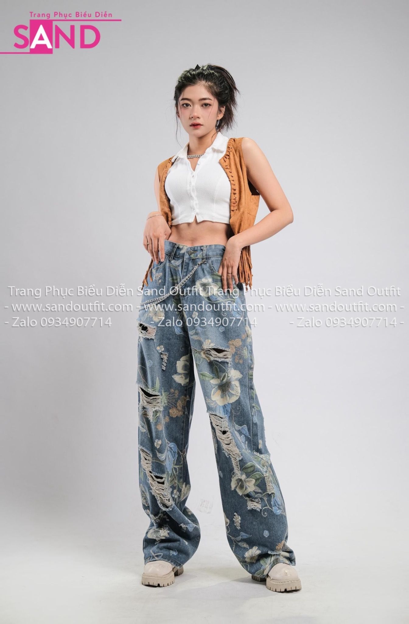 Outfit Phối Sẵn - (HQB0810 Quần Jean Túi Hộp Ống Rộng Họa Tiết Hoa Mẫu 10 phối HAG1003 Áo Gile Tua Rua Nâu Mẫu 3)
