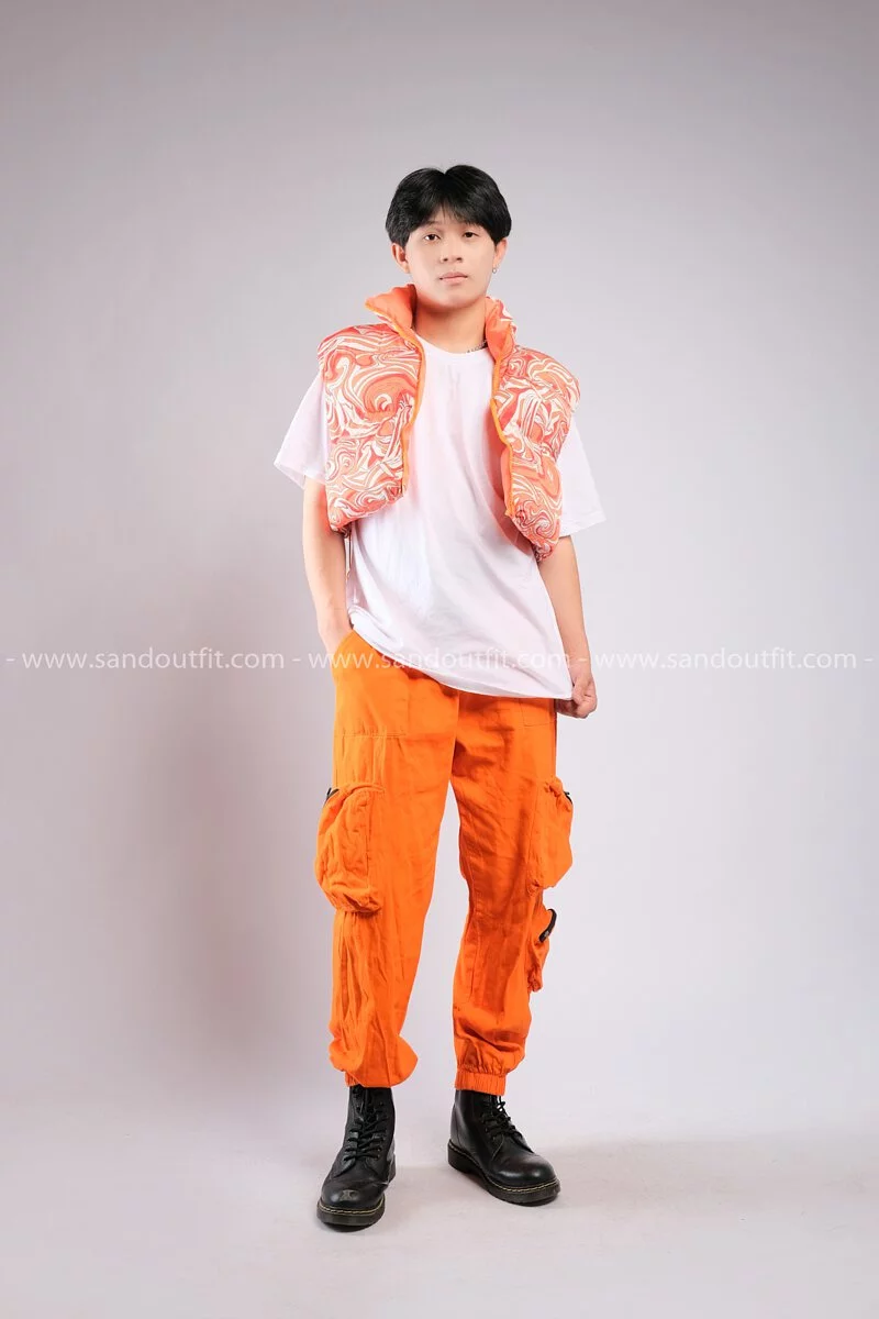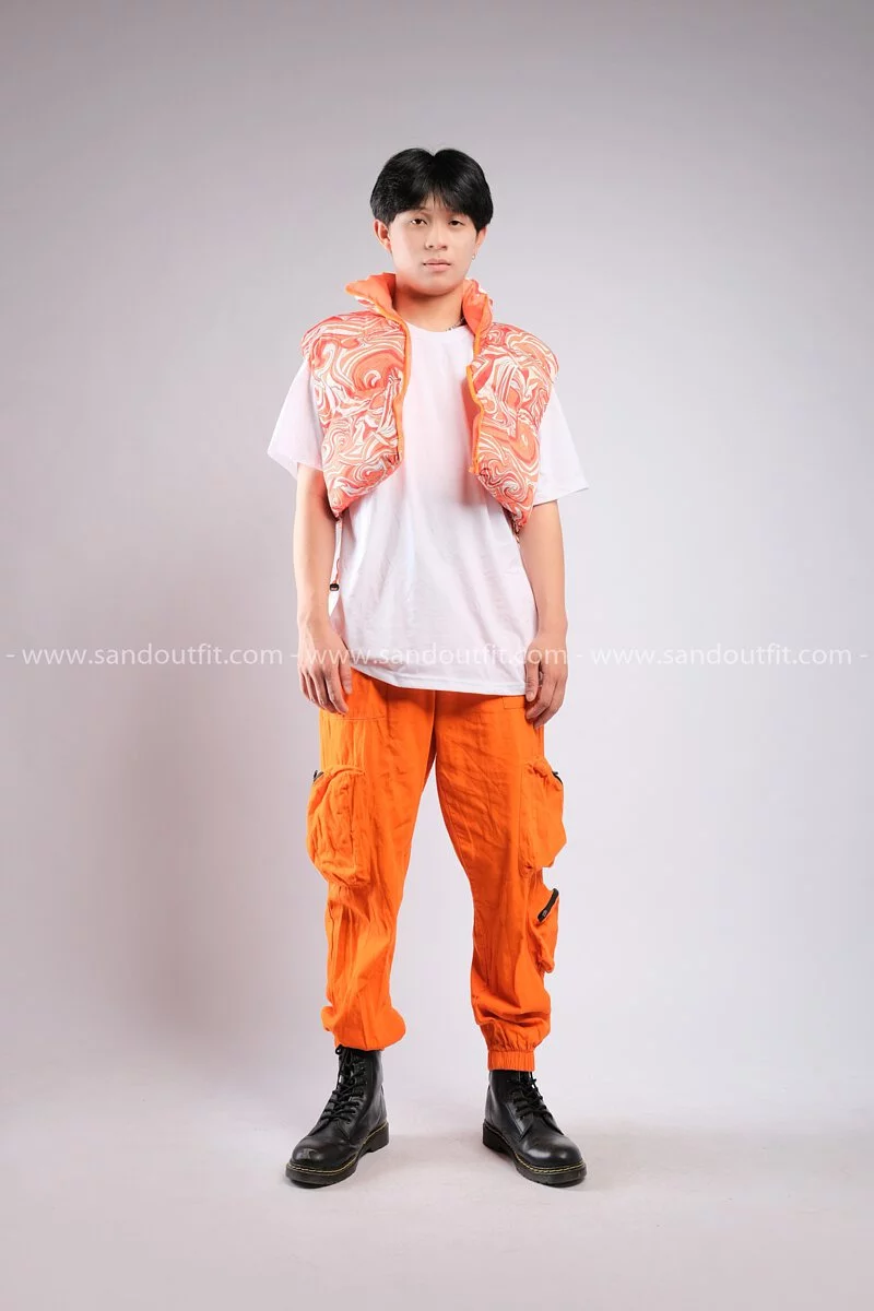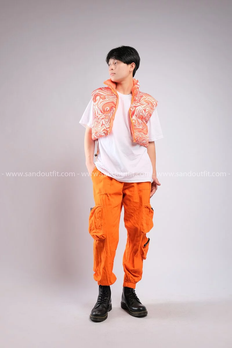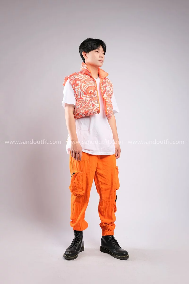 Outfit Phối Sẵn - (Quần jogger kaki túi hộp Cam 4 túi phối HAP0603 Áo khoác Gile phao croptop không tay họa tiết màu loang - Cam)