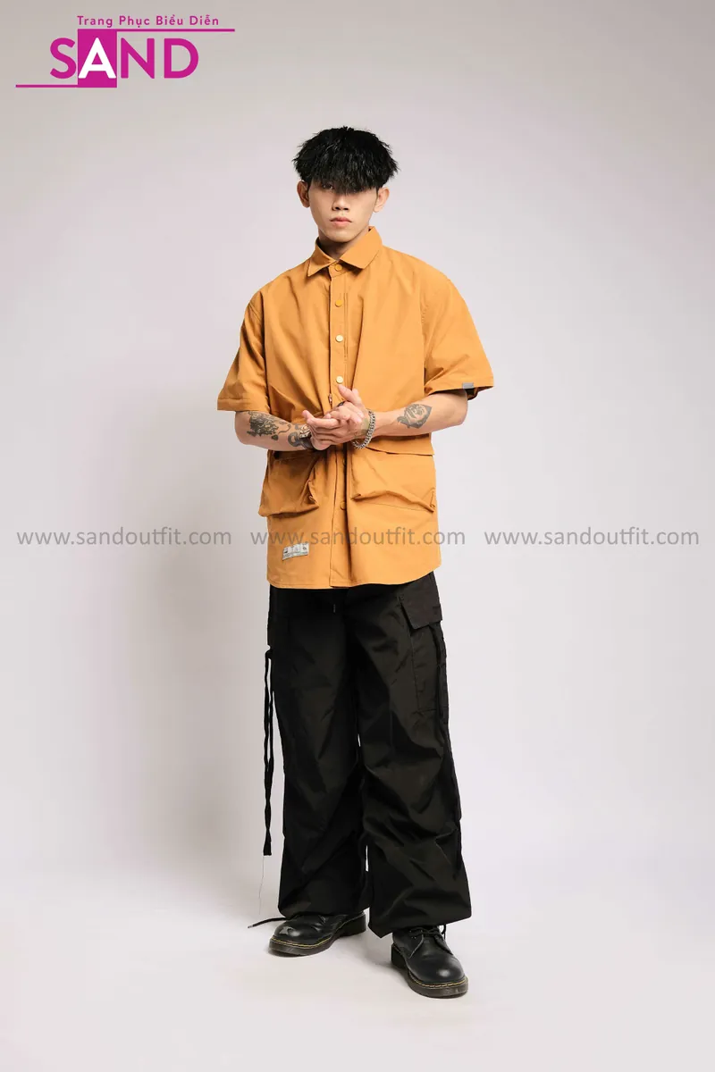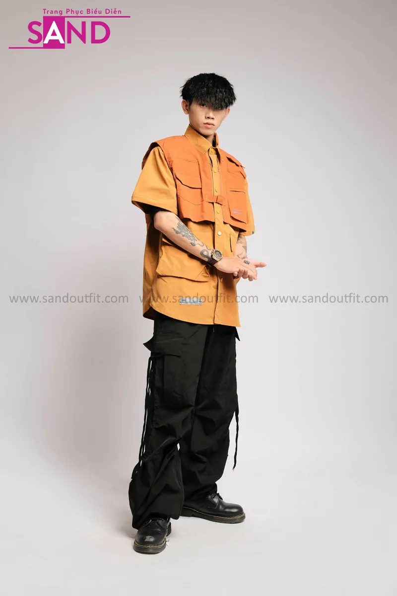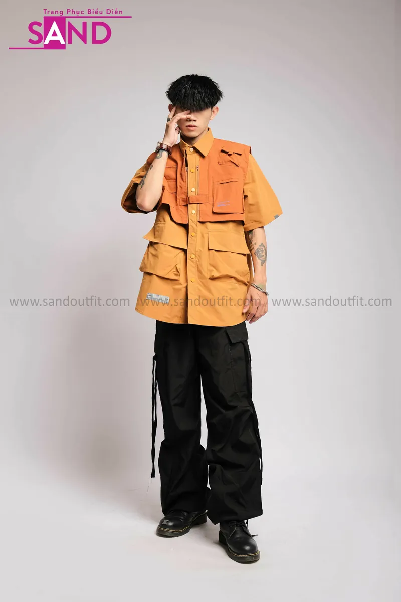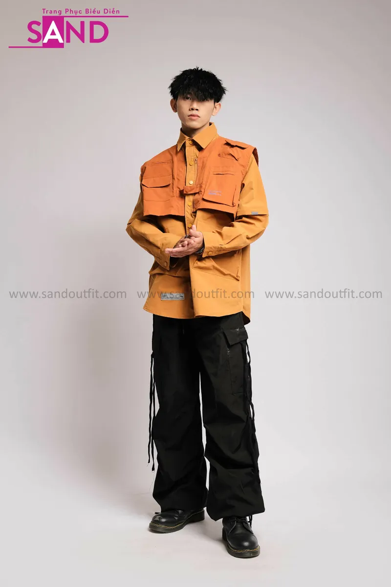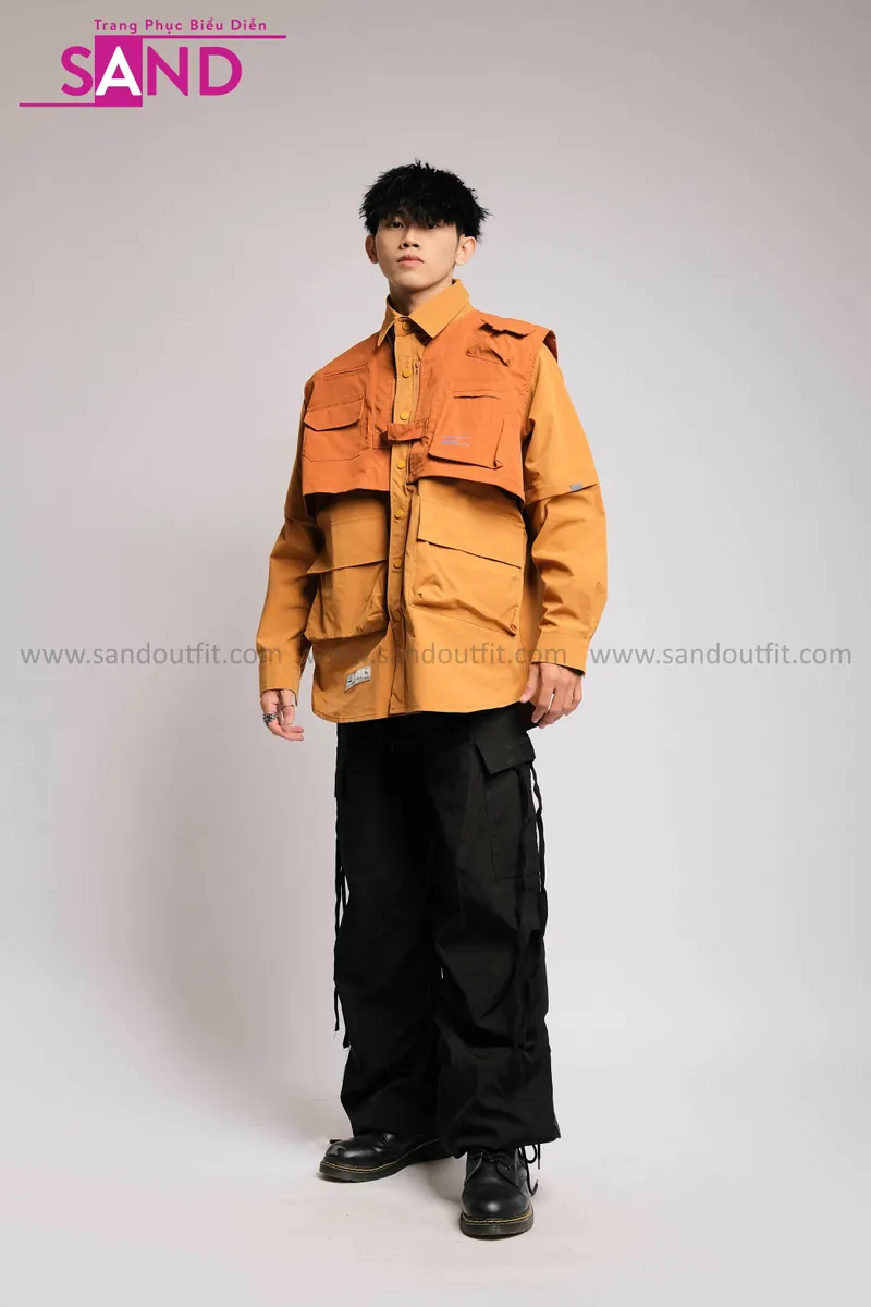 Outfit Phối Sẵn - (HQN0101 Quần Dài Đen Nắp Túi Hộp Ngang Phối Dây phối HAS1001 Áo Sơ Mi Dài Tay Phối Gile Rời Túi Hộp - Nâu)