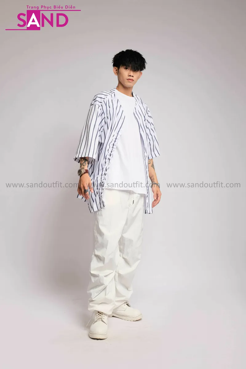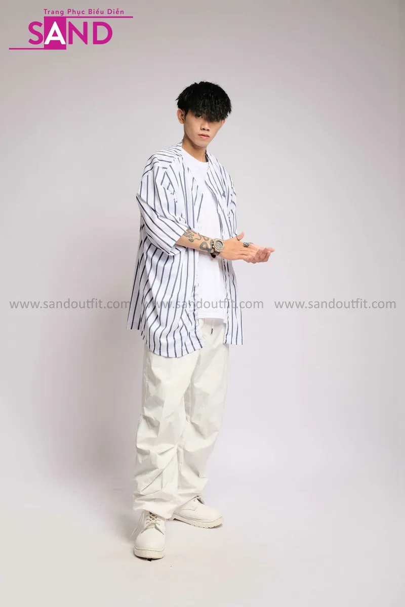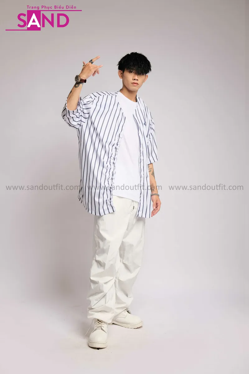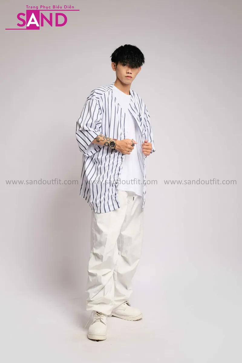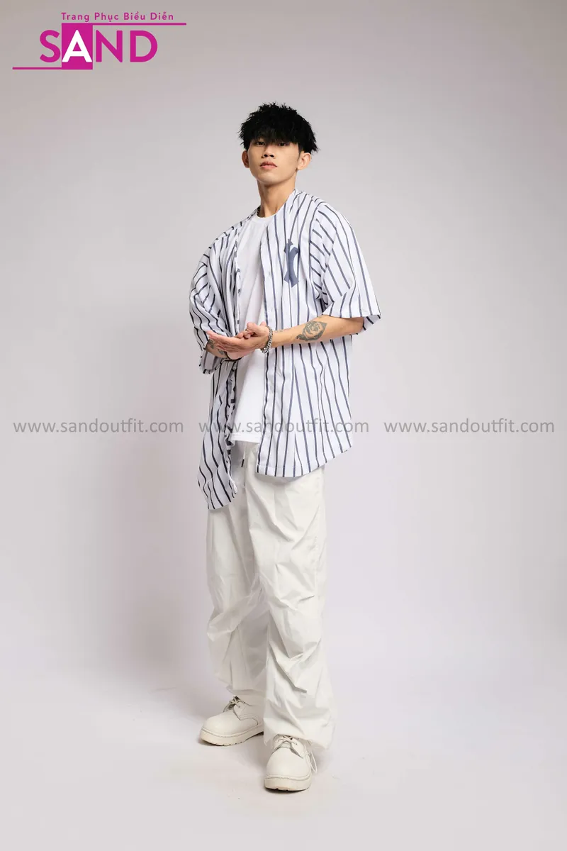 Outfit Phối Sẵn - (HQN0002 Quần Dài Trắng Nắp Túi Hộp Ngang Phối Dây phối Áo Bóng Chày Sọc Xanh)