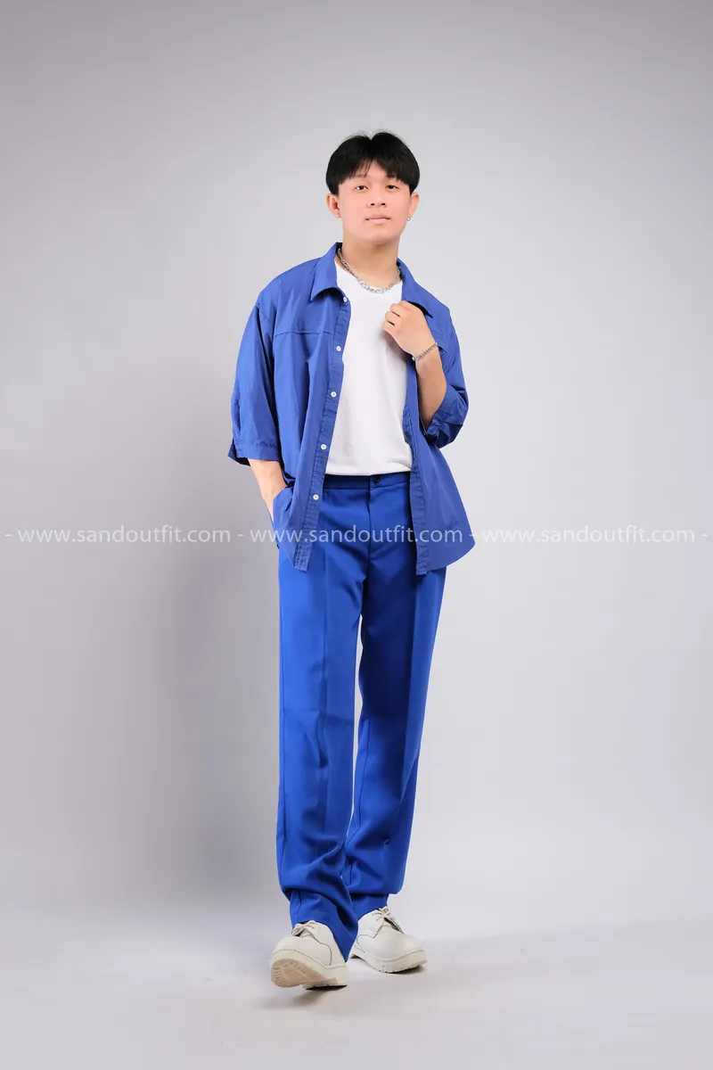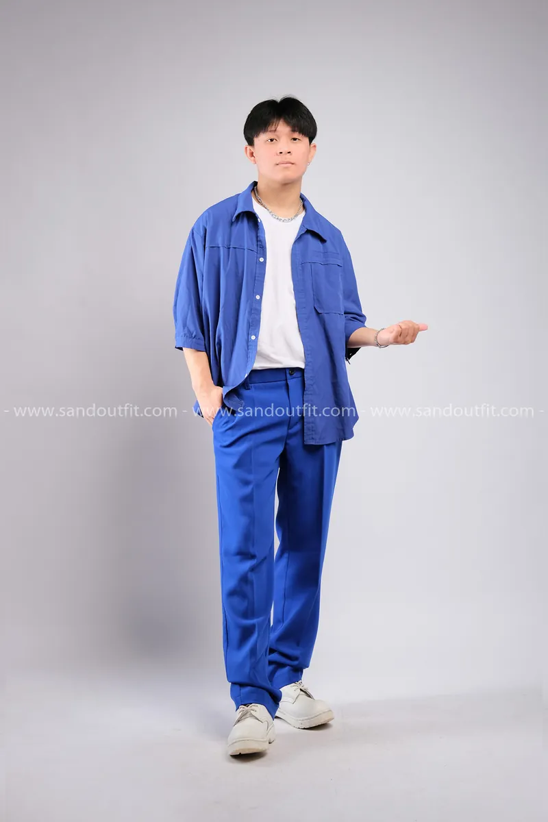 Outfit Phối Sẵn - (Quần Ống Suông Xanh Dương phối Sơmi Tay Lửng)