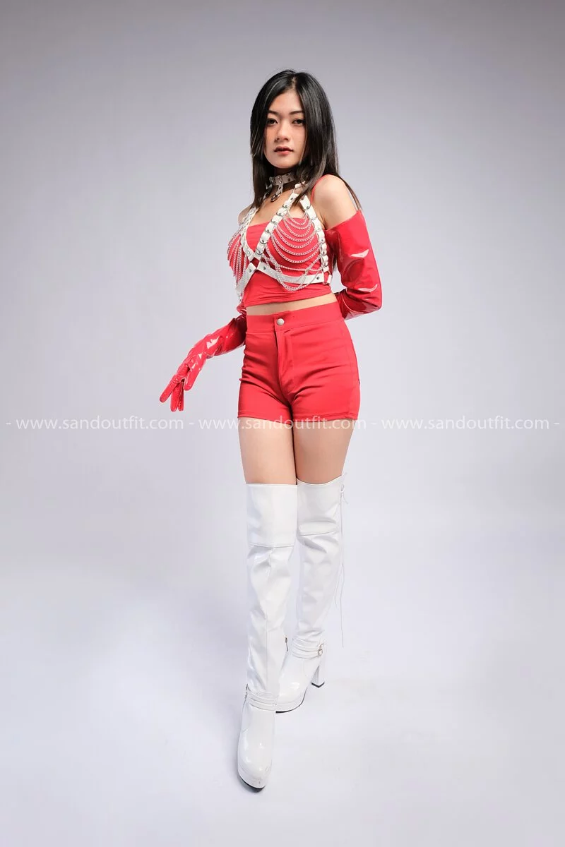 Outfit Phối Sẵn - (Quần Short Thun Đỏ phối Đai Ngực Da Phối Xích)