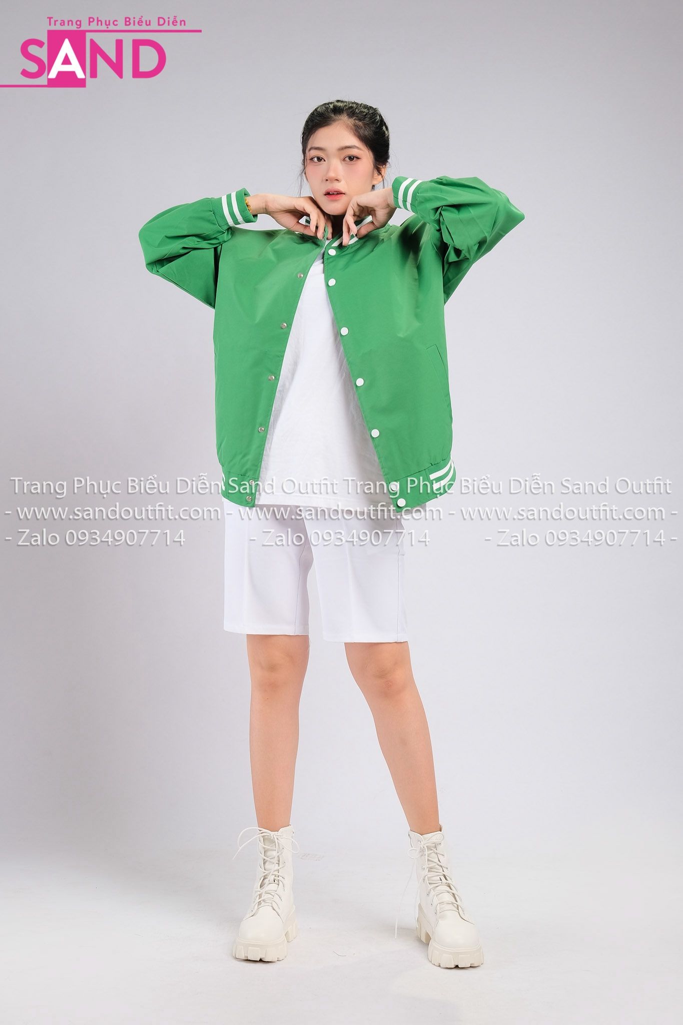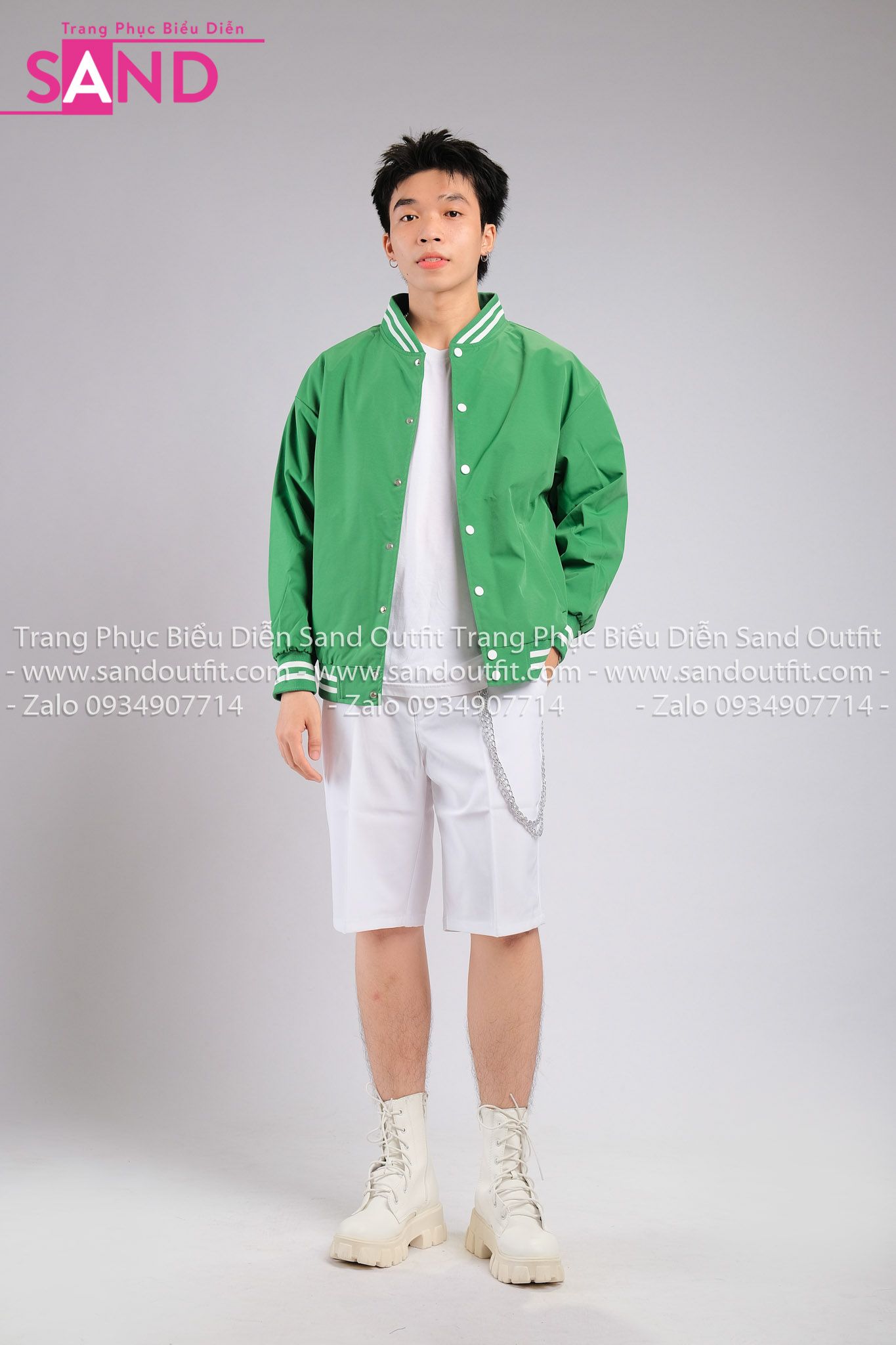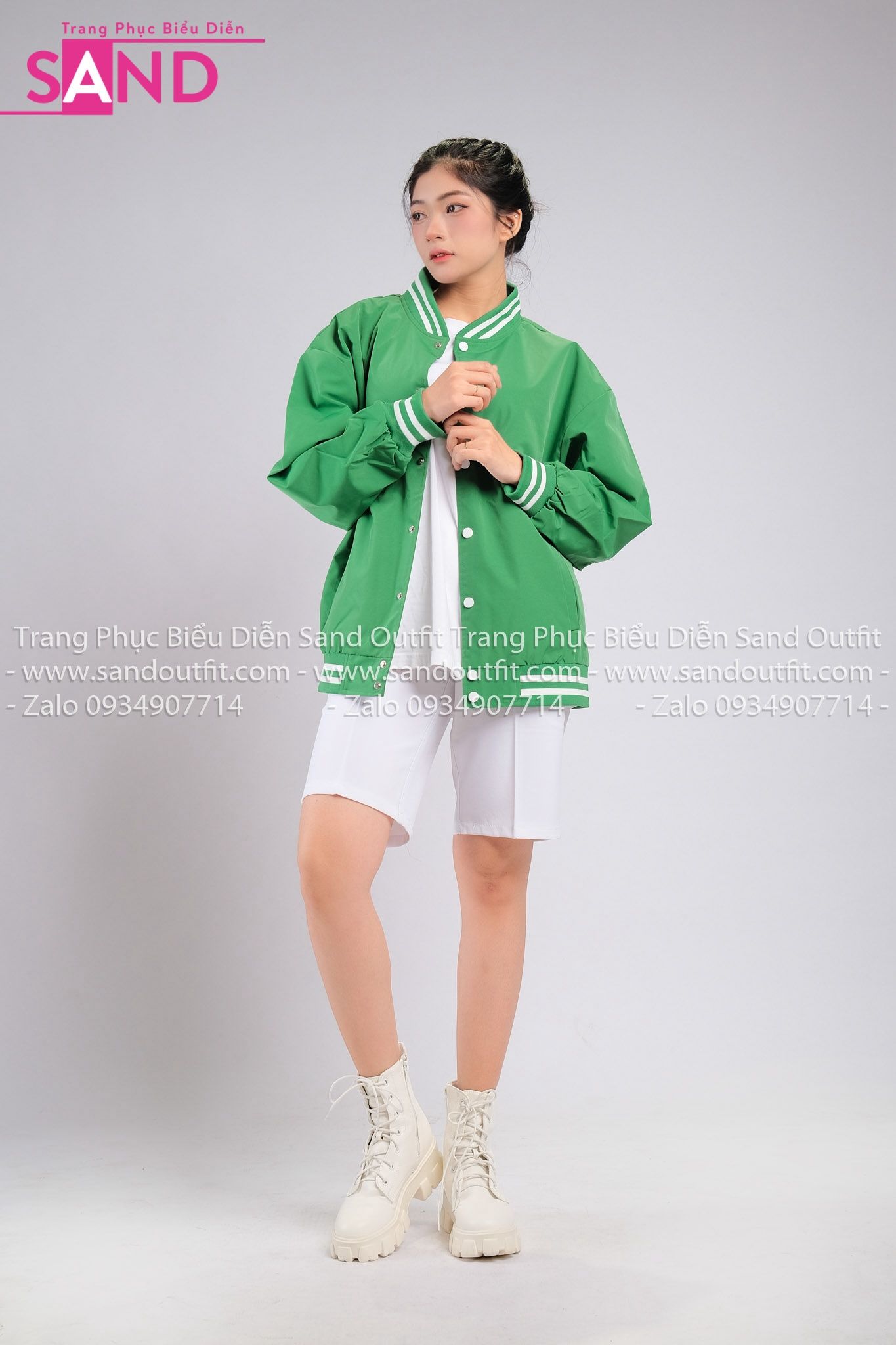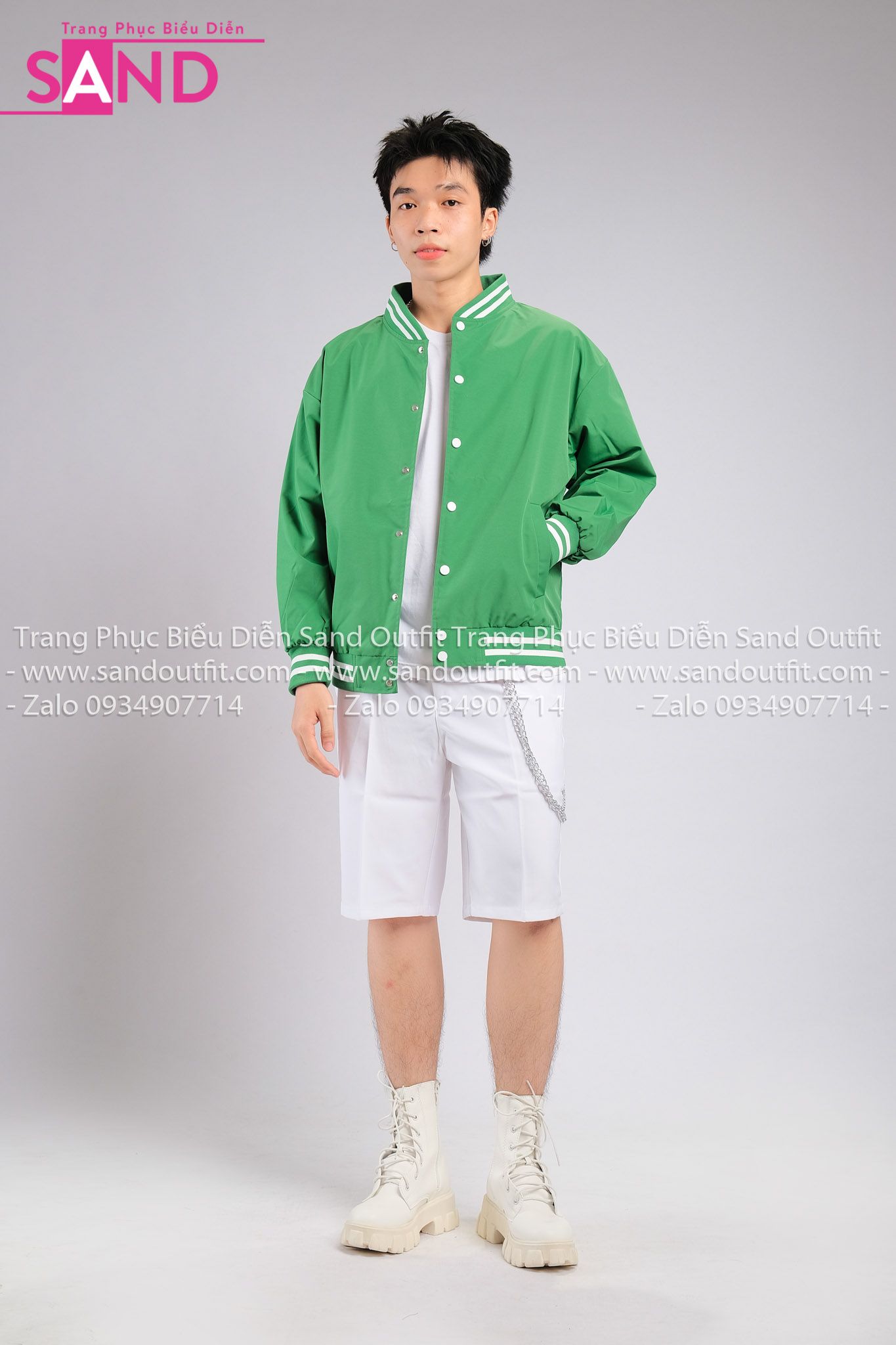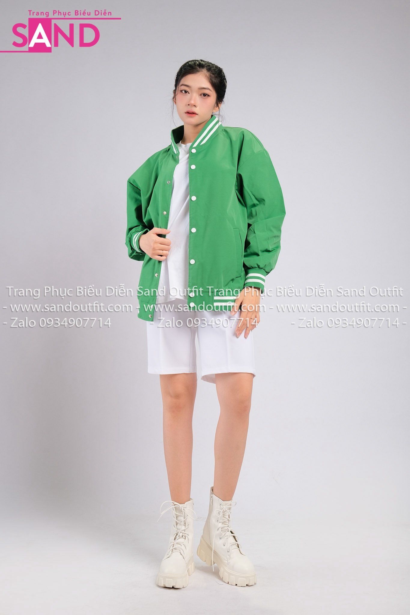 Outfit Phối Sẵn - ( HST0001 Quần Short Trắng Form Rộng Nam phối HAK0903 Áo Khoác Bomber Bóng Chày Viền Trắng Xanh Lá))
