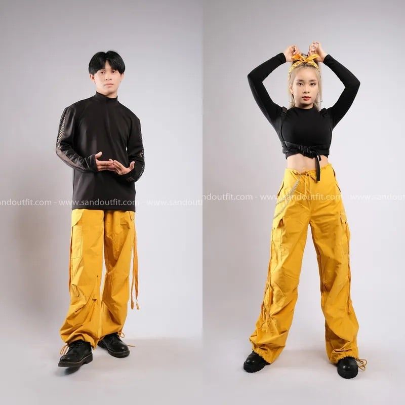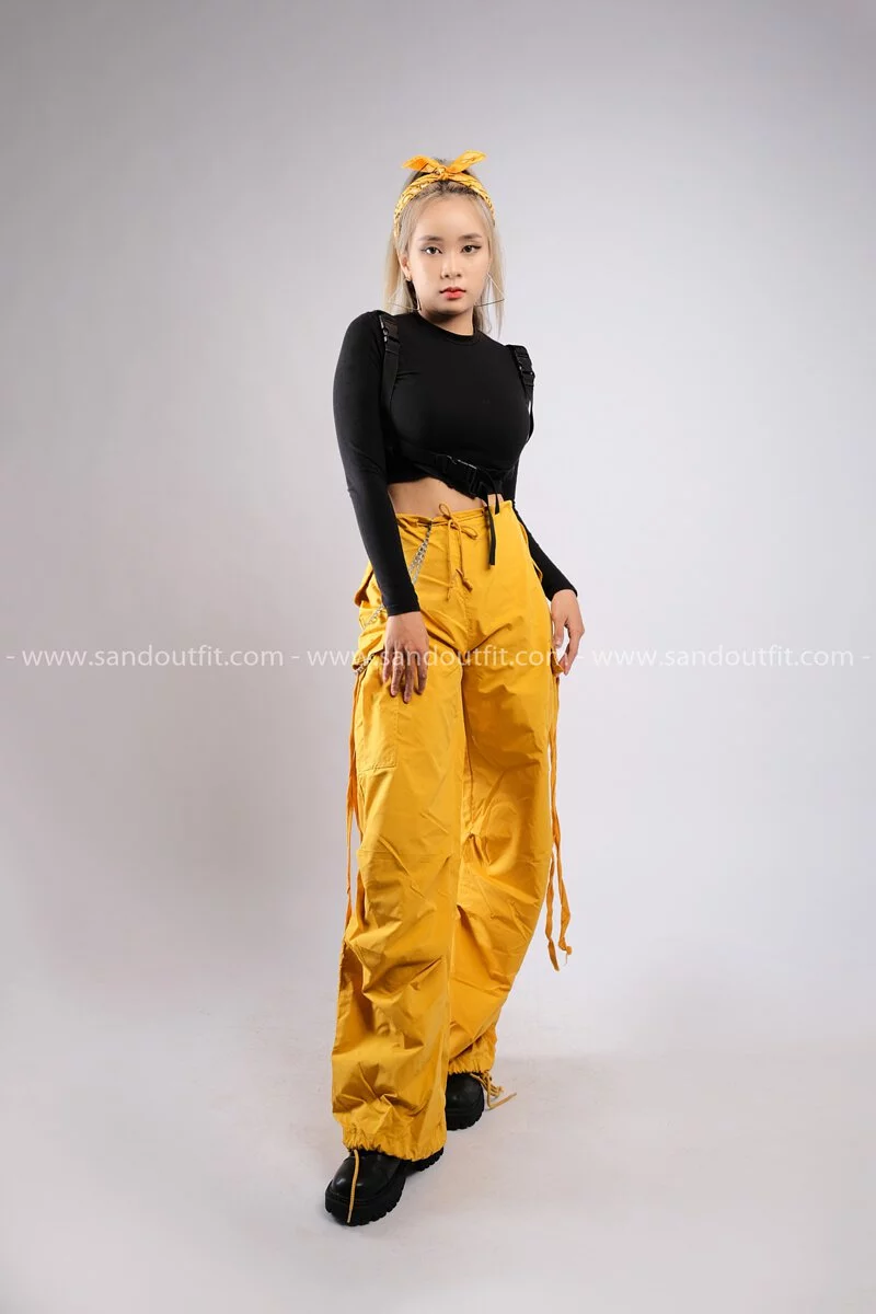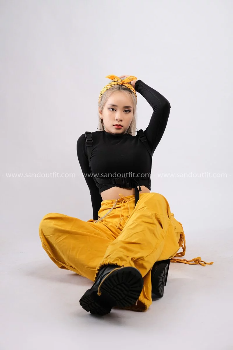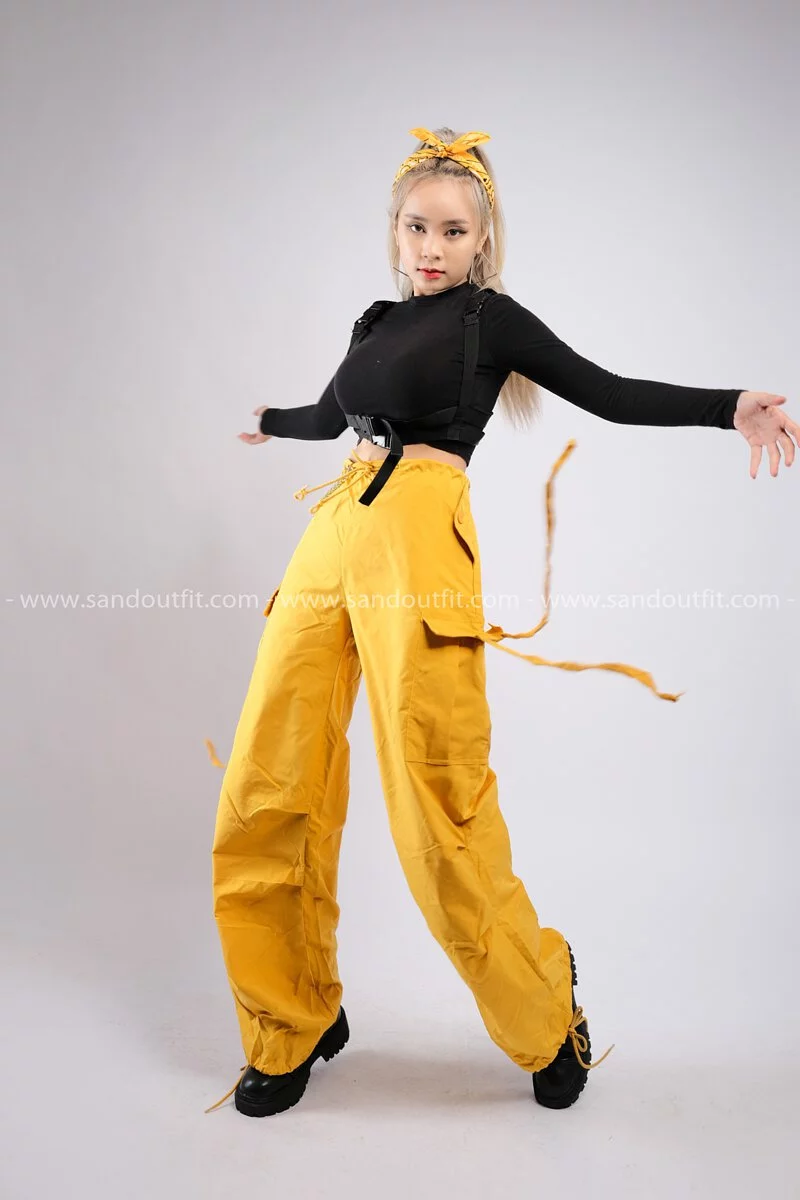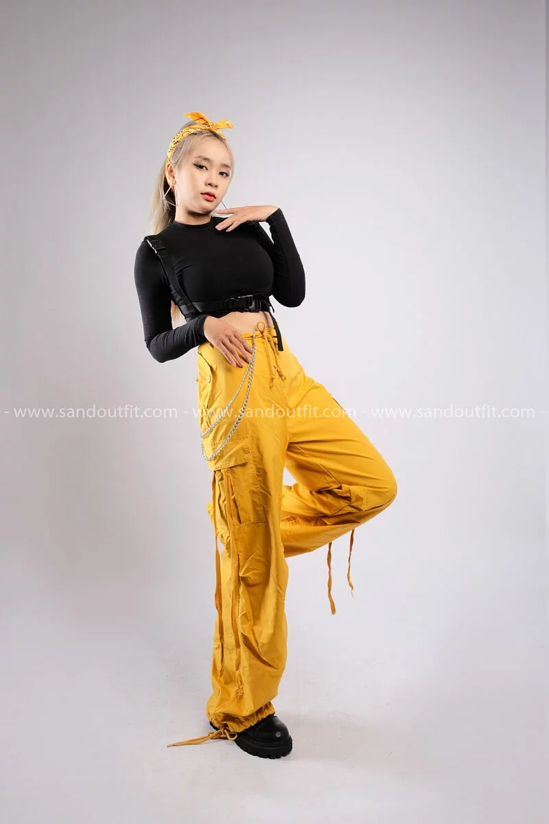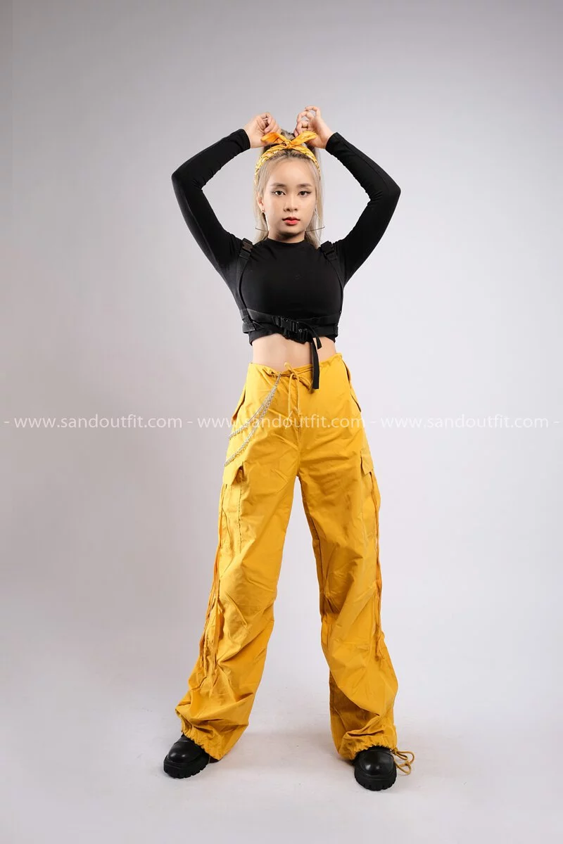 Outfit Phối Sẵn - (HQN0301 Quần Dài Vàng Nắp Túi Hộp Ngang Phối Dây phối Áo Croptop Đen Dài Tay)