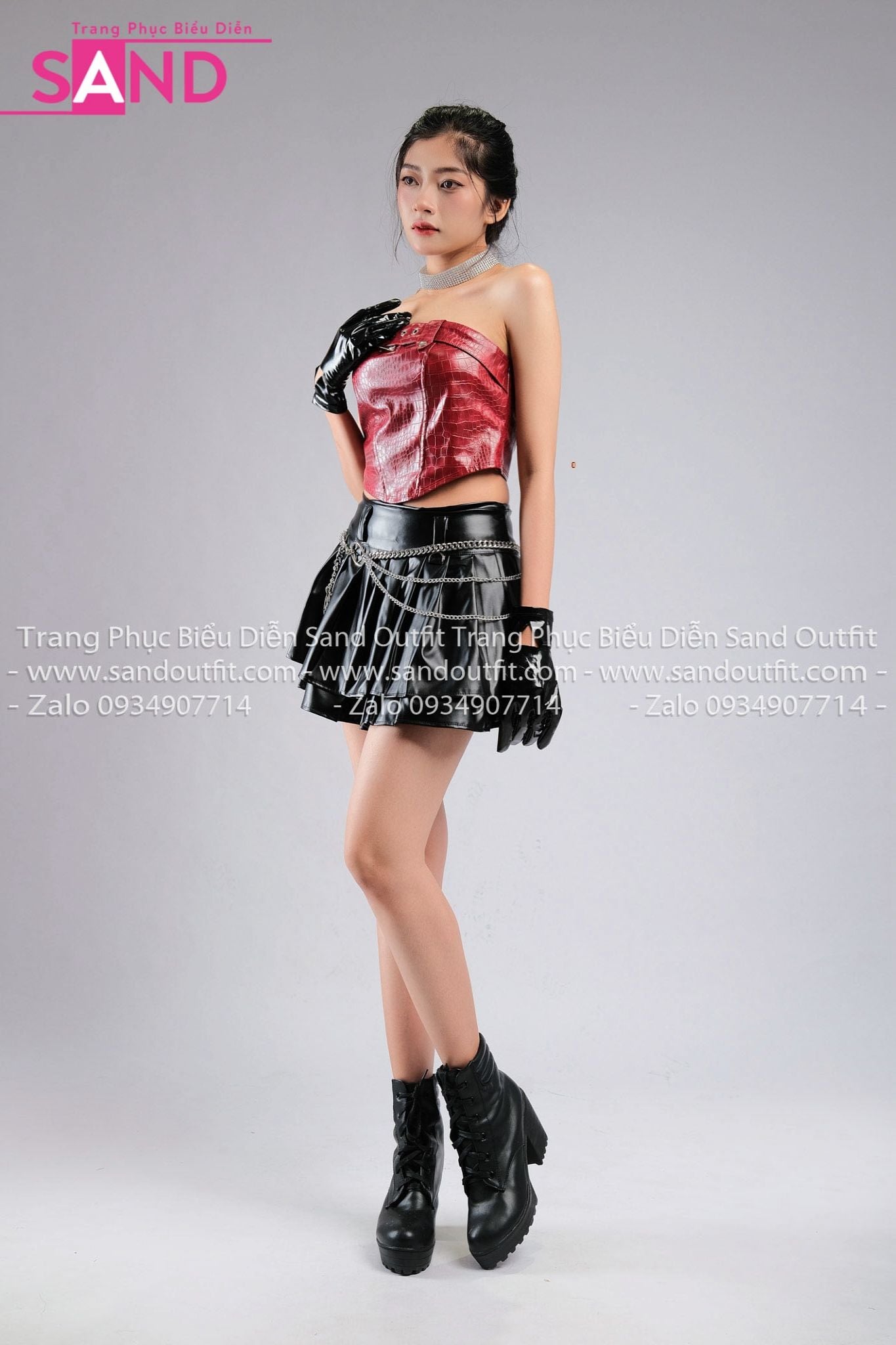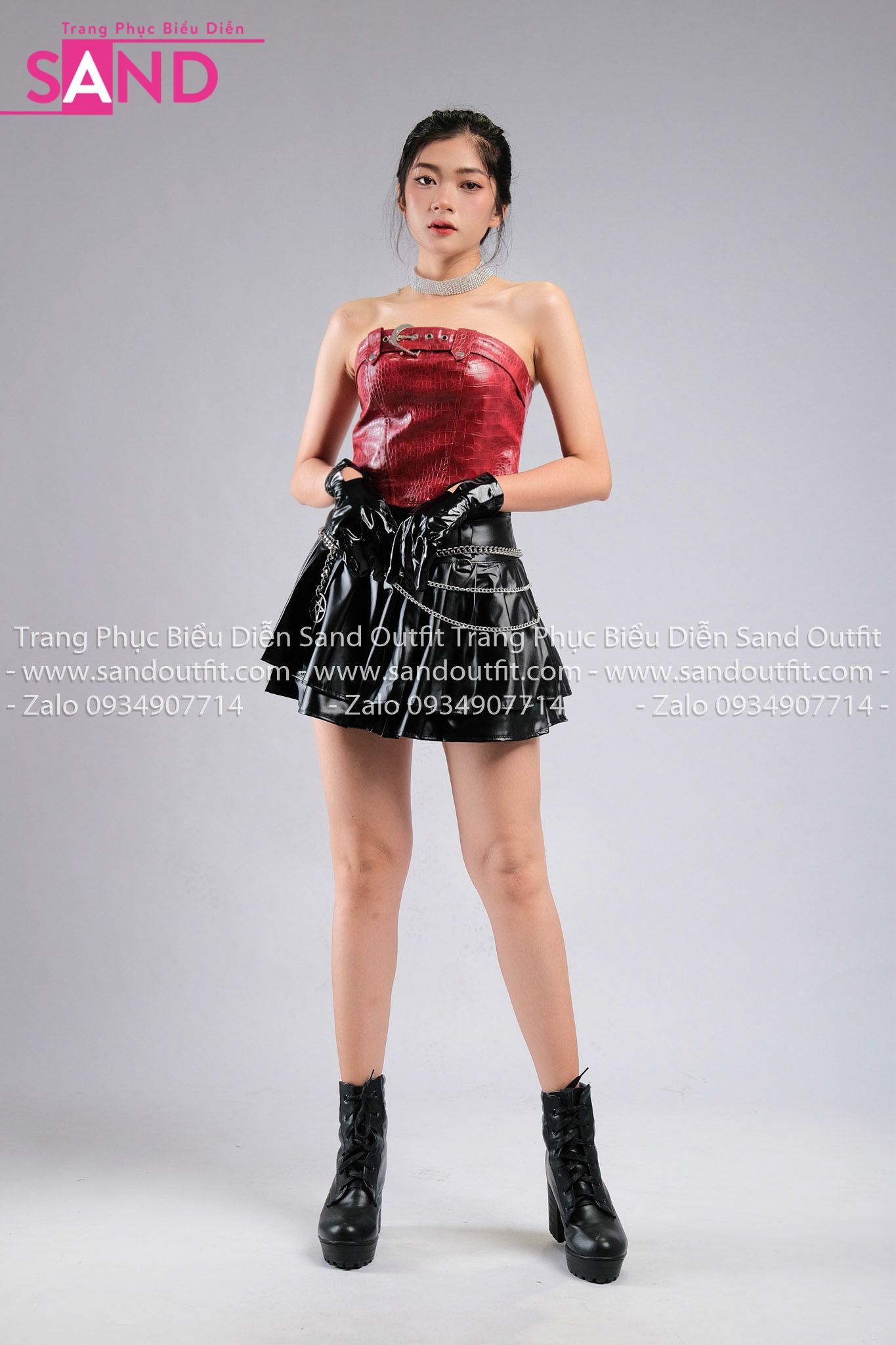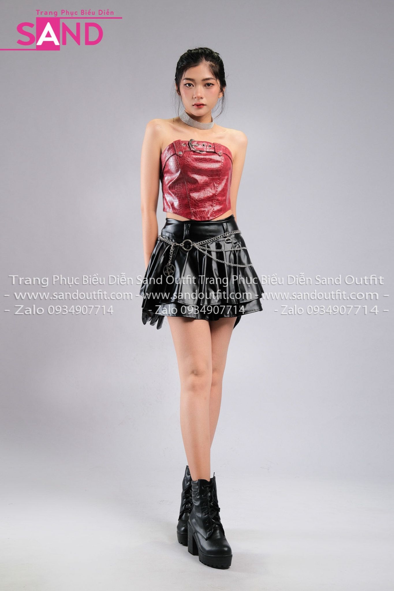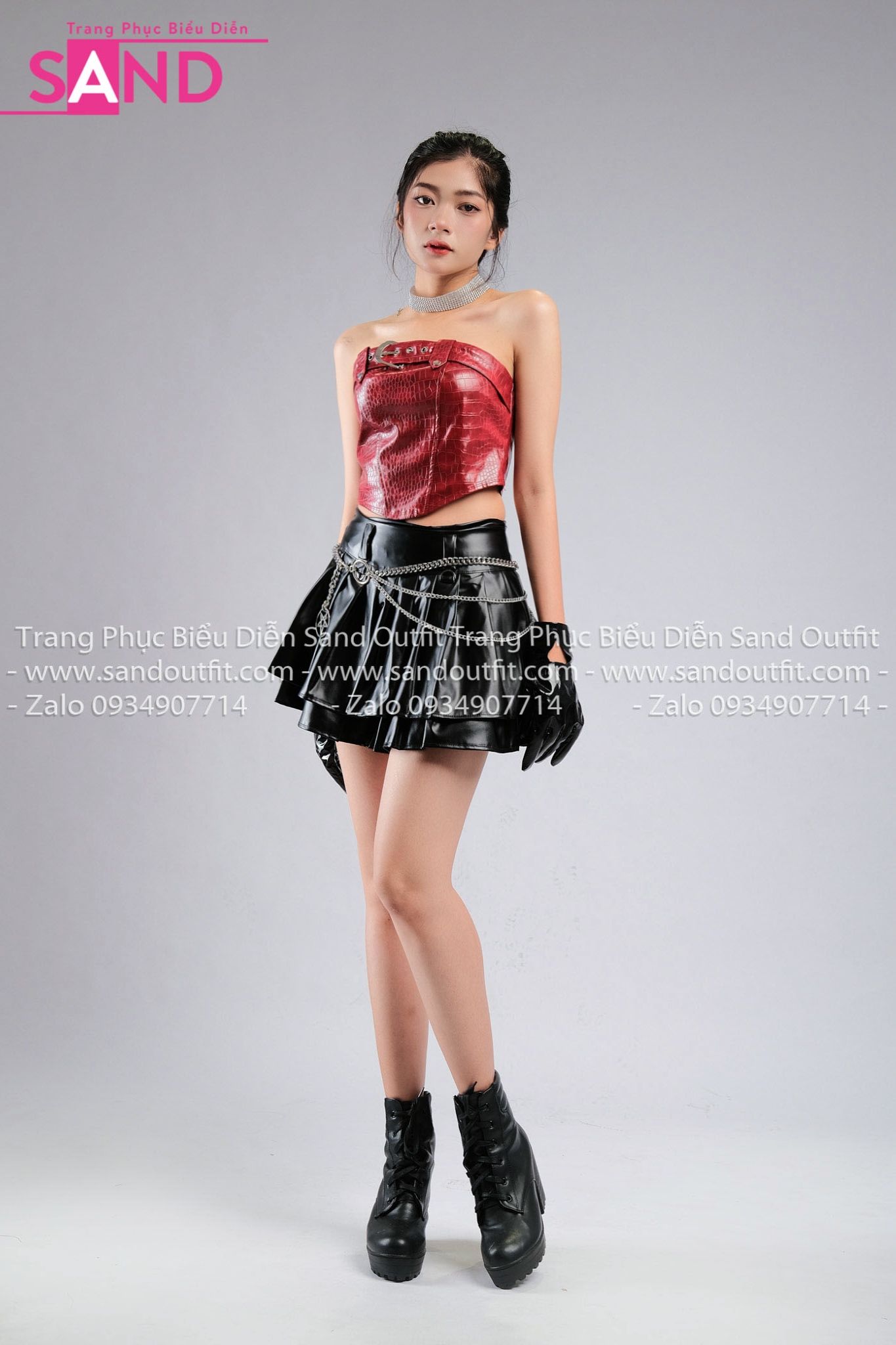 Outfit Phối Sẵn - ( HVV0101 Váy Xếp Li 2 Tầng Khoen Màu Đen phối HAD0401 Áo Ống Da Croptop Phối Khoen Đỏ Da Cá Sấu)