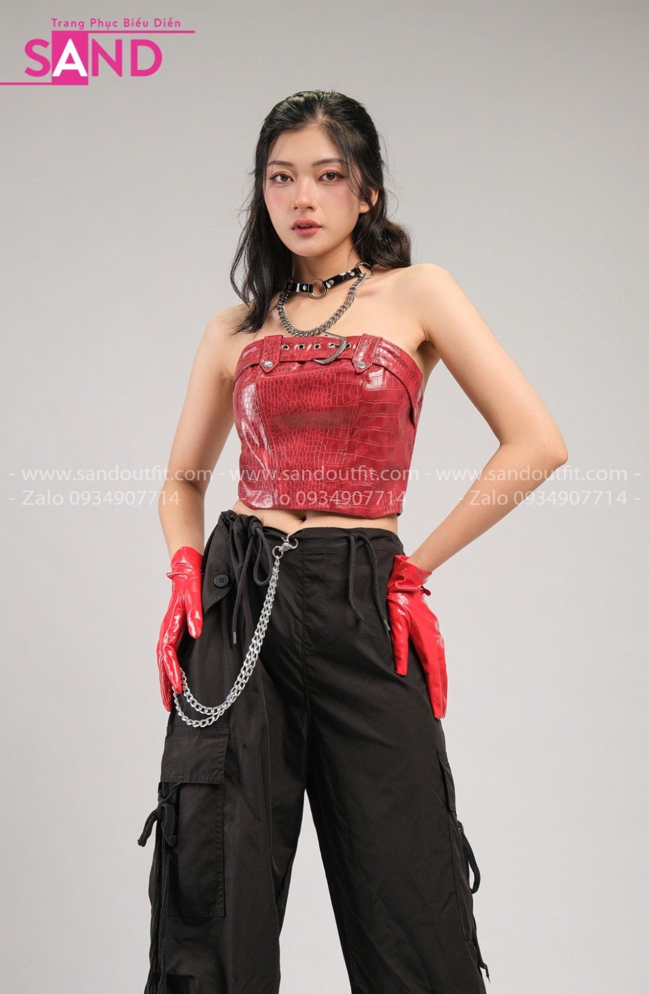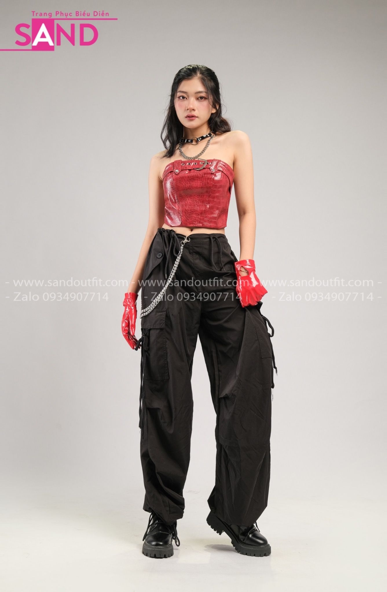 Outfit Phối Sẵn - (HQN0101 Quần Dài Đen Nắp Túi Hộp Ngang Phối Dây phối HAD0401 Áo Ống Da Croptop Phối Khoen Đỏ)