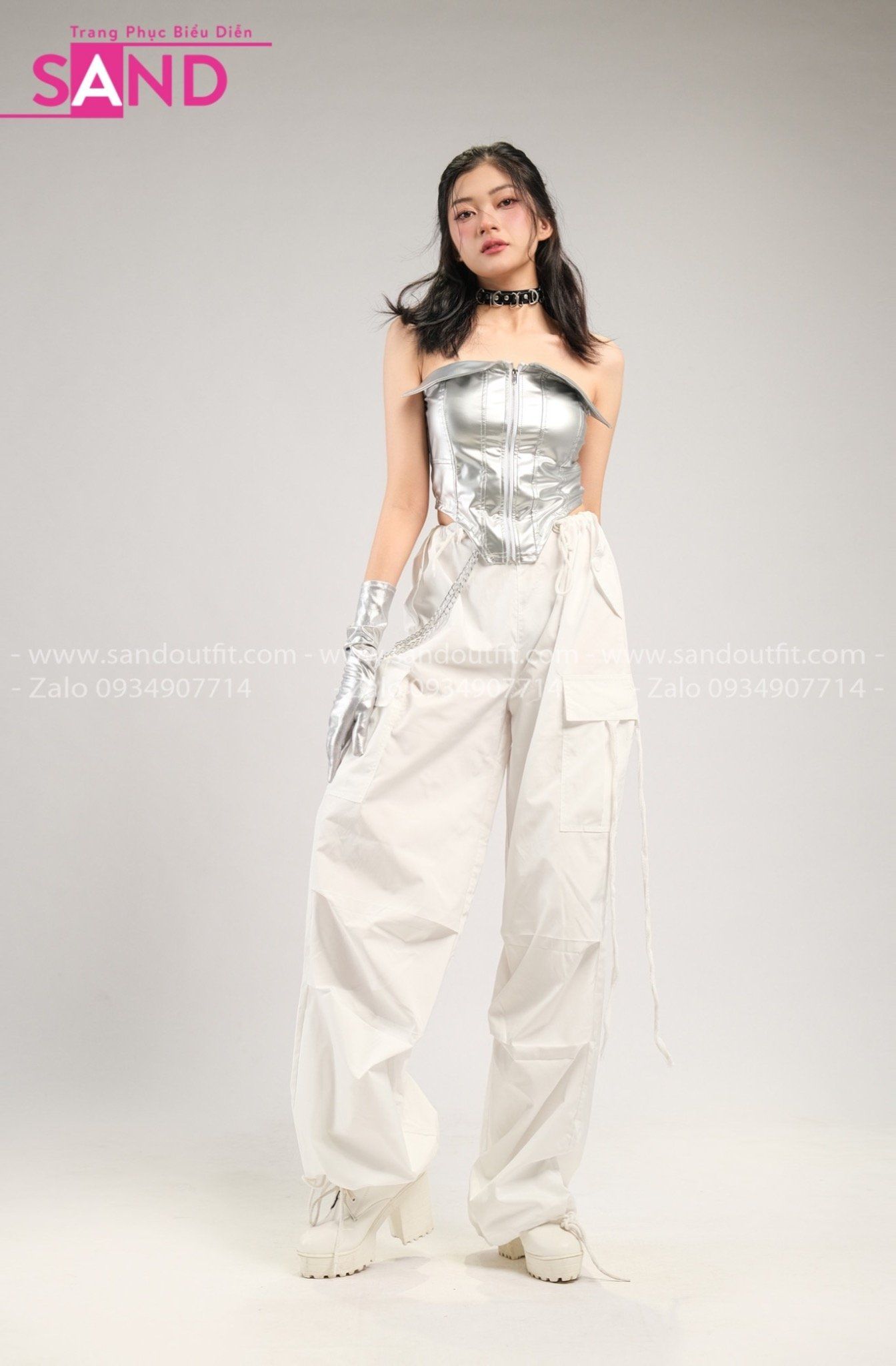 Outfit Phối Sẵn - (HQN0002 Quần Dài Trắng Nắp Túi Hộp Ngang Phối Dây phối HAD0201 Áo Ống Croptop Da Bạc Khóa Kéo)