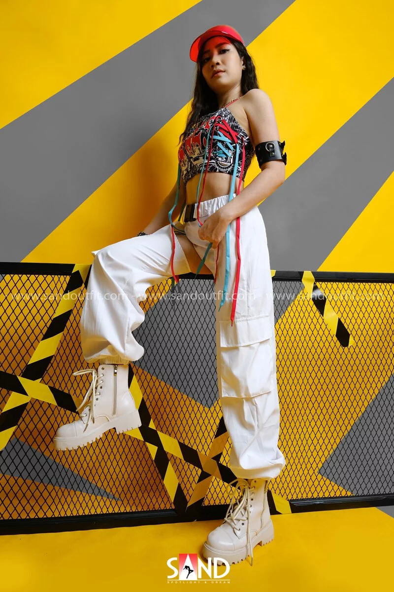 Set 3 món: Áo 2 dây crotpop họa tiết độc đáo phồi dây cột hông kèm Quần jogger túi hộp trắng khoét đùi + short trắng