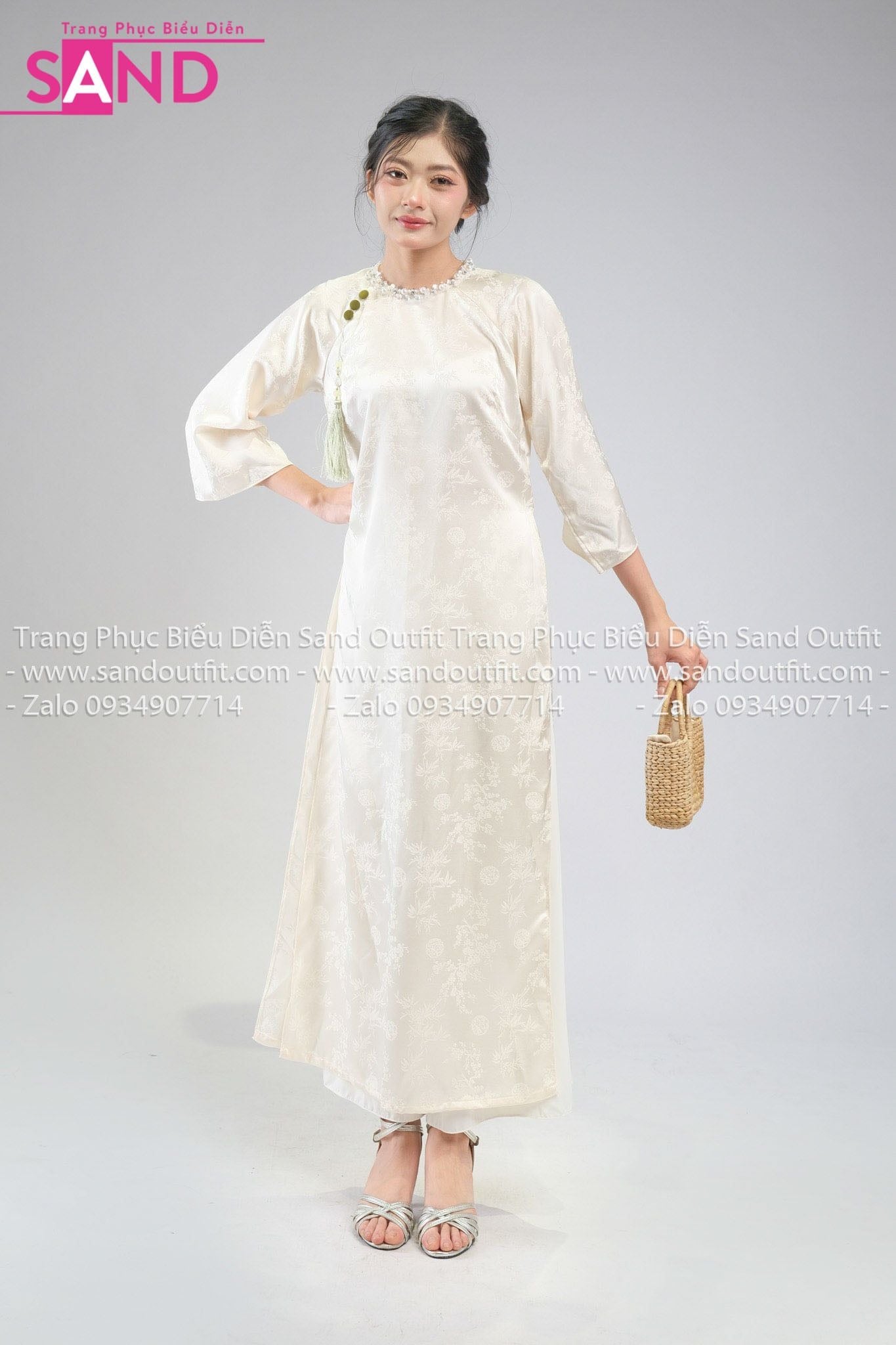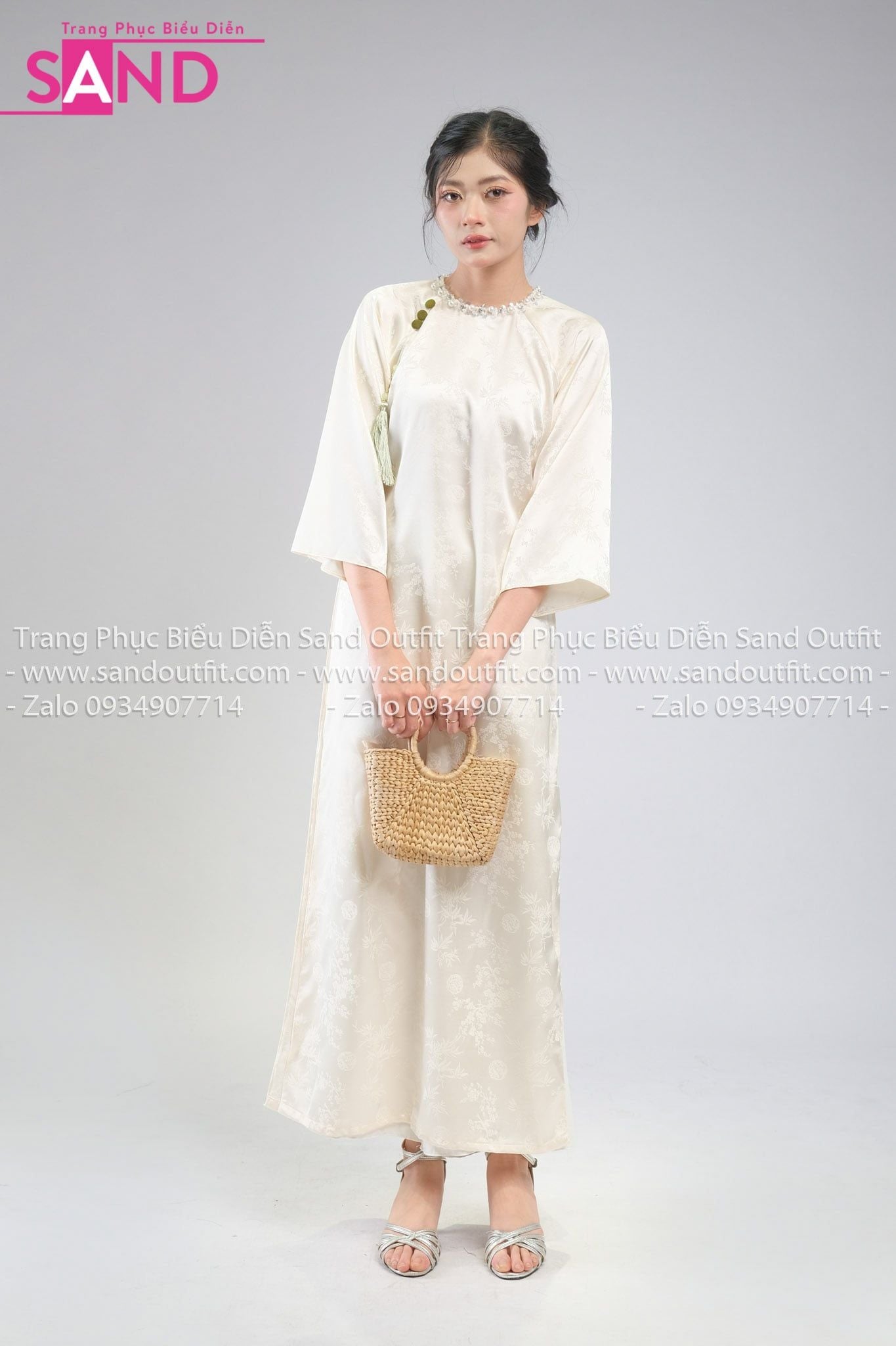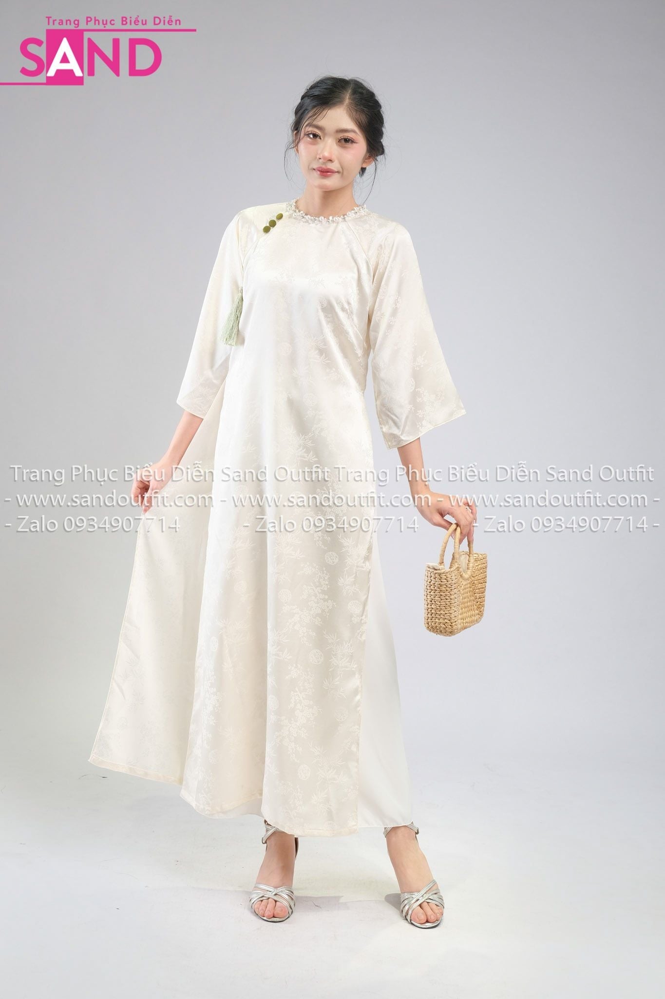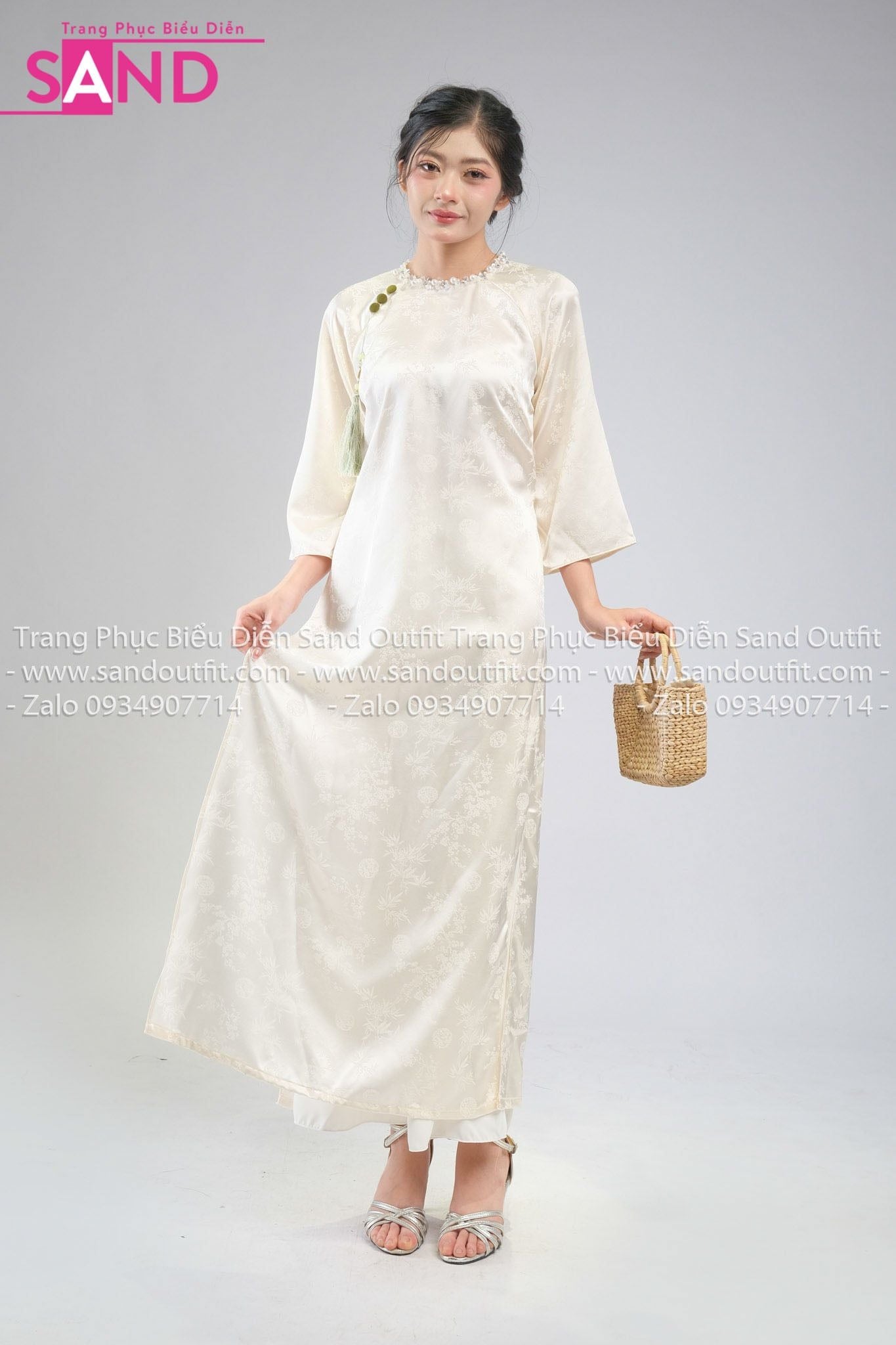 TAC1115 Áo Dài Nữ Vân Gấm Cổ Tròn Đính Đá - Kem