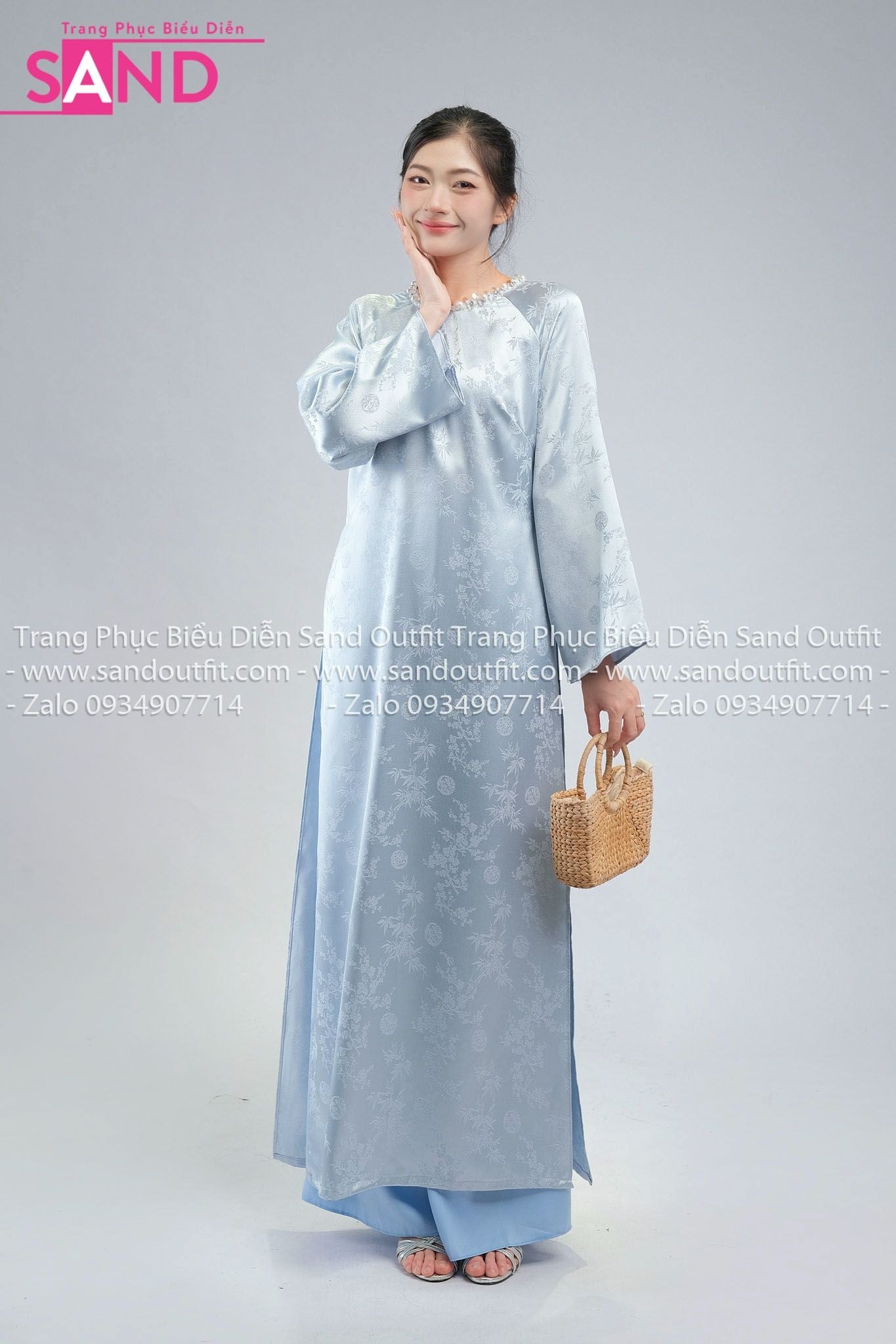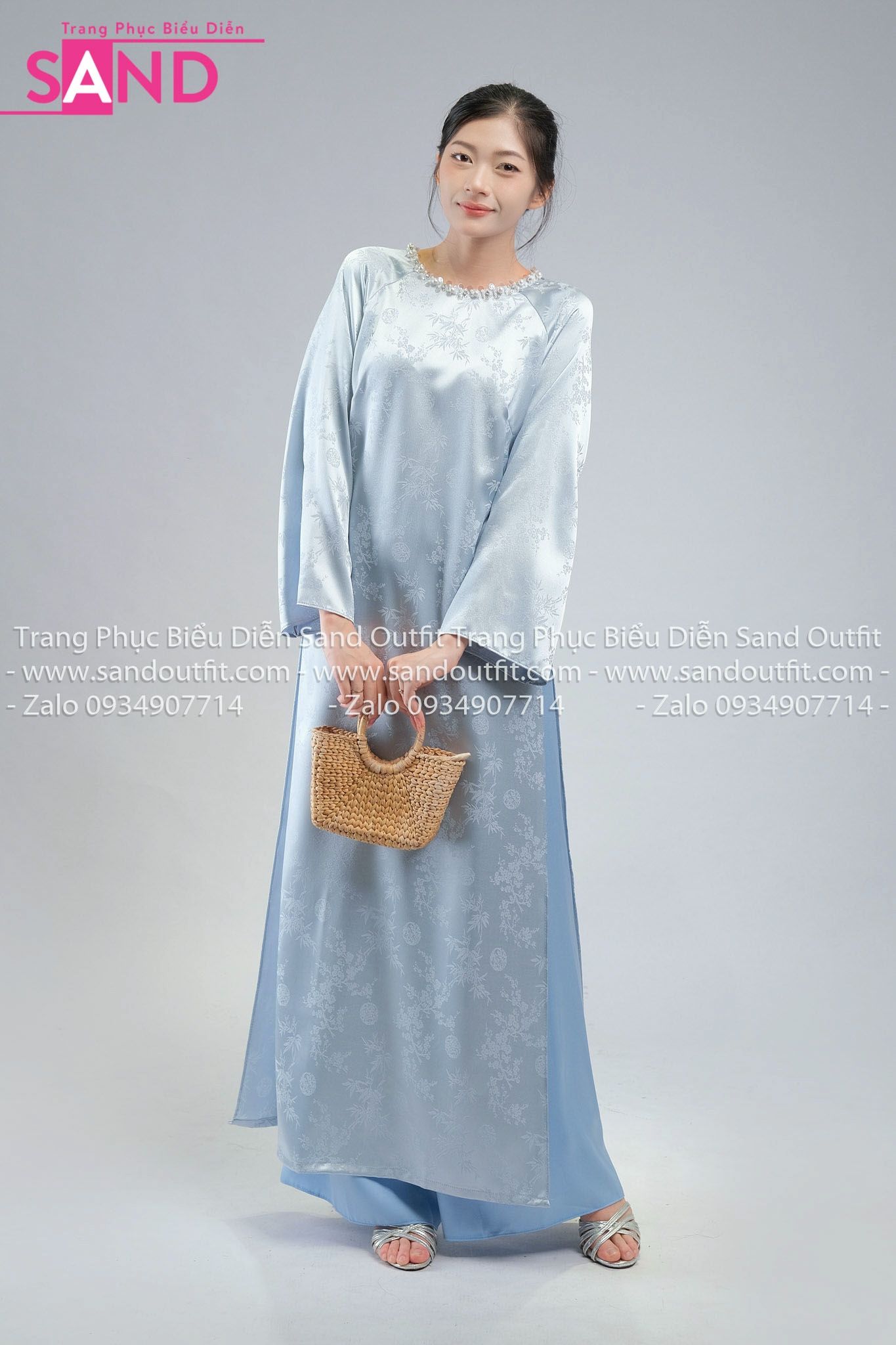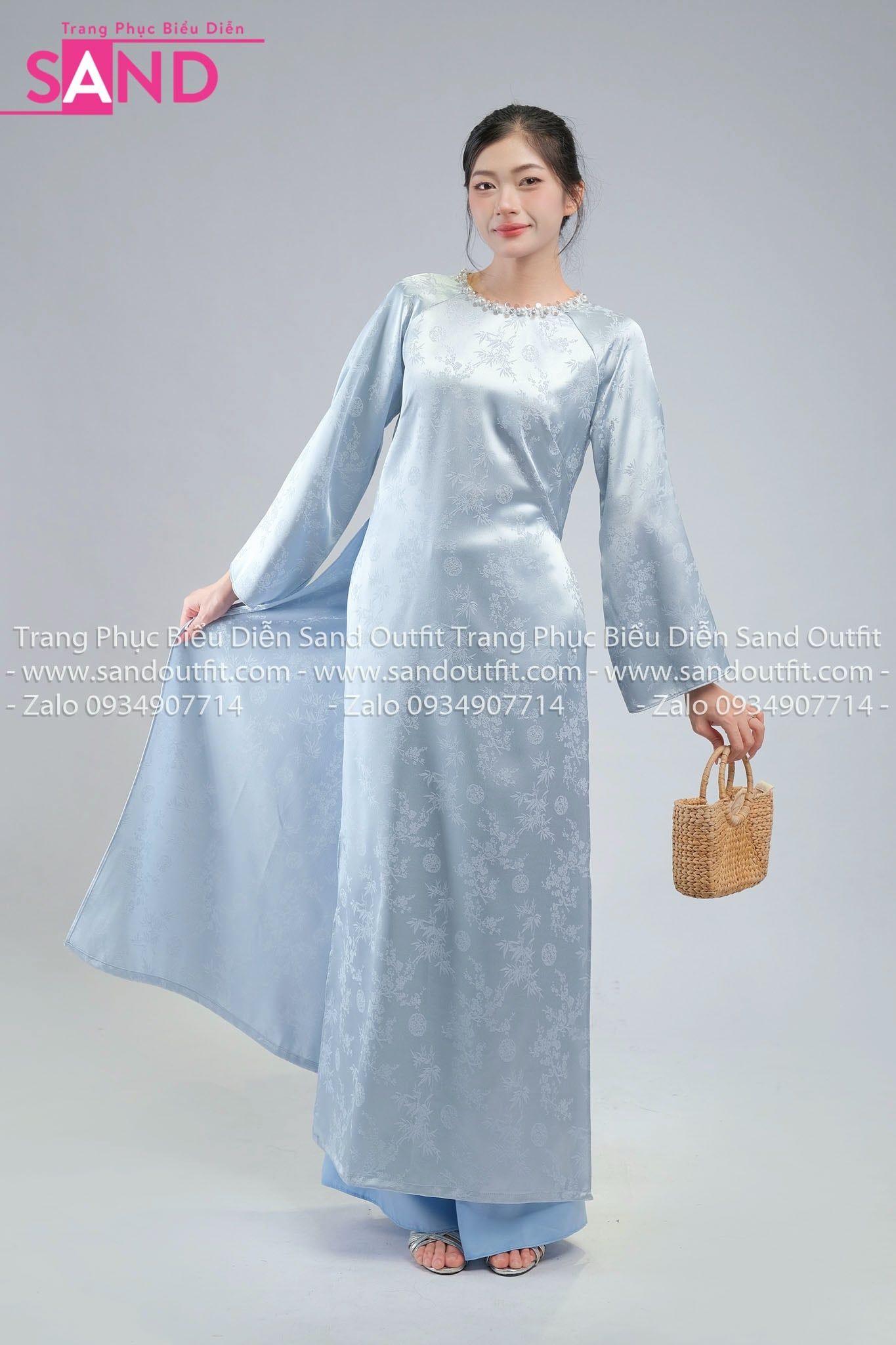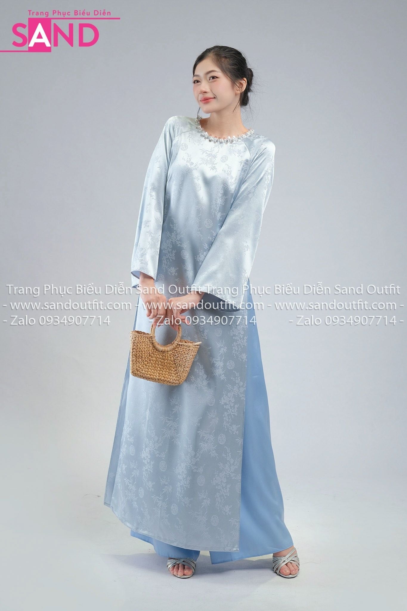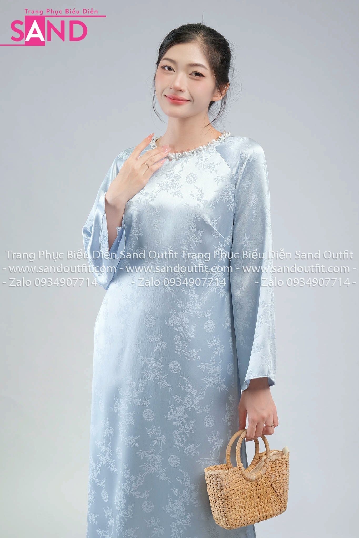 TAC0821 Áo Dài Nữ Vân Gấm Cổ Tròn Đính Đá - Xanh Nhạt