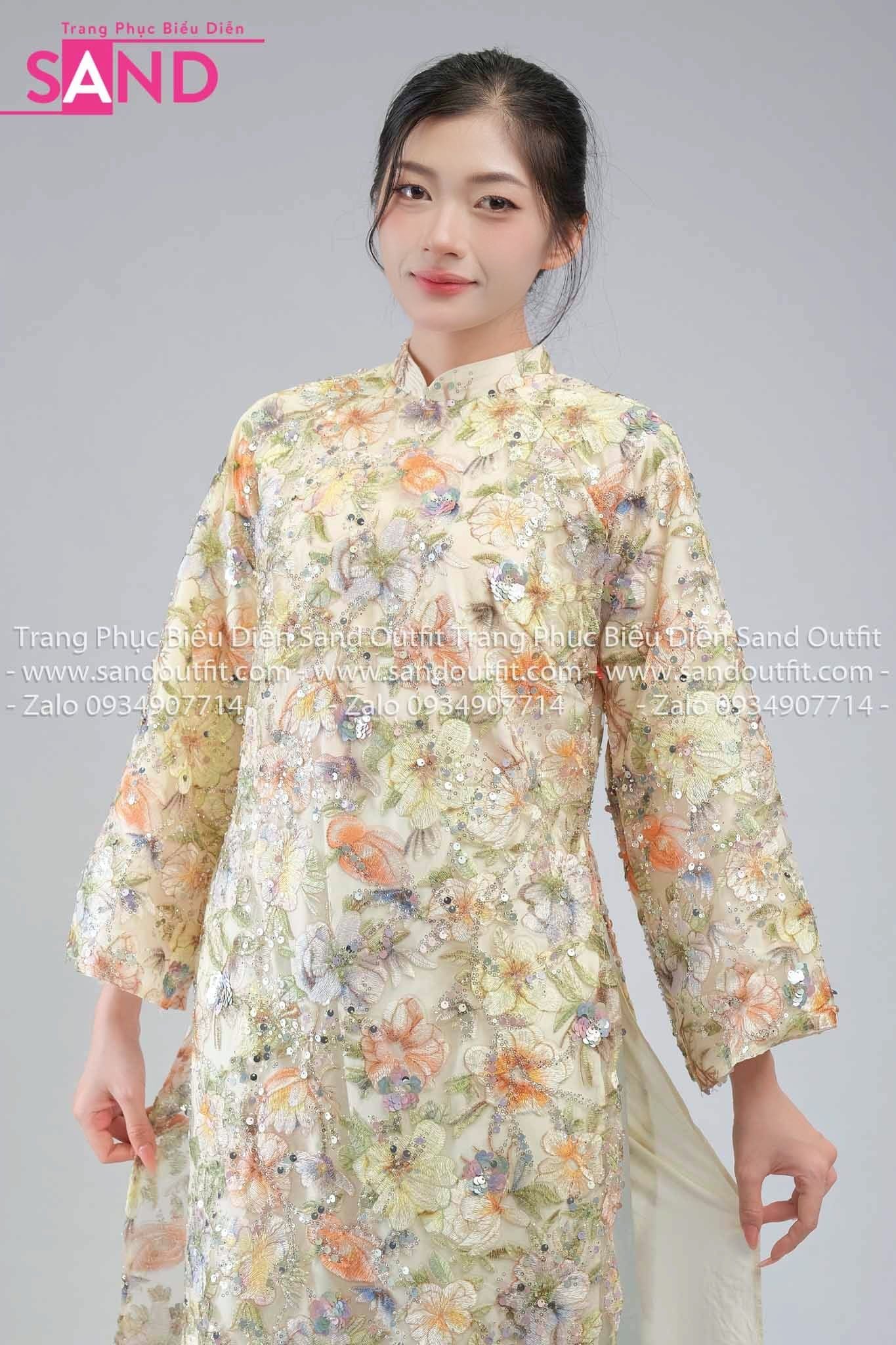 TAC1108 Áo Dài Nữ Cách Tân Hoạ Tiết Thêu Kim Sa Đính Đá 4 Tà - Màu Kem
